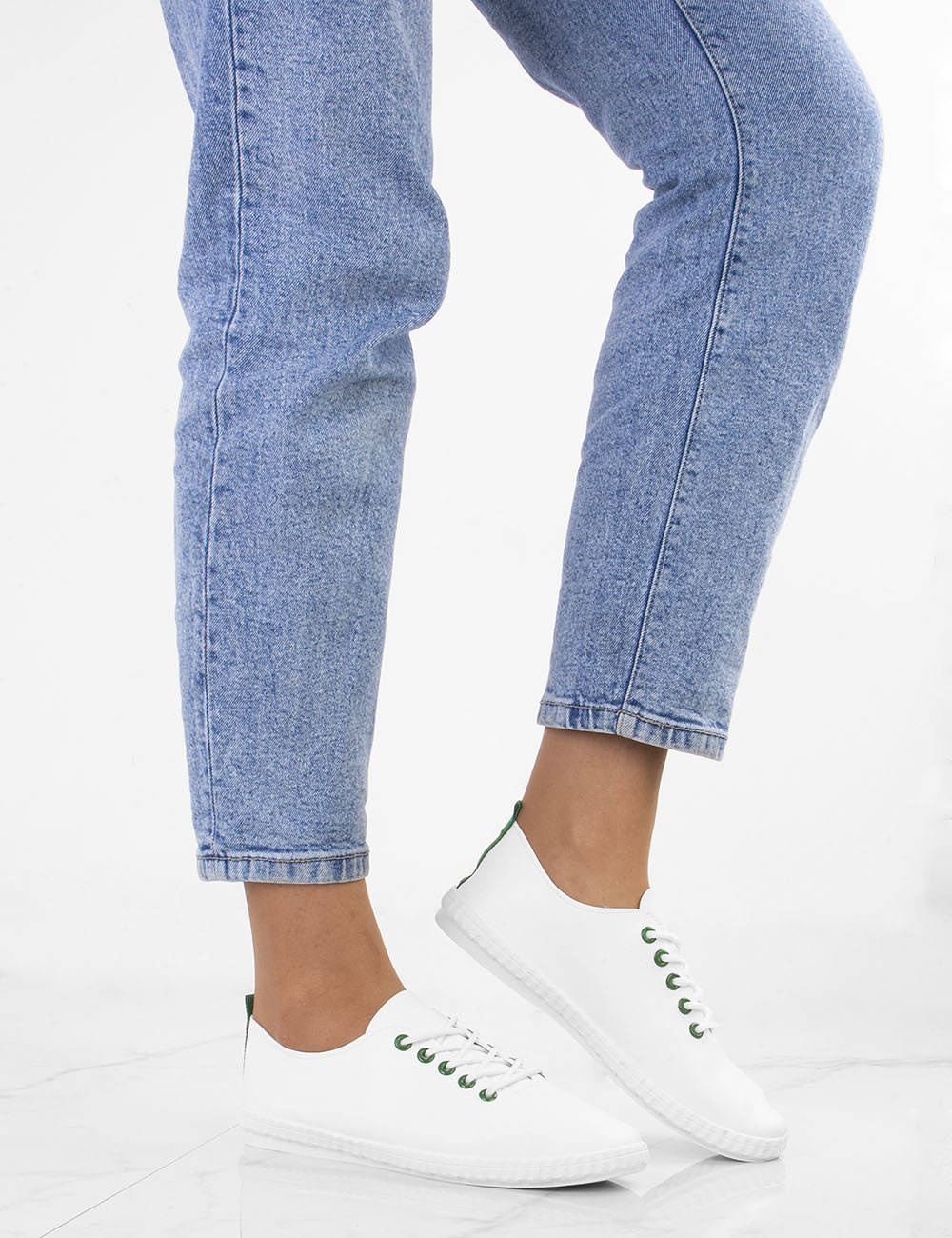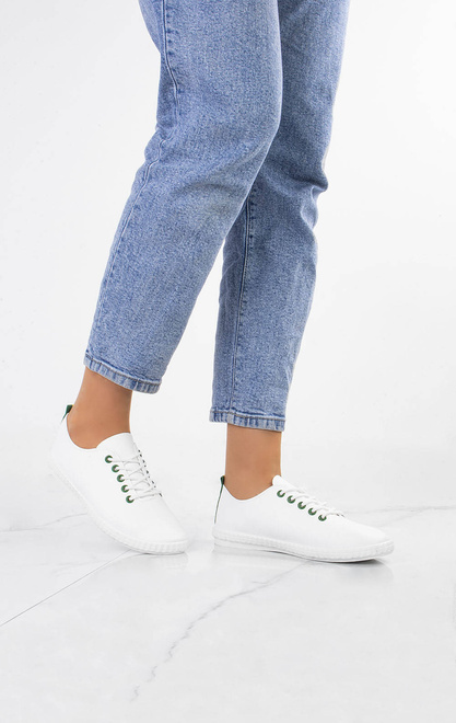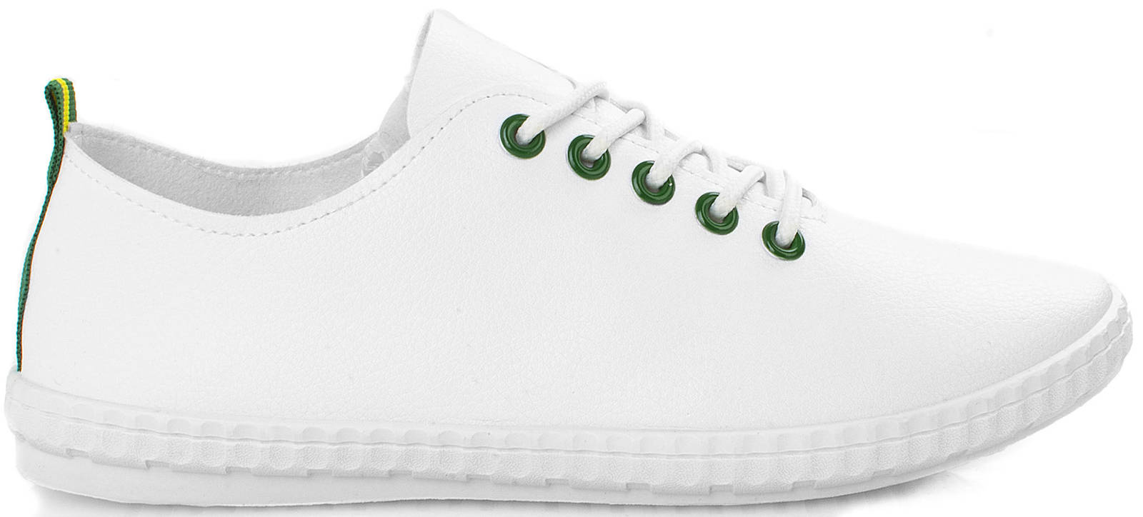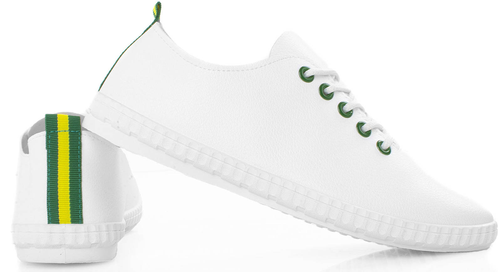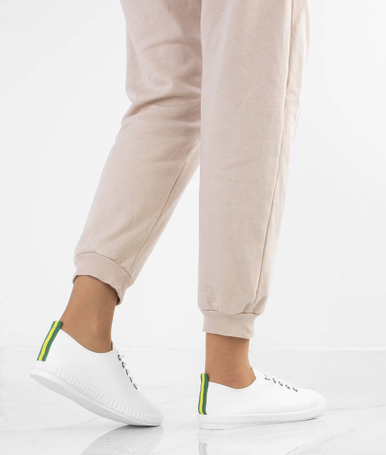 • Białe, niskie i tenisówki damskie, wykonane z miękkiej i wysokiej jakości ekoskóry. Trampki z żółtym i zielonym akcentem. Idealne na letnie spacery.