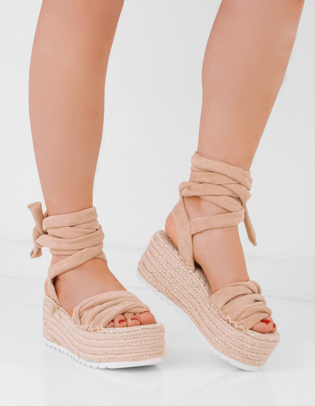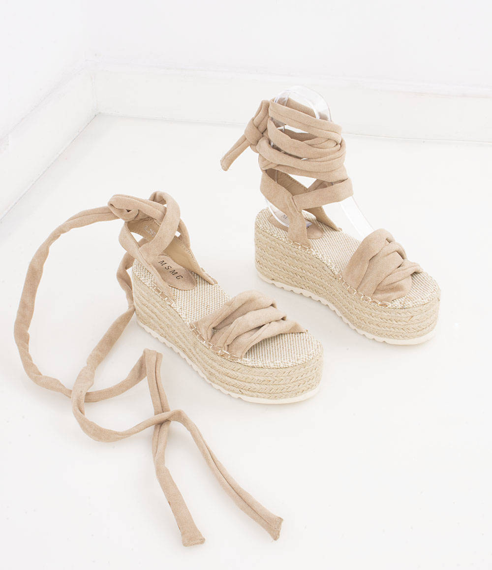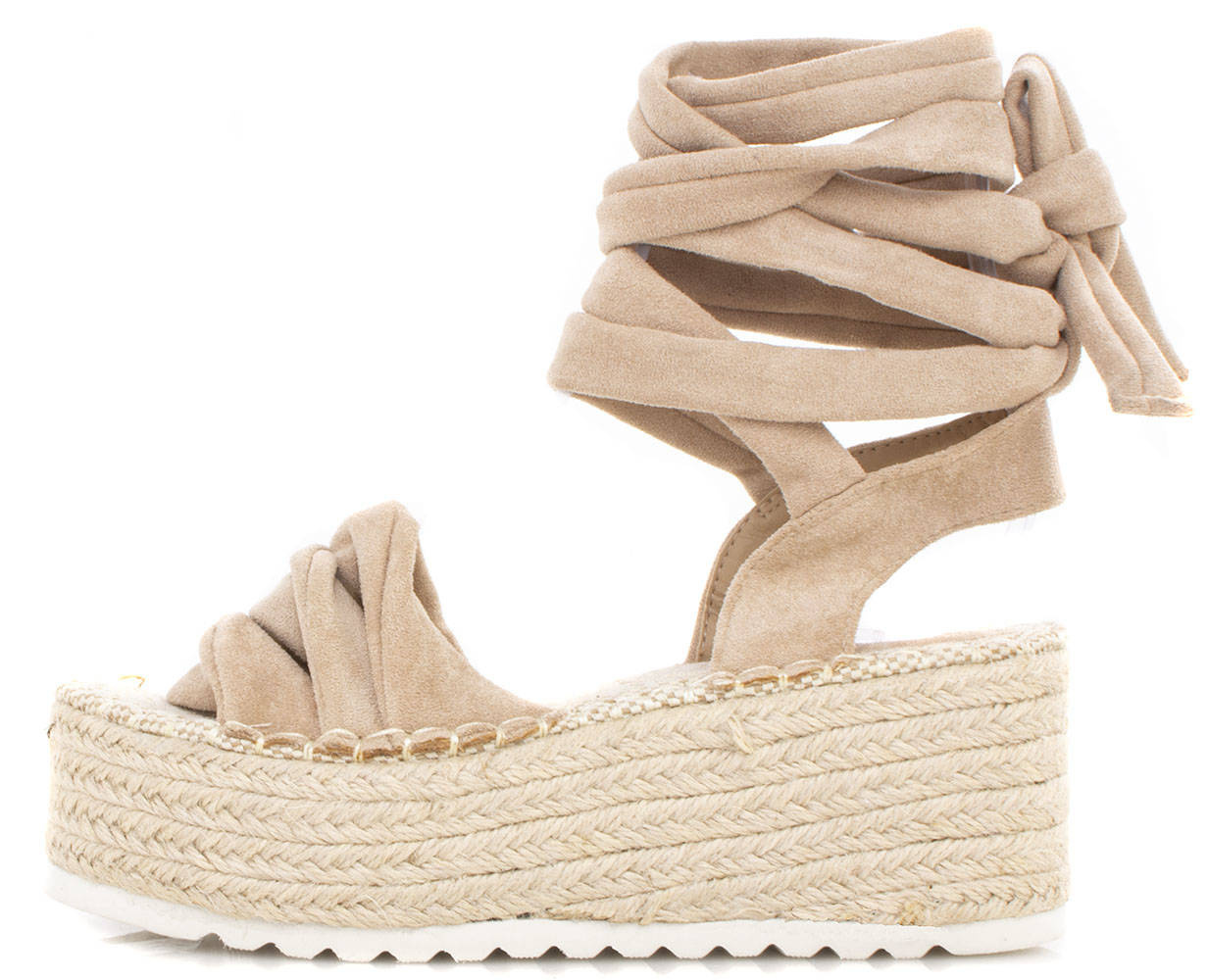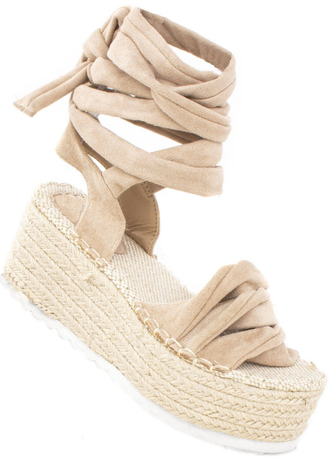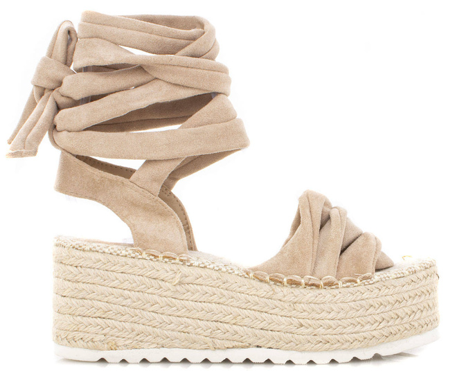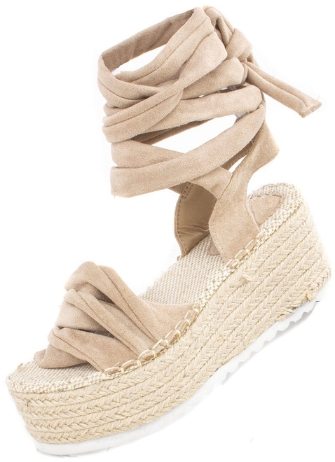 Stylowe sandały espadryle damskie wykonane z połączenia zamszu i plecionego sznurka jutowego wokół platformy. Model z odkrytą piętą oraz palcami. Espadryle na wygodnej platformie. Wiązane wokół nogi zamszowym sznurkiem. Idealne na nadchodzący sezon letni!