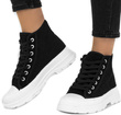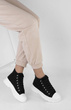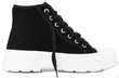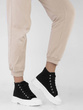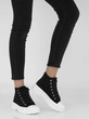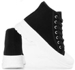 • Damskie wysokie buty sportowe a'la trampki. Wykonane z materiału typu sztruks. Trampki na grubszej, wygodnej podeszwie z platformą. Model ze sznurowaną cholewką, tkaninowa wkładka.