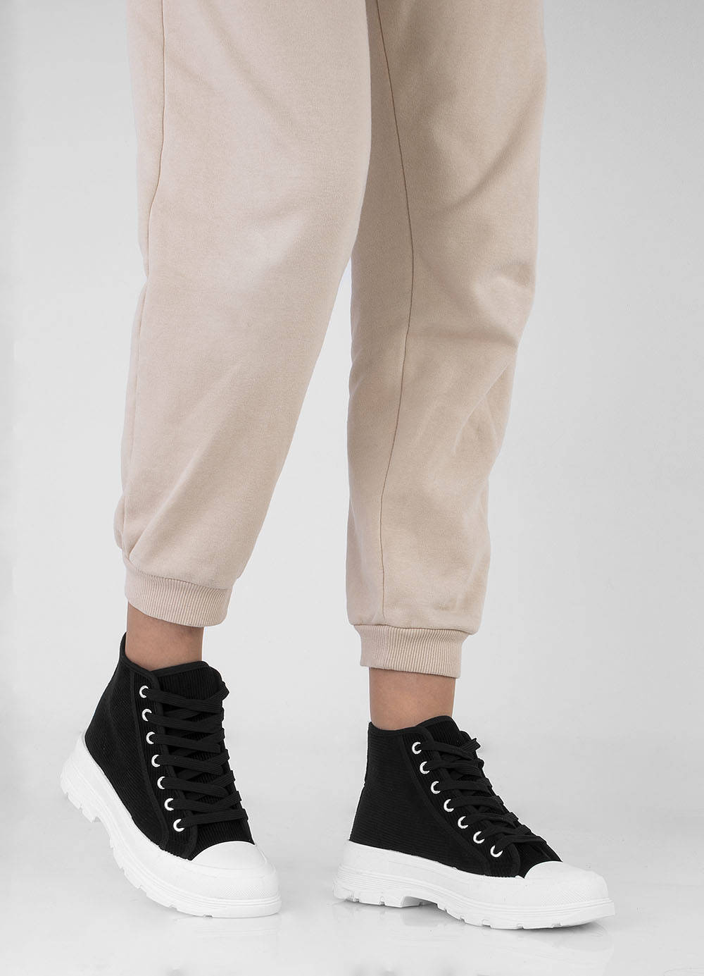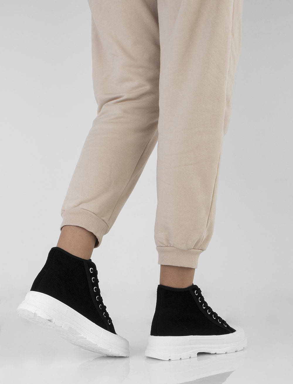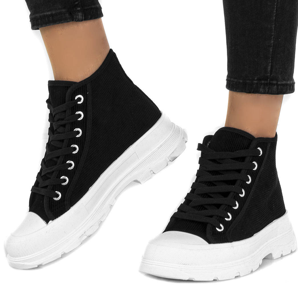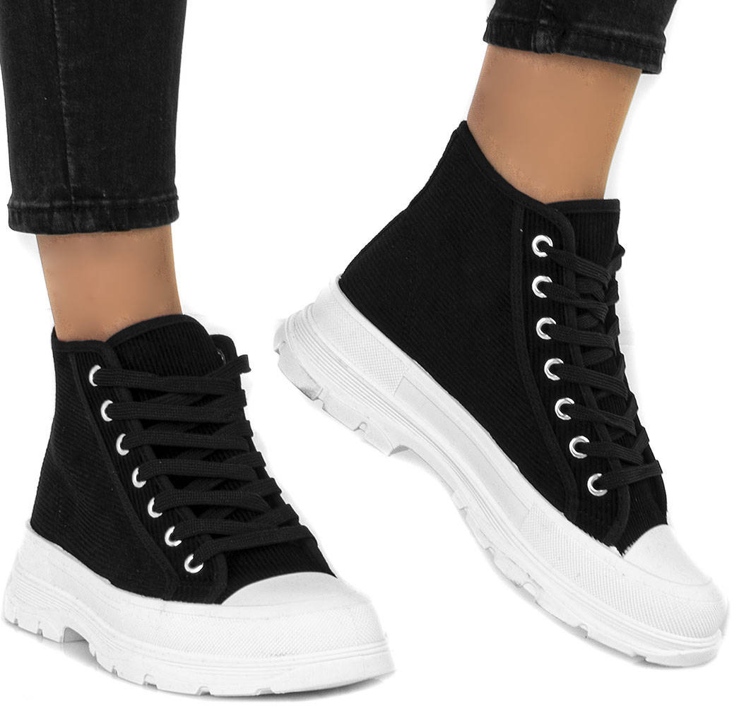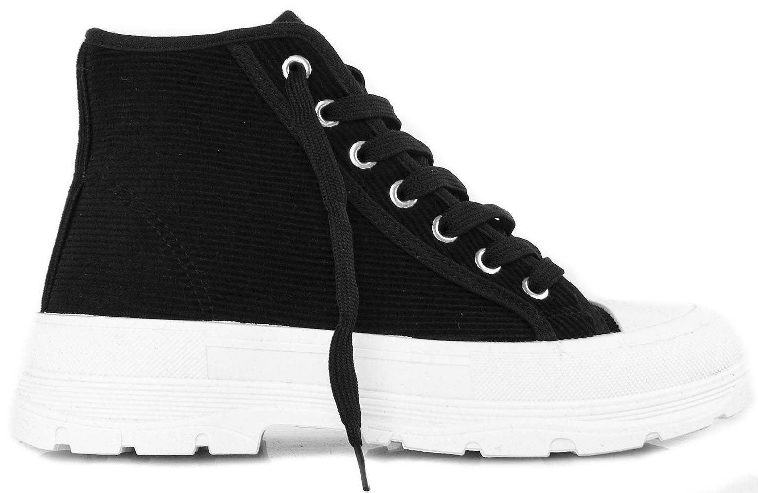 Damskie wysokie buty sportowe a'la trampki. Wykonane z materiału typu sztruks. Trampki na grubszej, wygodnej podeszwie z platformą. Model ze sznurowaną cholewką, tkaninowa wkładka.