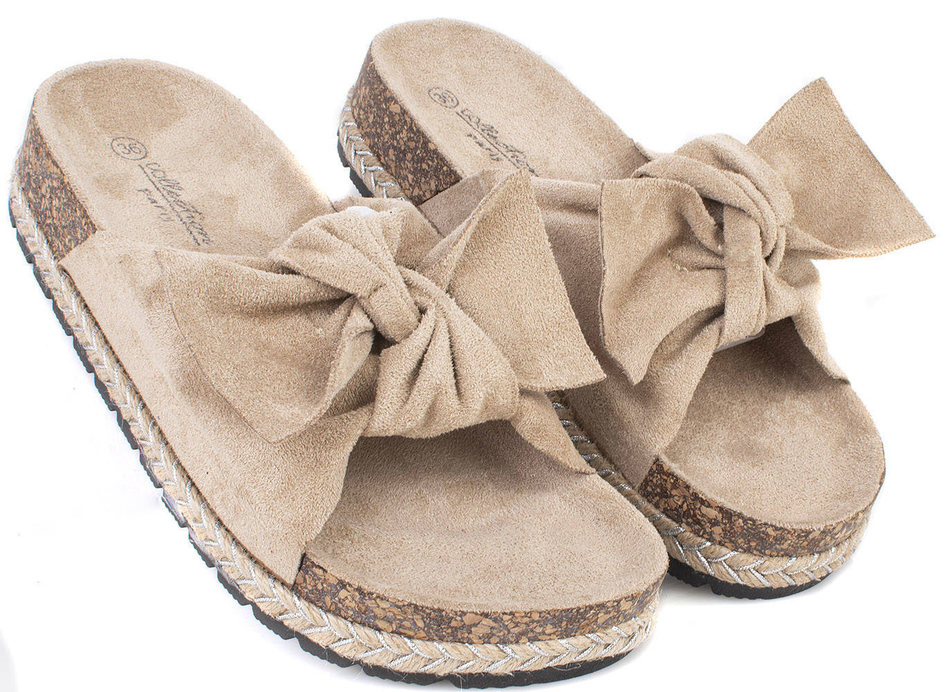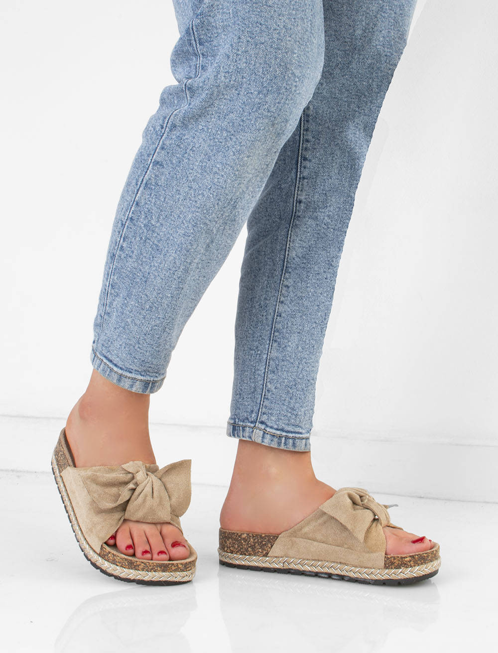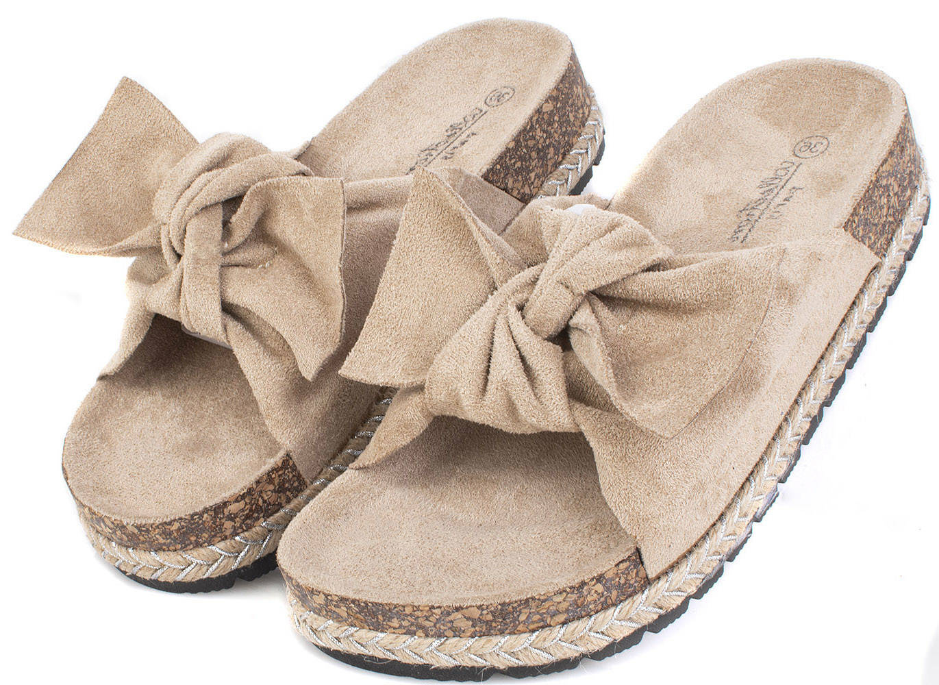 BEŻOWE KLAPKI Z KOKARDĄ NA PLATFORMIE MULES