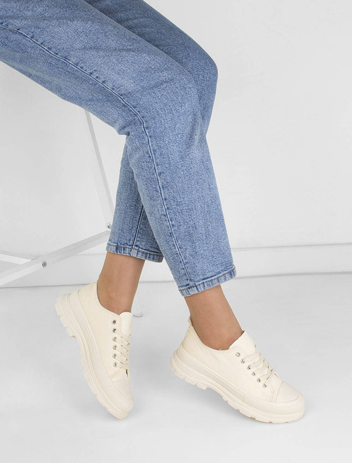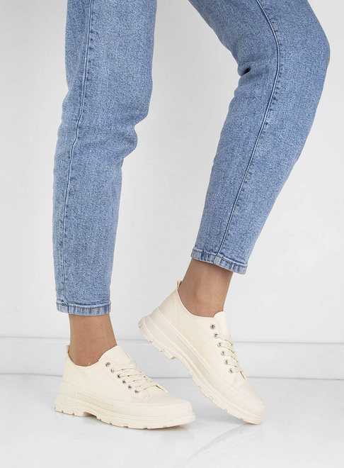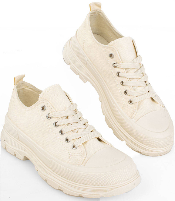 Damskie niskie buty sportowe a'la trampki. Wykonane z materiału tkaninowego. Na grubszej, wygodnej podeszwie z platformą. Model ze sznurowaną cholewką, tkaninowa wkładka. Must have Twoich stylizacji!