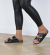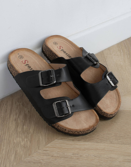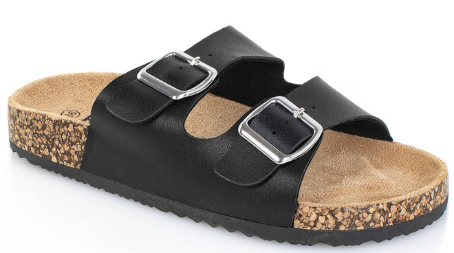Stylowe klapki z zamszową wkładką, podeszwa to połączenie tworzywa gumowego oraz korka. Paski wykonane ze skóry ekologicznej. Szerokość buta można regulować za pomocą dwóch klamr. Modne klapki z pewnością sprawdzą się w cieplejsze dni!