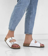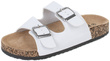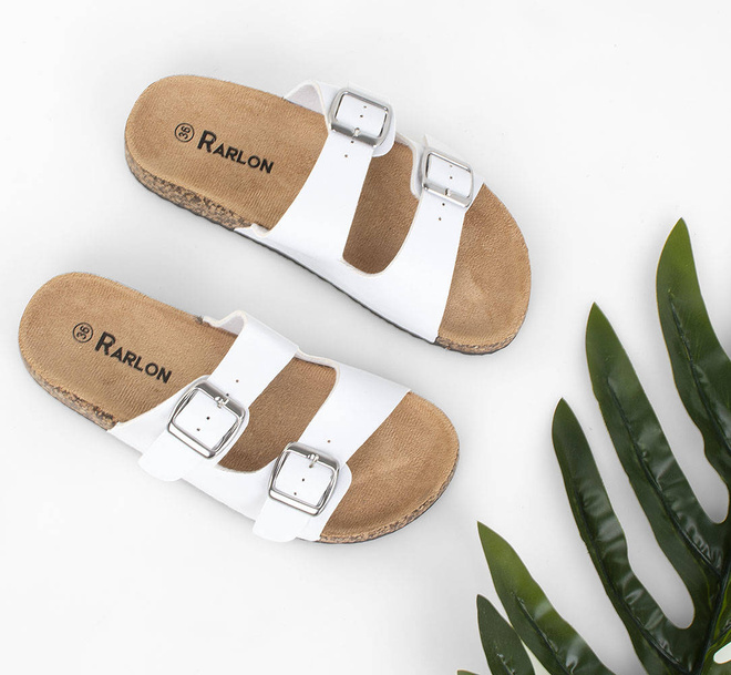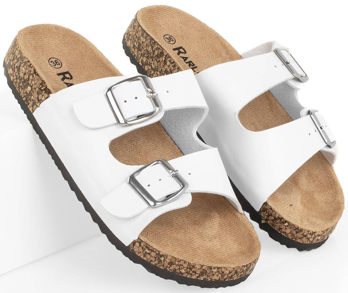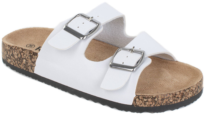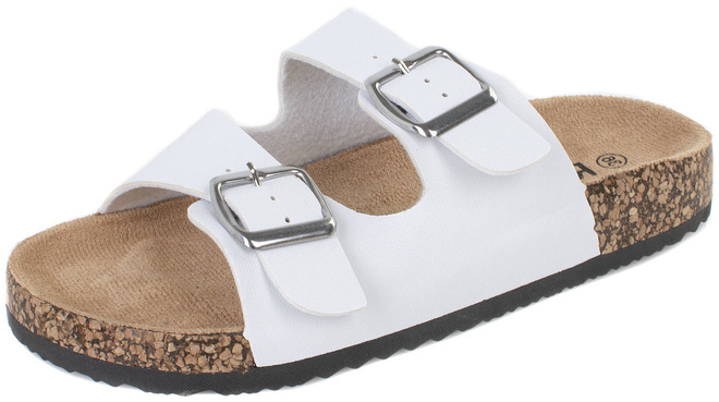 Stylowe klapki z zamszową wkładką, podeszwa to połączenie tworzywa gumowego oraz korka. Paski wykonane ze skóry ekologicznej. Szerokość buta można regulować za pomocą dwóch klamr. Modne klapki z pewnością sprawdzą się w cieplejsze dni!