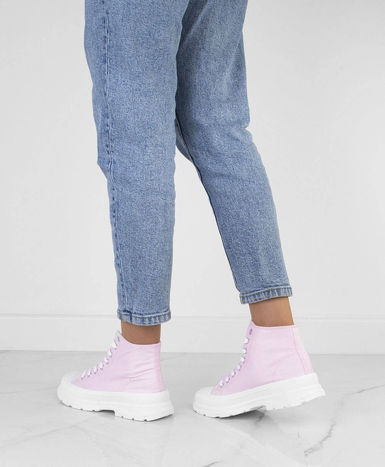 Damskie wysokie buty sportowe a'la trampki. Wykonane z materiału tkaninowego na grubszej, wygodnej podeszwie z platformą. Model ze sznurowaną cholewką, tkaninowa wkładka.