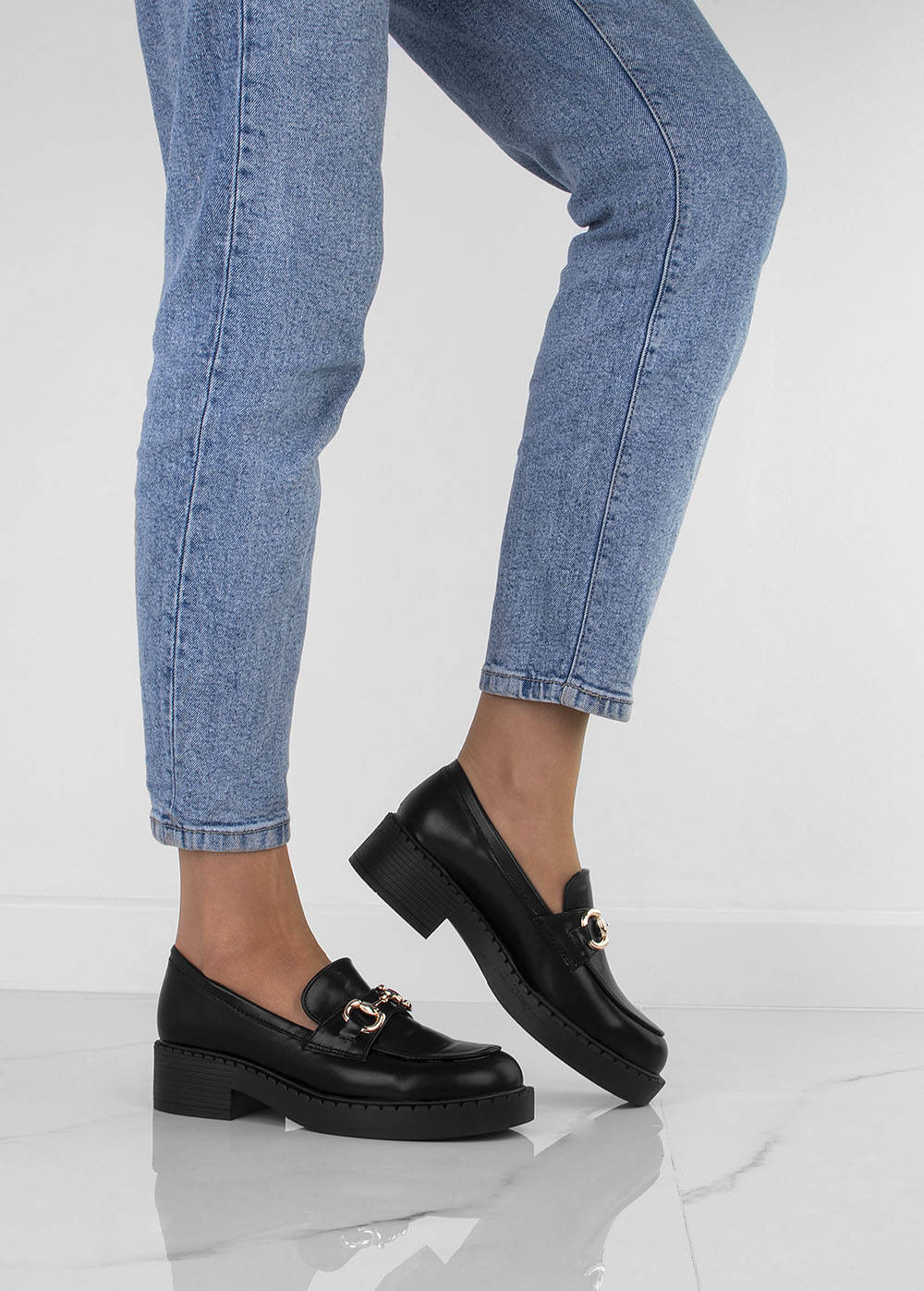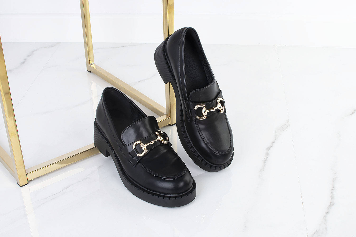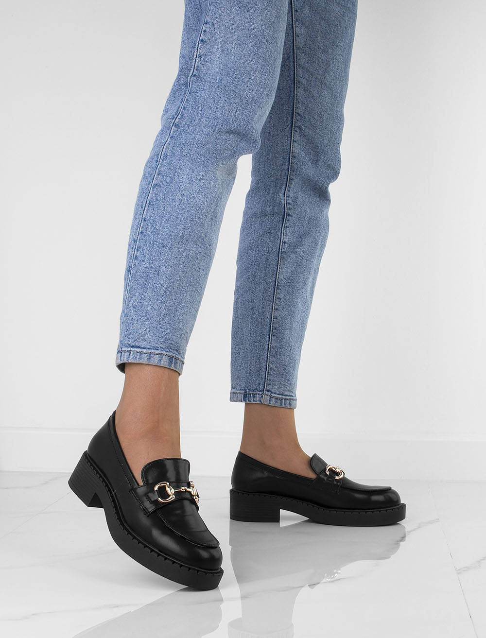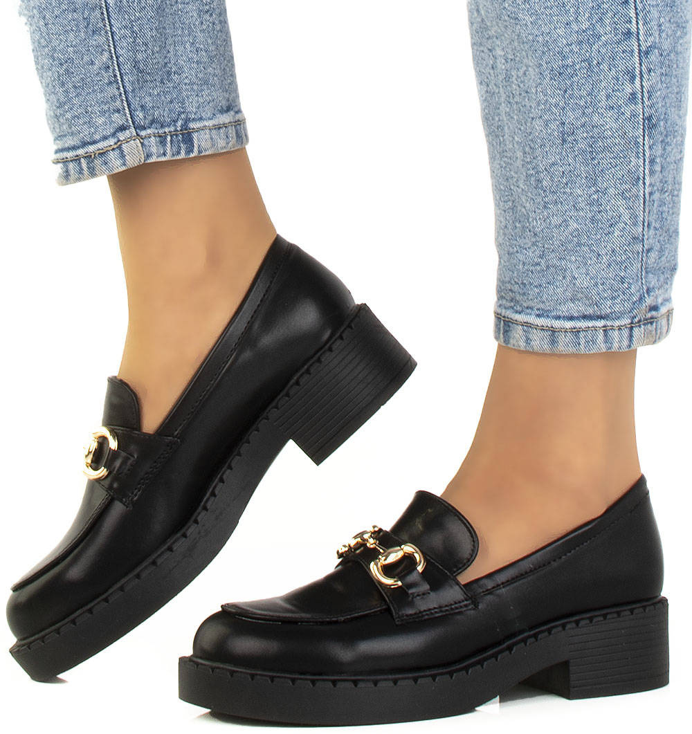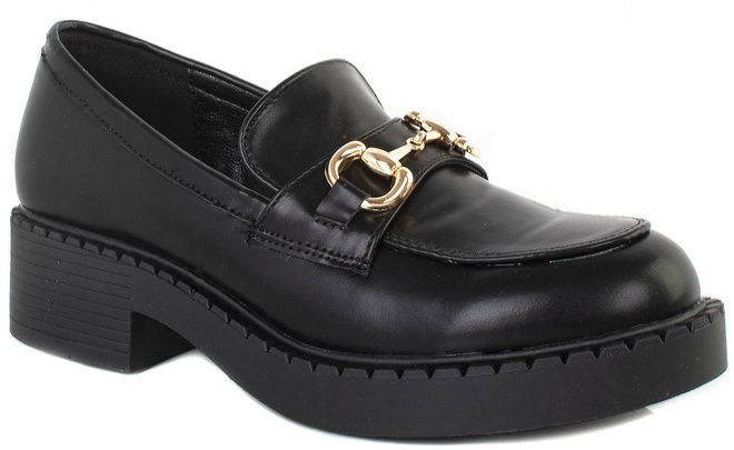 Klasyczne damskie mokasyny wykonane z wysokiej jakości skóry ekologicznej. Modny model zdobi złoty łańcuszek. Półbuty na wygodnej, profilowanej platformie. Obuwie lekkie i wygodne, najmodniejszy fason tego wiosennego sezonu!