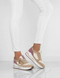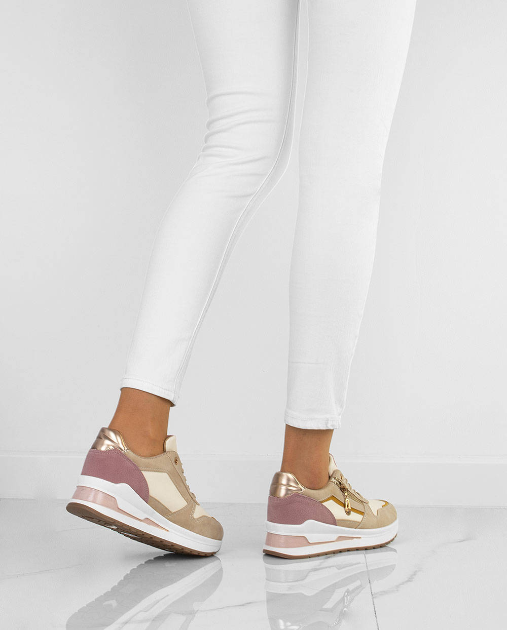 • Stylowe sneakersy na grubszej podeszwie, wykonane z połączenia zamszu oraz wstawek z materiału typu siatka. Obuwie sznurowane, posiada ozdobny, złoty zamek.