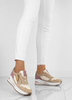 Stylowe sneakersy na grubszej podeszwie, wykonane z połączenia zamszu oraz wstawek z materiału typu siatka. Obuwie sznurowane, posiada ozdobny, złoty zamek.