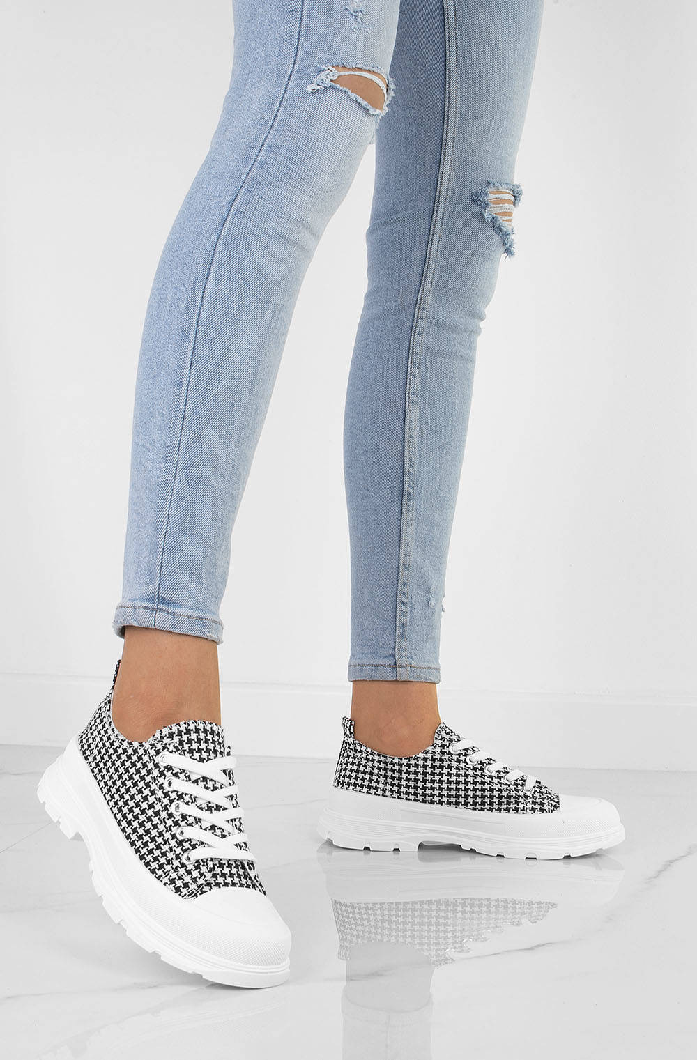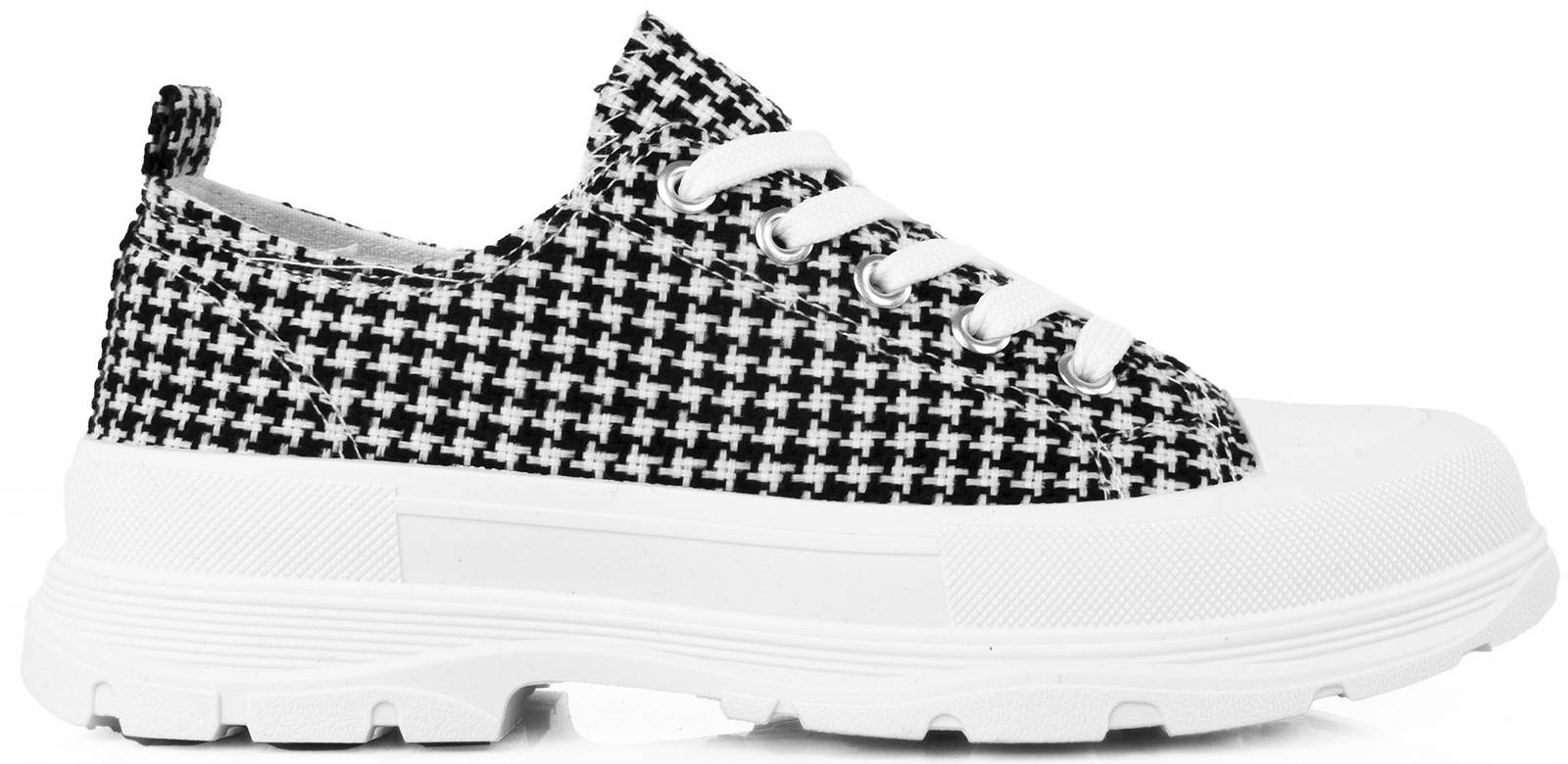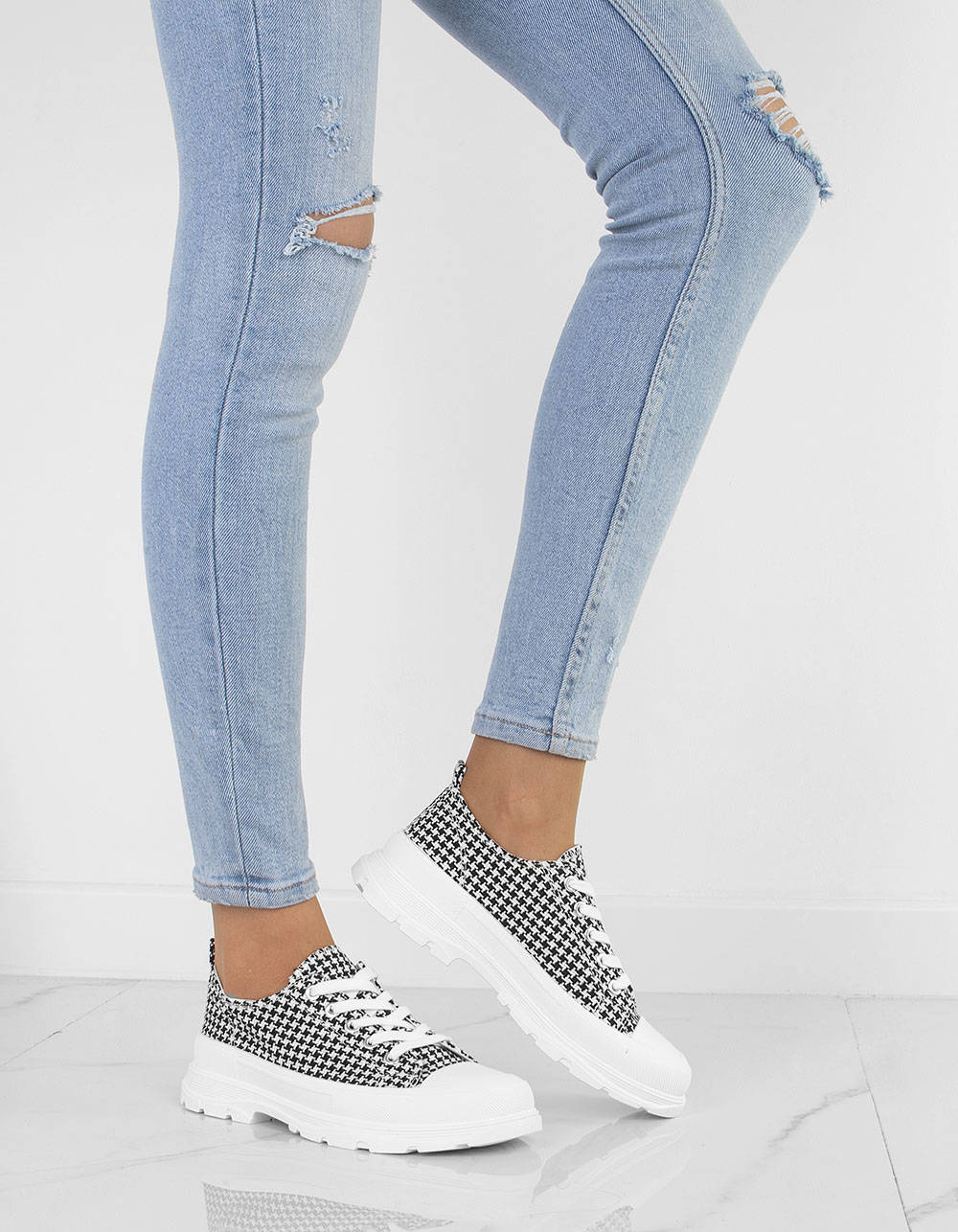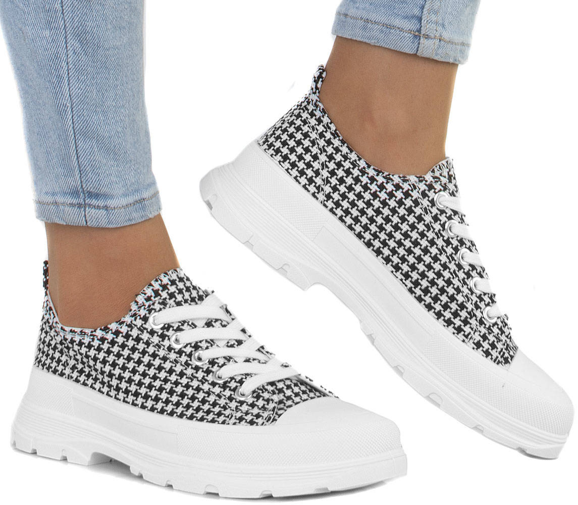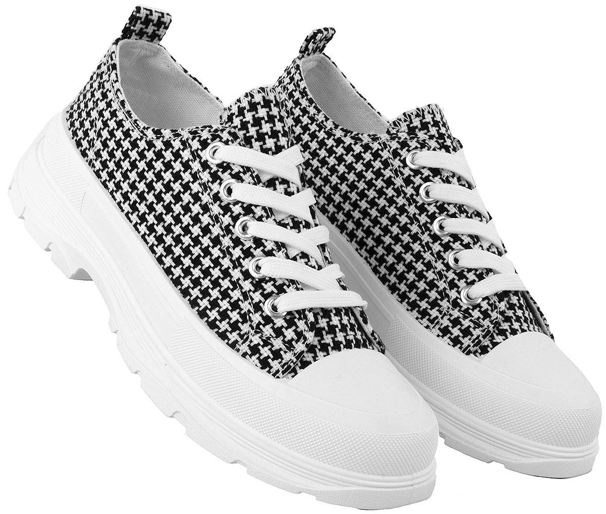 Damskie niskie buty sportowe a'la trampki. Wykonane z materiału tkaninowego na grubszej, wygodnej podeszwie z platformą. Model ze sznurowaną cholewką, tkaninowa wkładka.