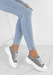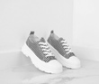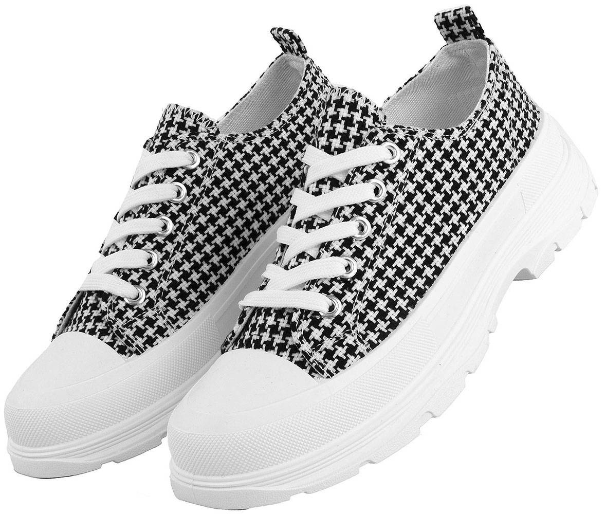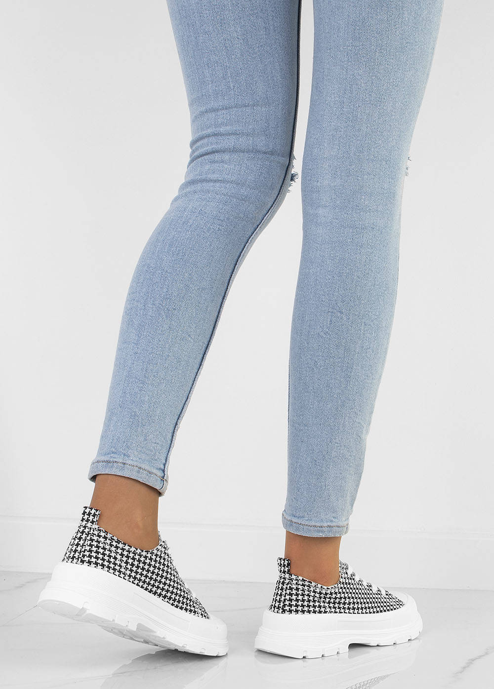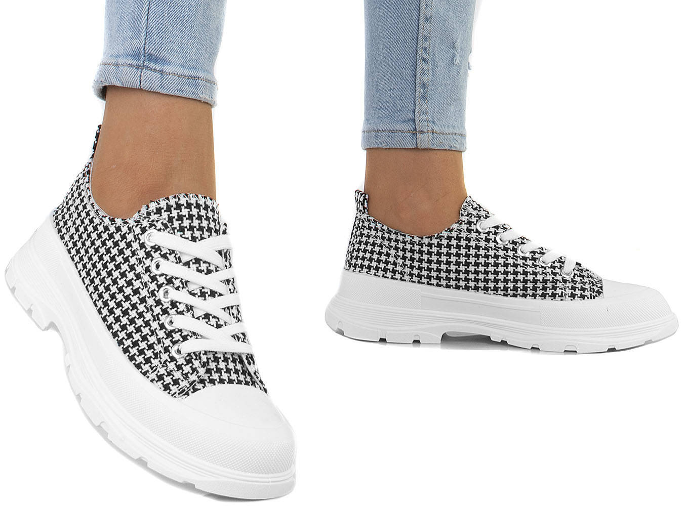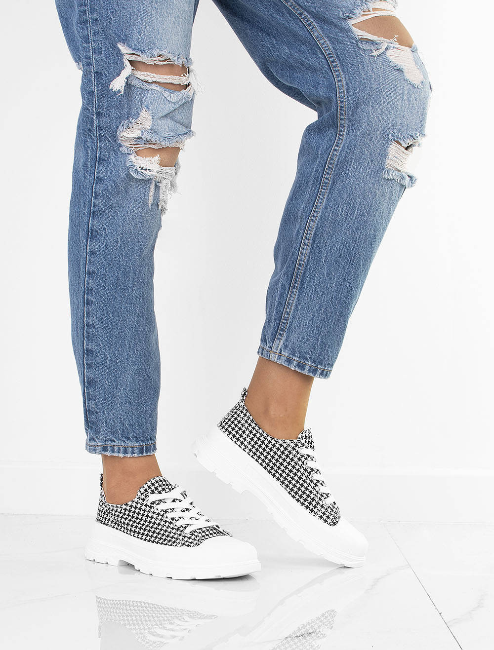 Damskie niskie buty sportowe a'la trampki. Wykonane z materiału tkaninowego na grubszej, wygodnej podeszwie z platformą. Model ze sznurowaną cholewką, tkaninowa wkładka.