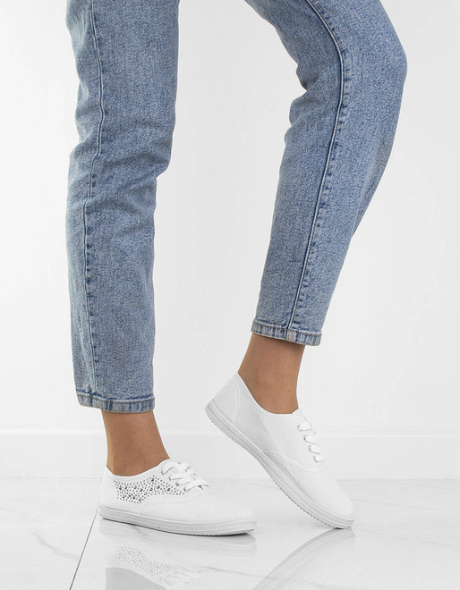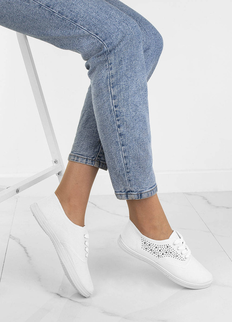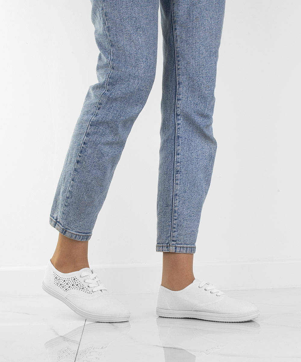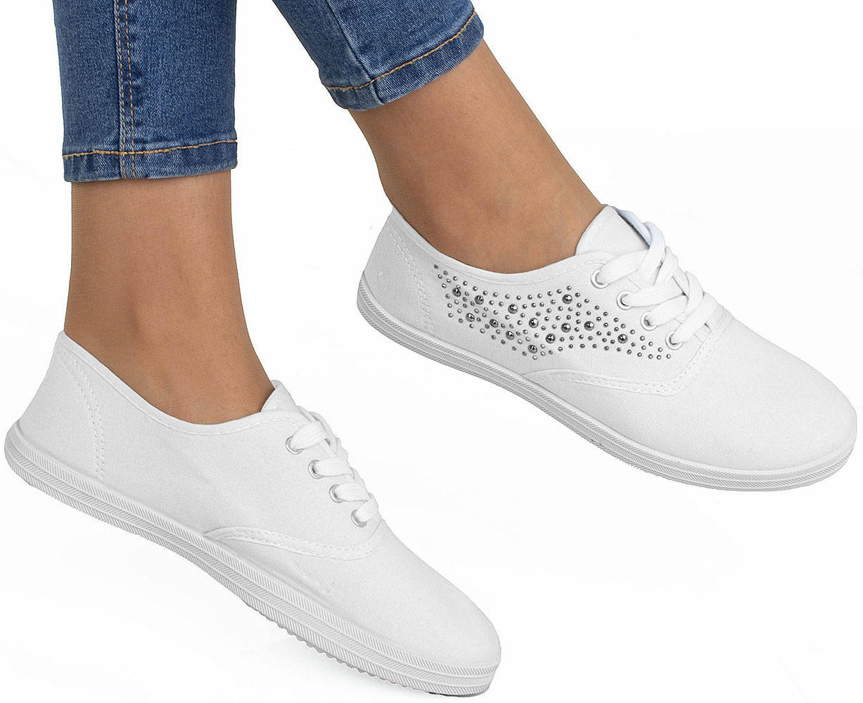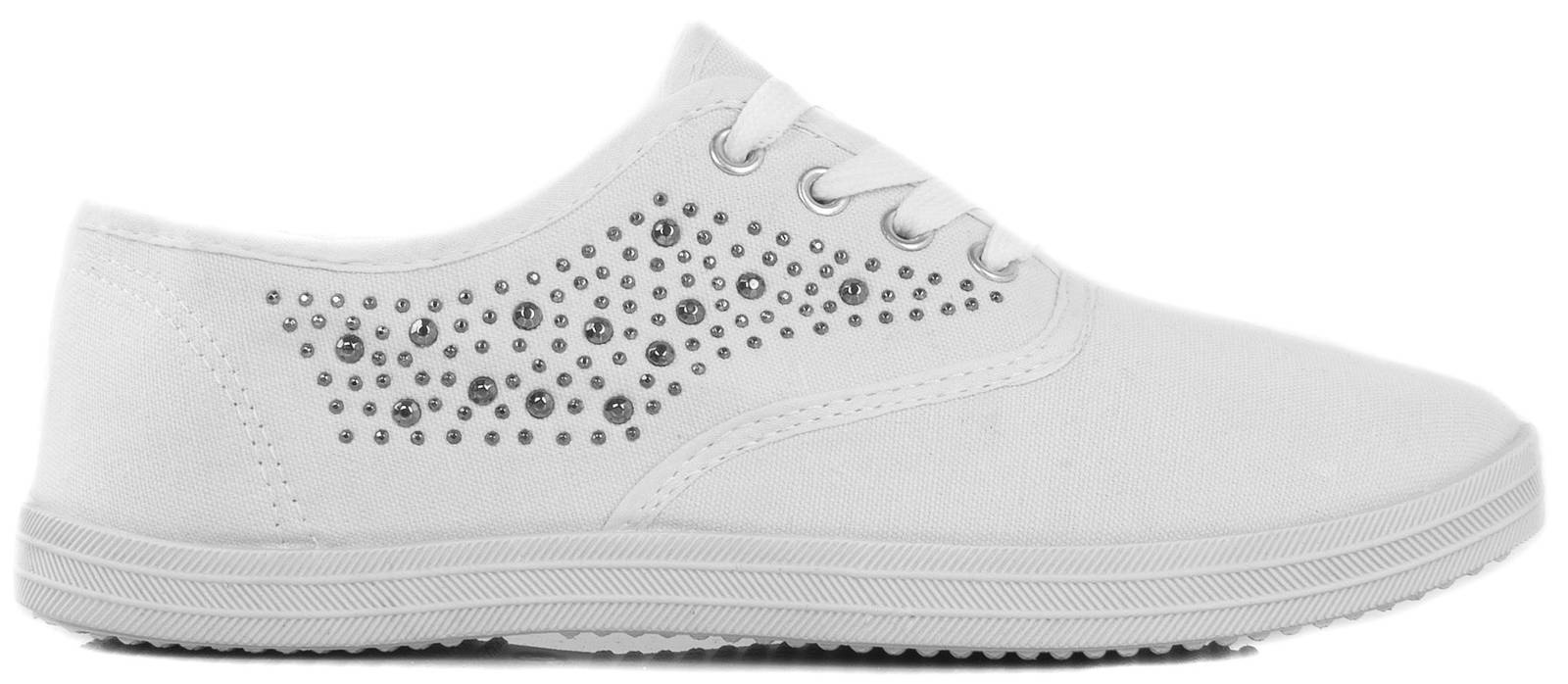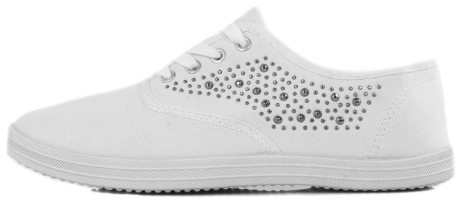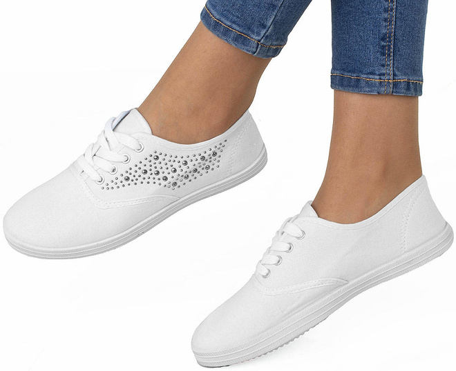 Materiałowe, wygodne trampki damskie. Podeszwa wykonana z tworzywa gumowego. Bok zdobiony srebrnymi dżetami. Model dodatkowo sznurowany, lekkie i wygodne. Idealne na sezon wiosna-lato.