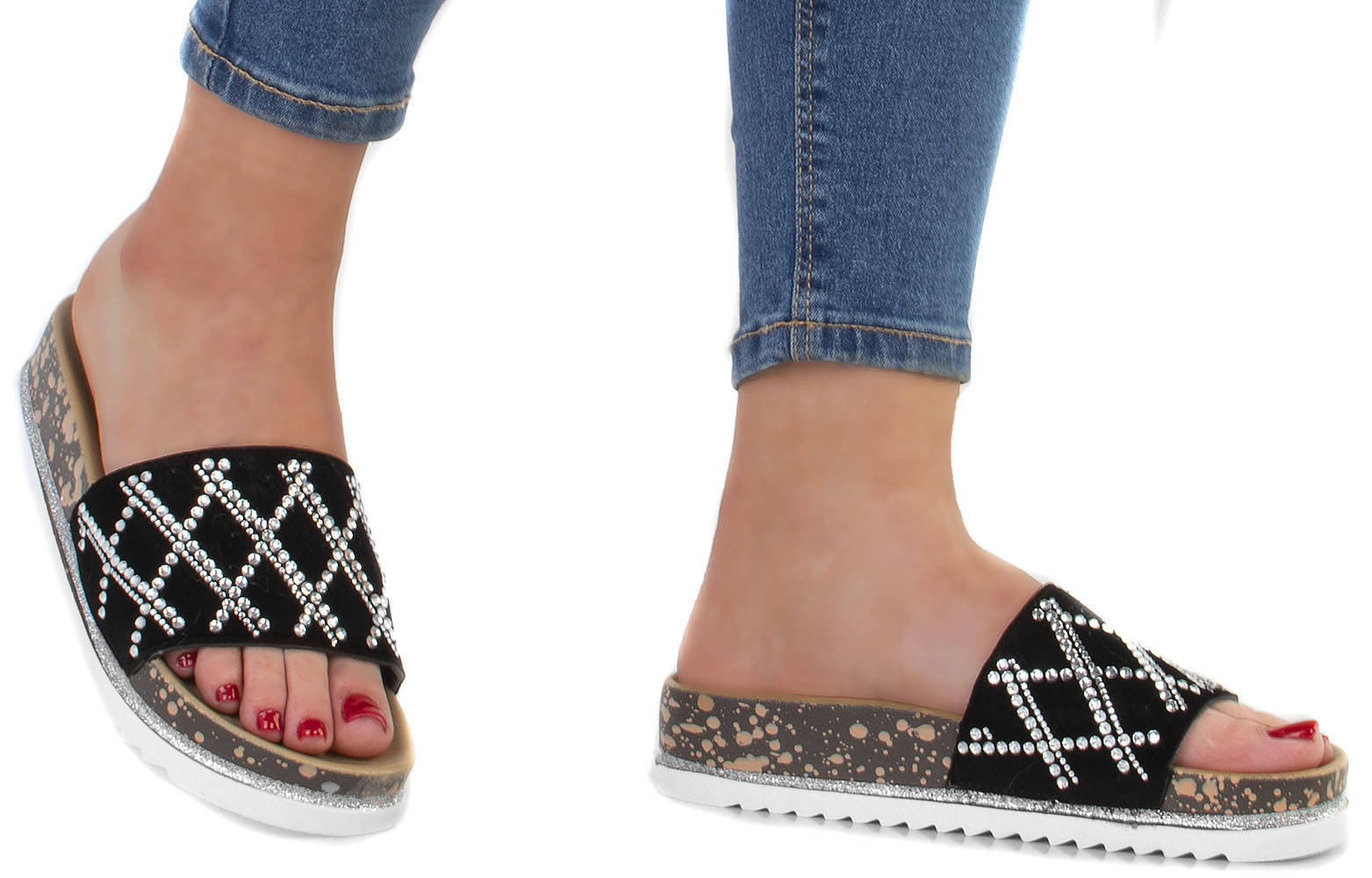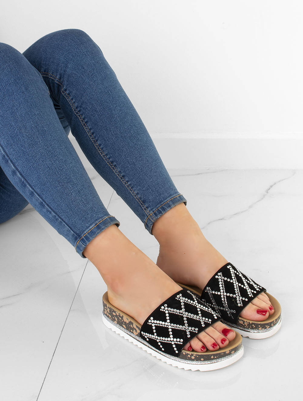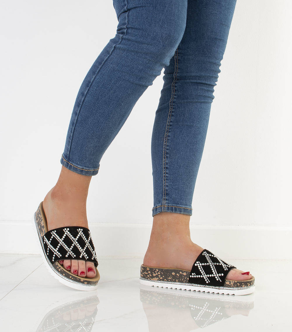 • CZARNE KLAPKI Z CYRKONIAMI NA PLATFORMIE. TO IDEALNY WYBÓR NA LETNIE SPACERY.
