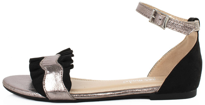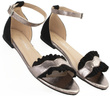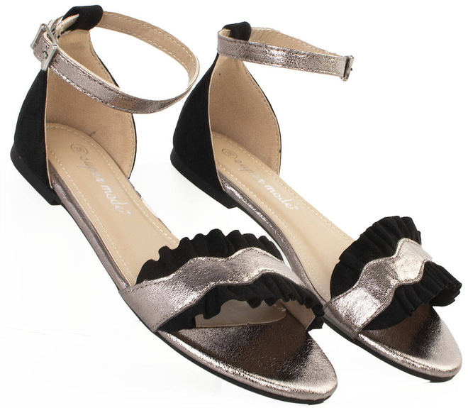 • Sandałki damskie na płaskim obcasie. Dzięki metalicznemu wykończeniu oraz uroczej falbance prezentują się po prostu zjawiskowo! Zapięcie, które pięknie podkreśla kostkę stanowi tak zwaną kropkę nad i.