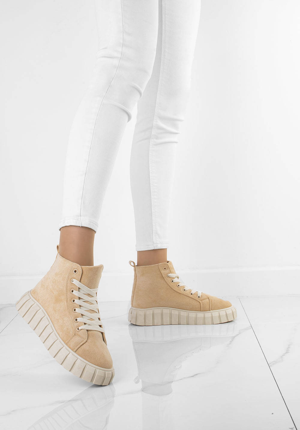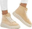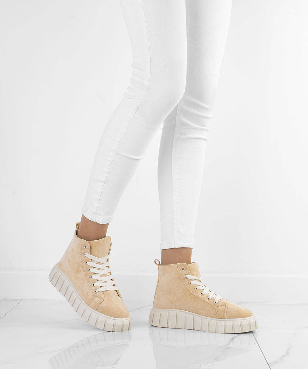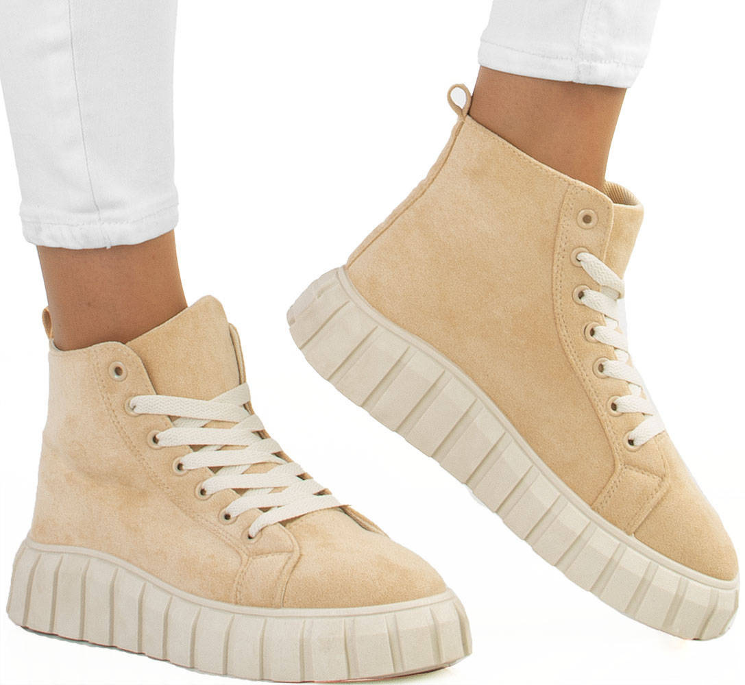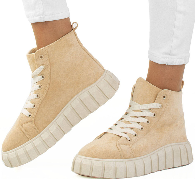 Damskie niskie buty sportowe a'la trampki. Wykonane z zamszu na grubszej, wygodnej podeszwie z platformą. Model ze sznurowaną cholewką, tkaninowa wkładka. Must have Twoich stylizacji!