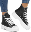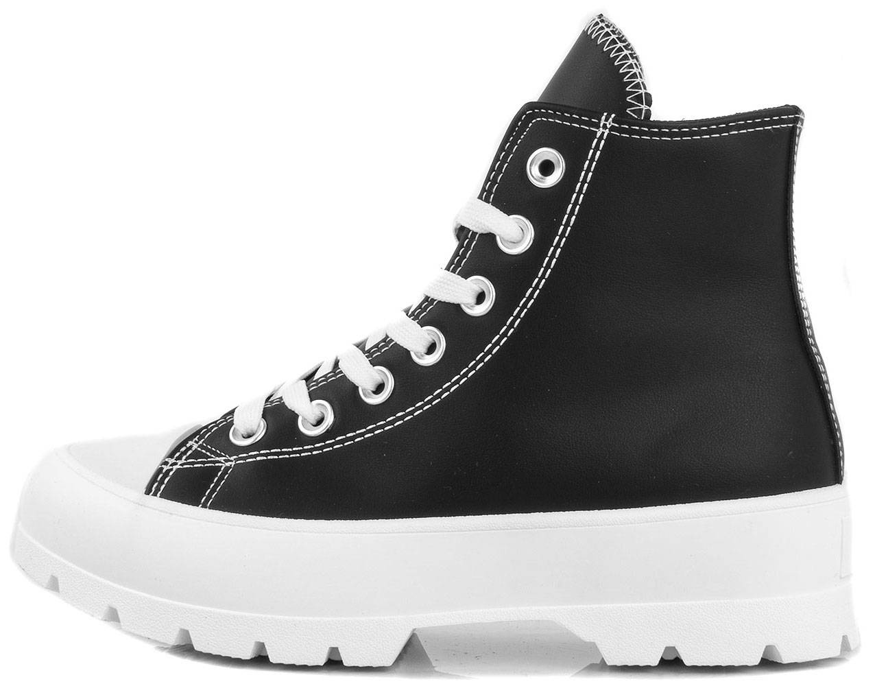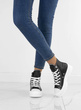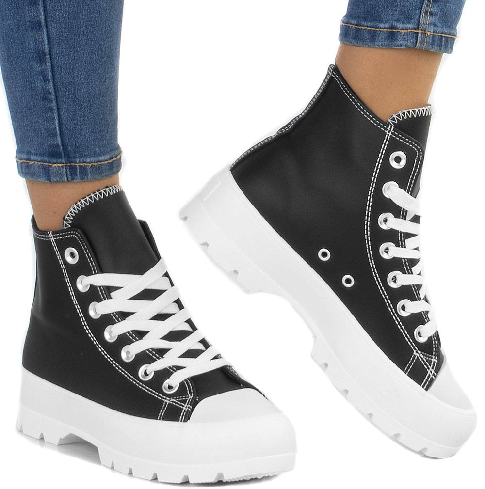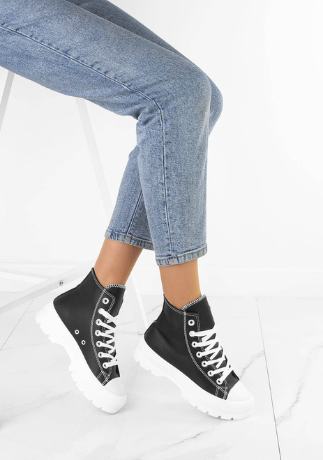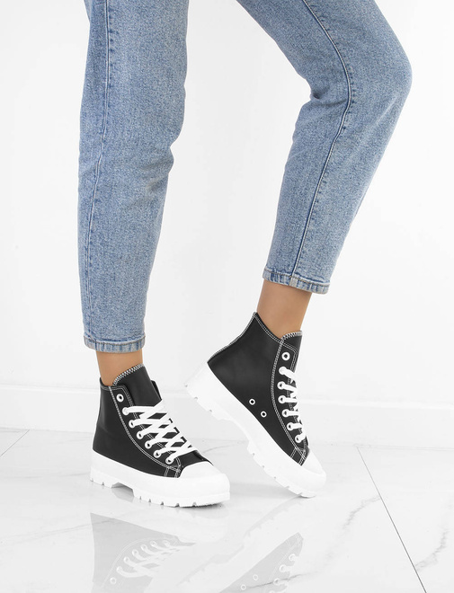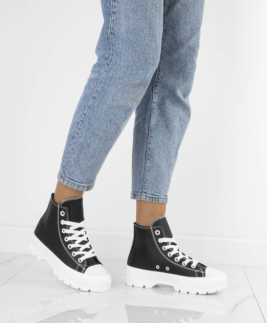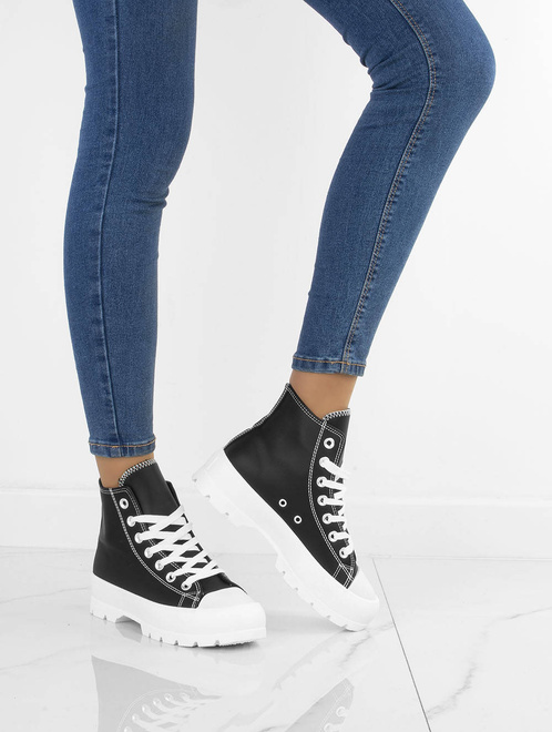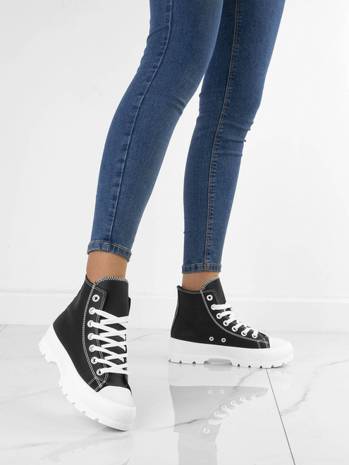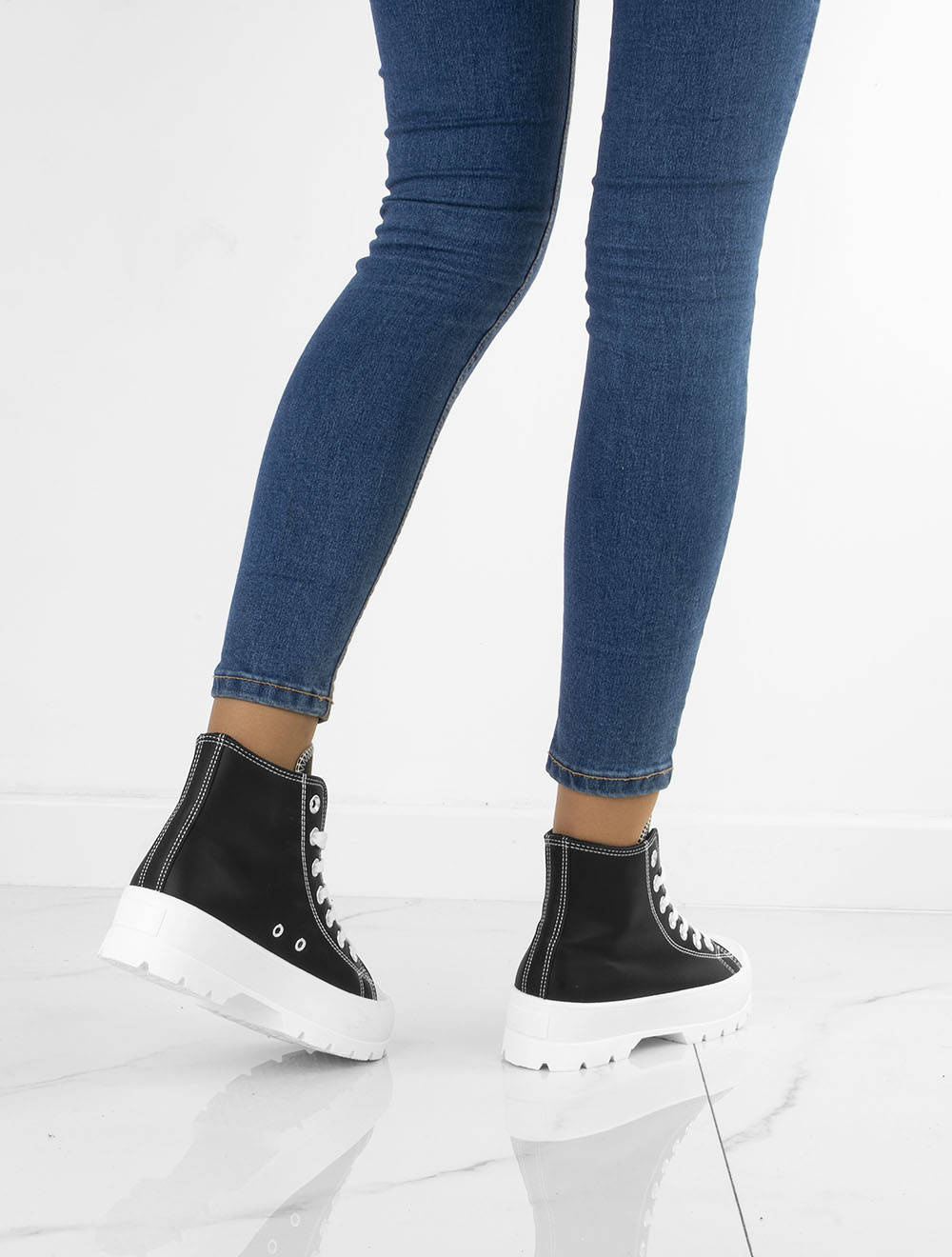 Damskie wysokie buty sportowe a'la trampki. Wykonane z najwyższej jakości skóry ekologicznej na grubszej, wygodnej podeszwie z platformą. Model ze sznurowaną cholewką, tkaninowa wkładka.
