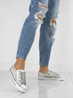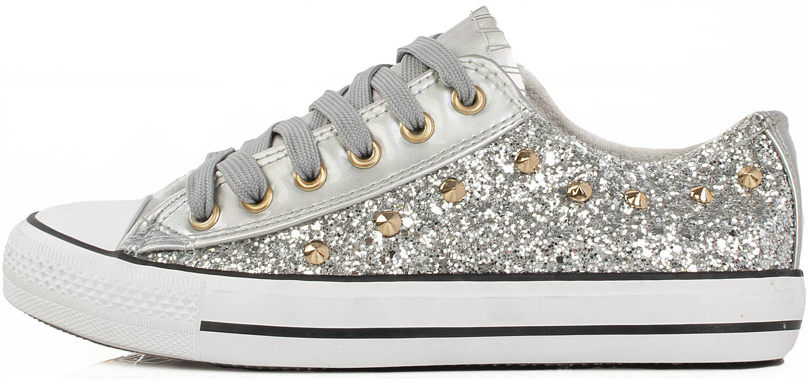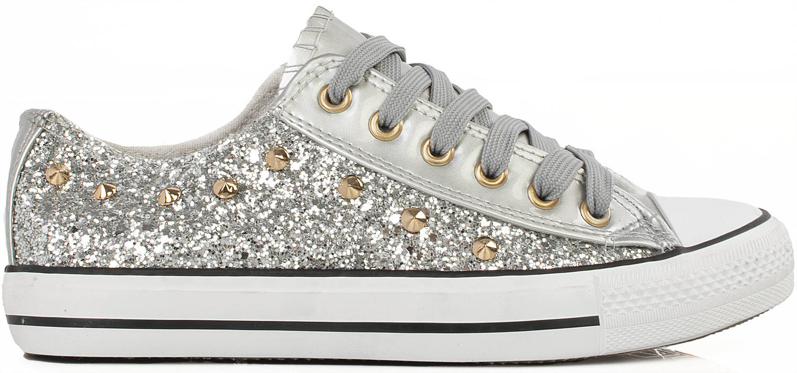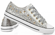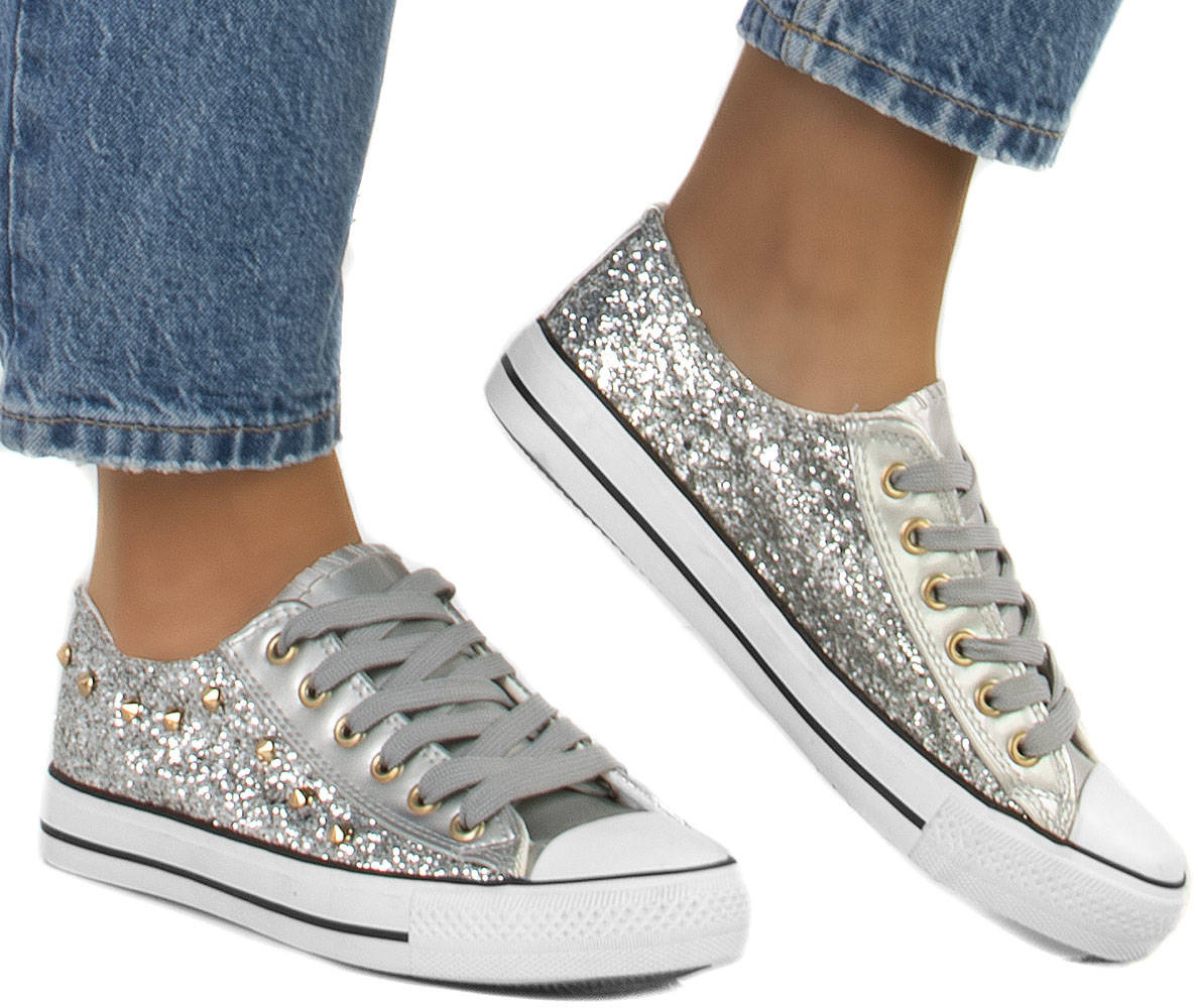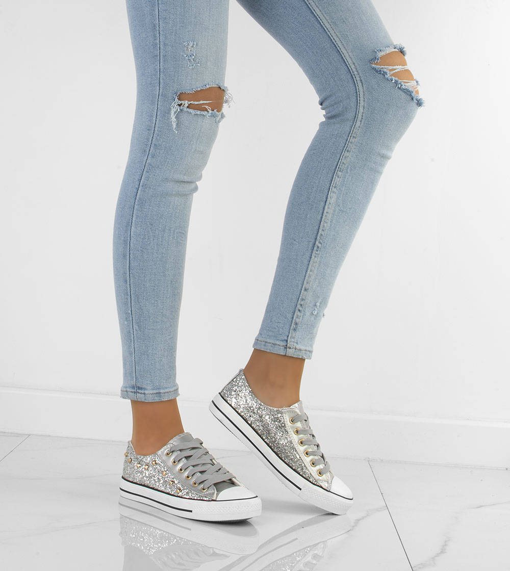 • Klasyczny model trampek na gumowej podeszwie z cekinami i dżetami. Obuwie sznurowane, absolutny must have dla każdego miłośnika trampek.