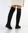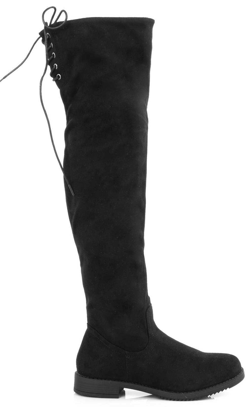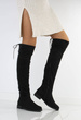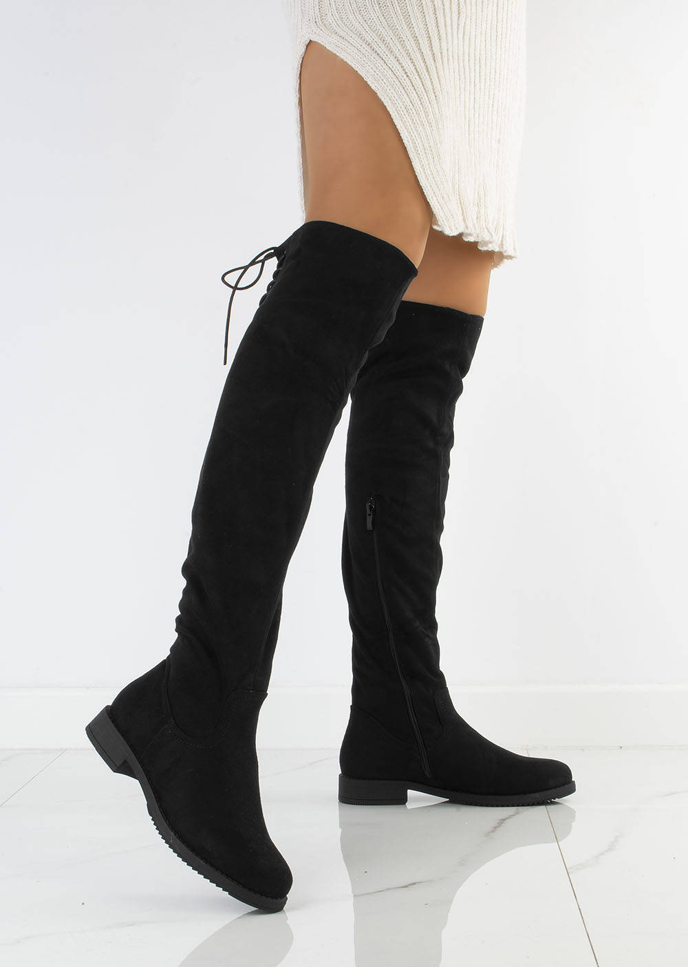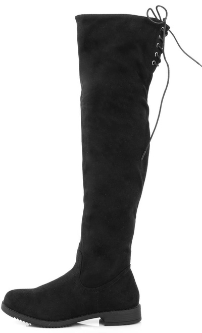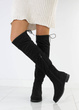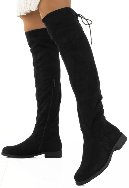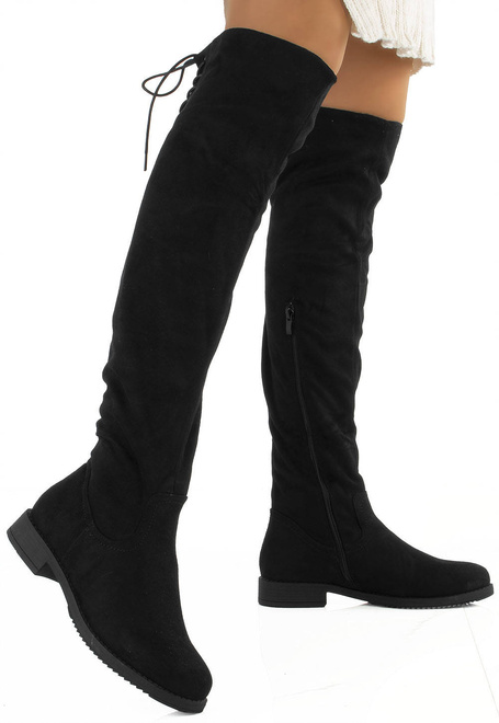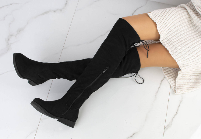 Stylowe czarne kozaki za kolano, wykonane ze skóry eko-zamszowej, zapinana suwakiem po boku. Na górze posiadają sznurek, którym można regulować szerokość. Klasyczny model na płaskim obcasie.