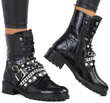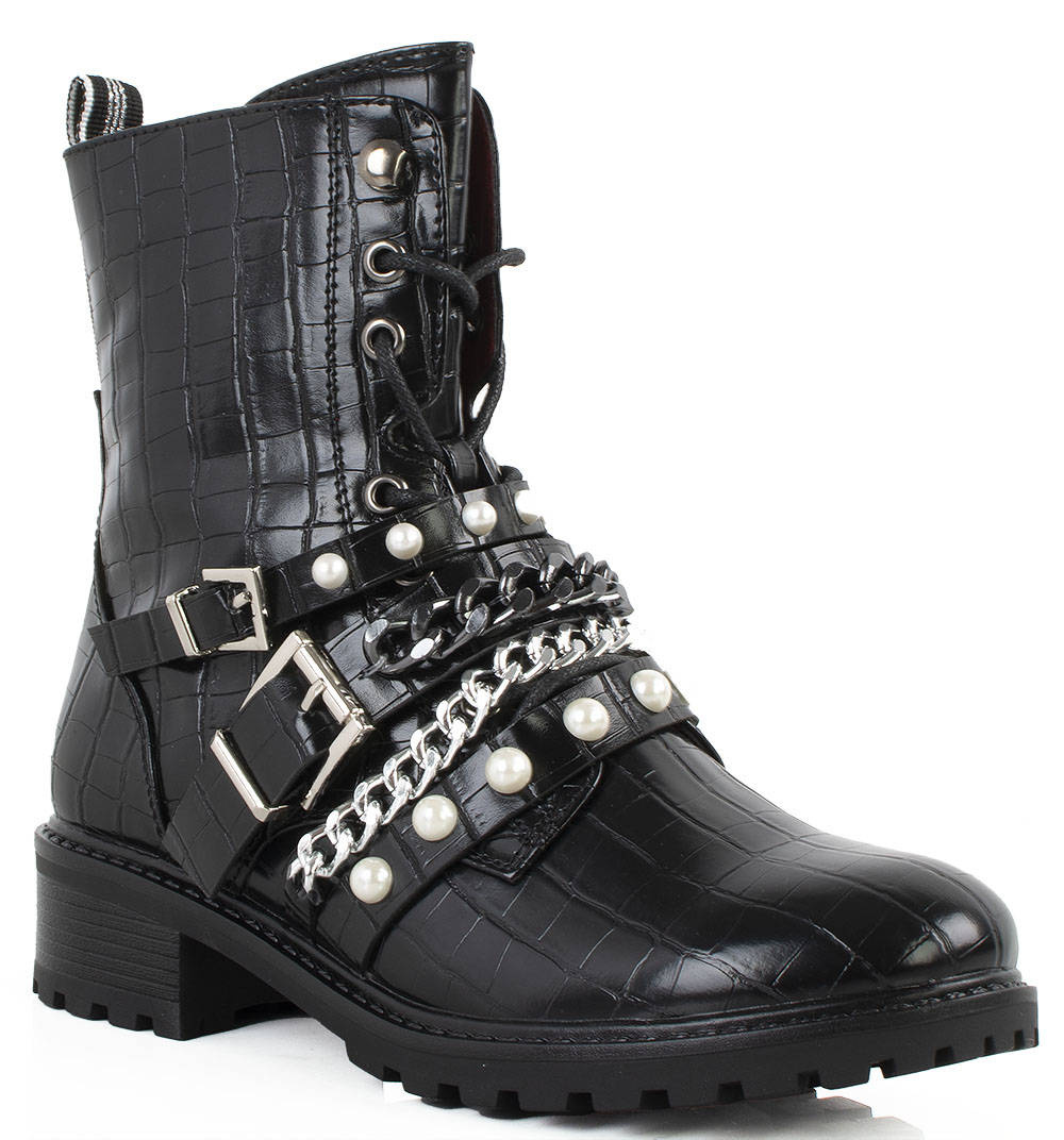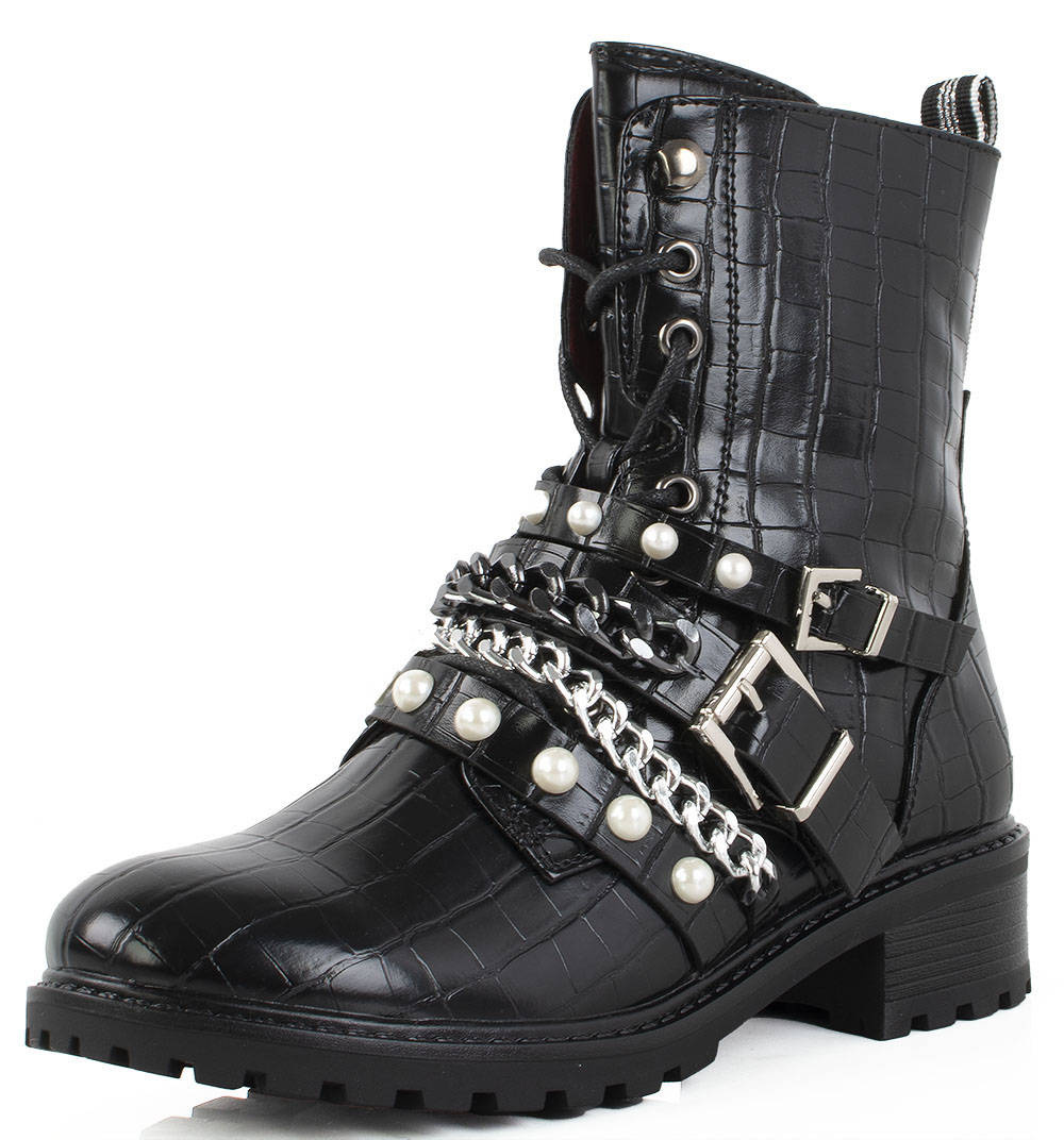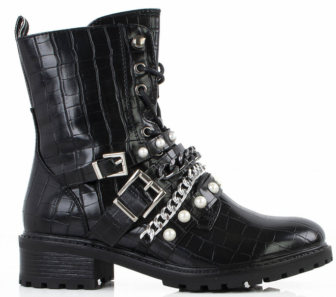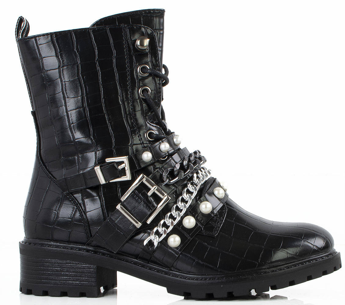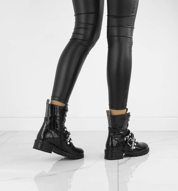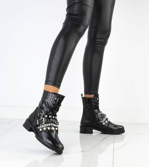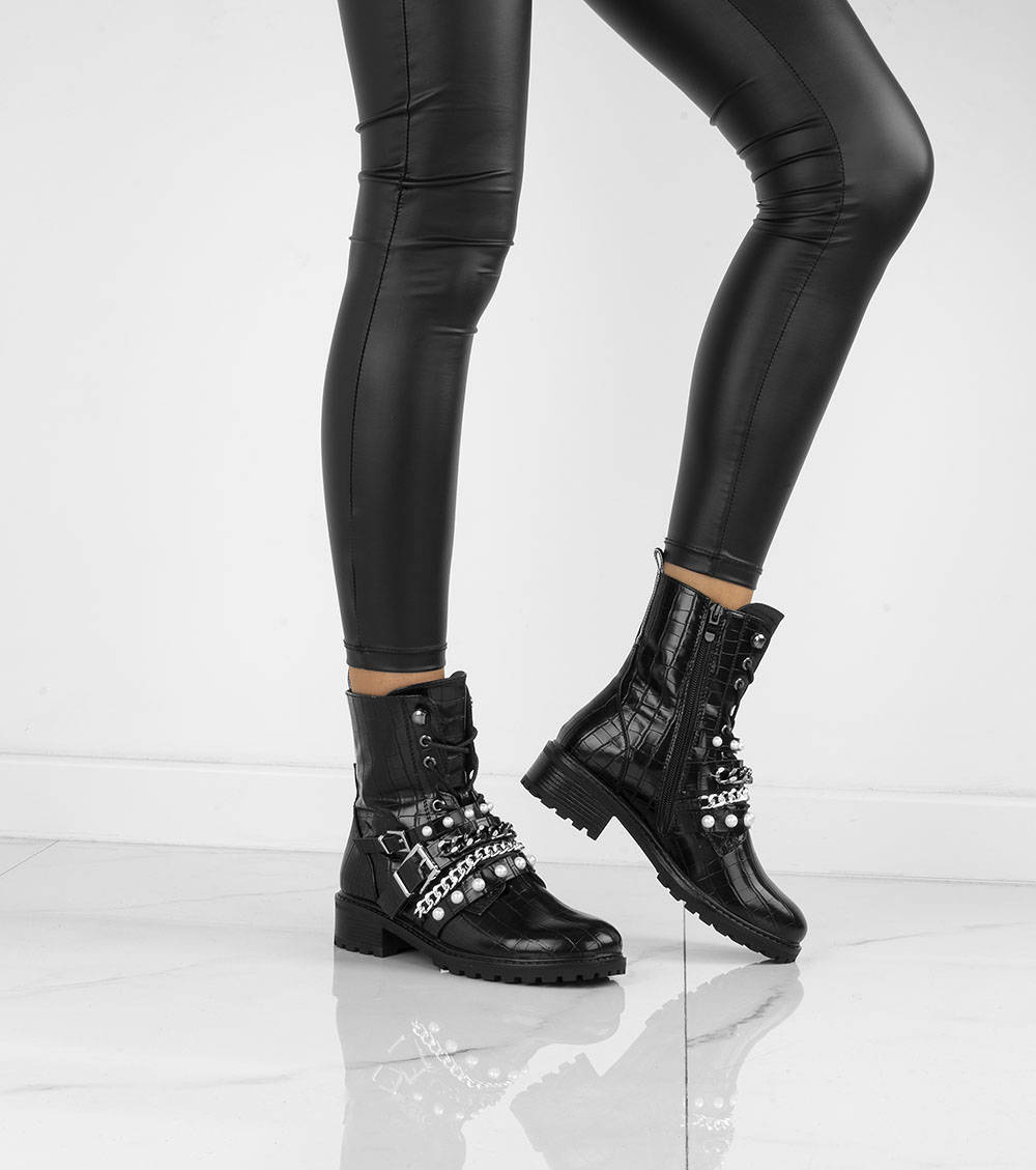 Przepiękne damskie botki na płaskim obcasie, wykonane ze skóry ekologicznej lakierowanej. Podwójne zapięcie : zamek oraz sznurowanie. Wnętrze ocieplone futerkiem.