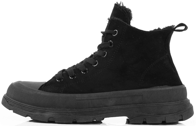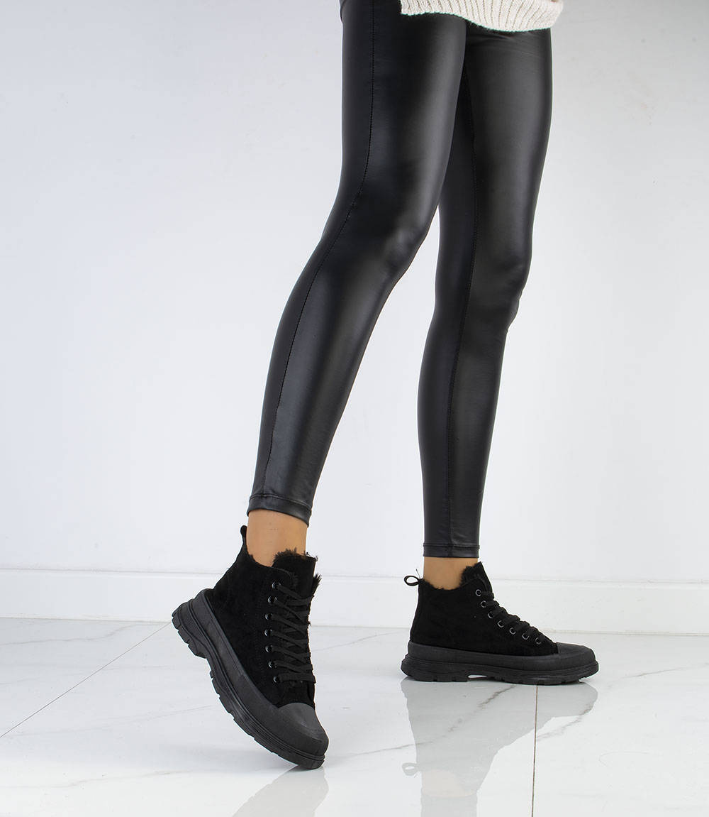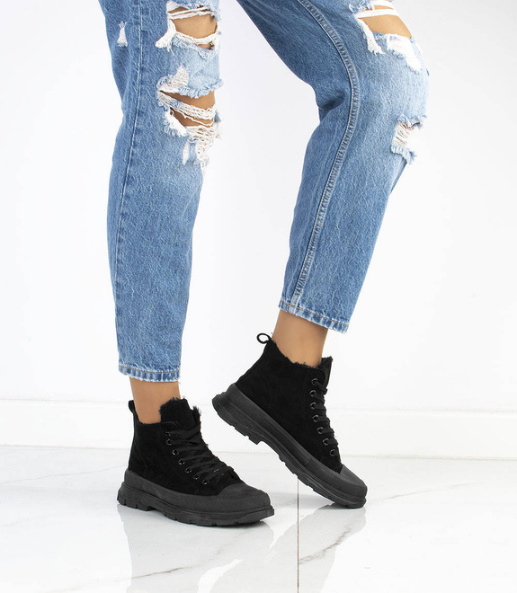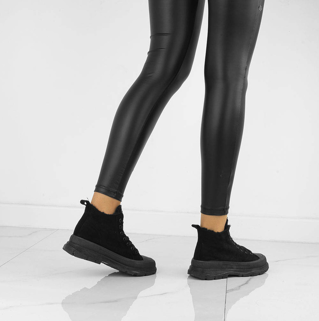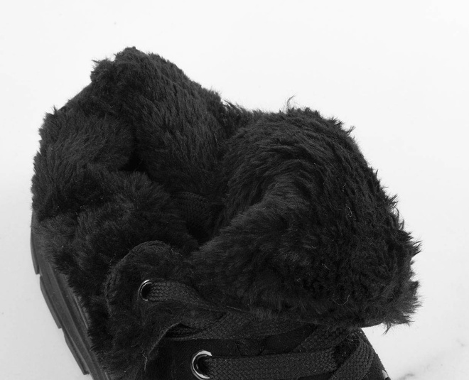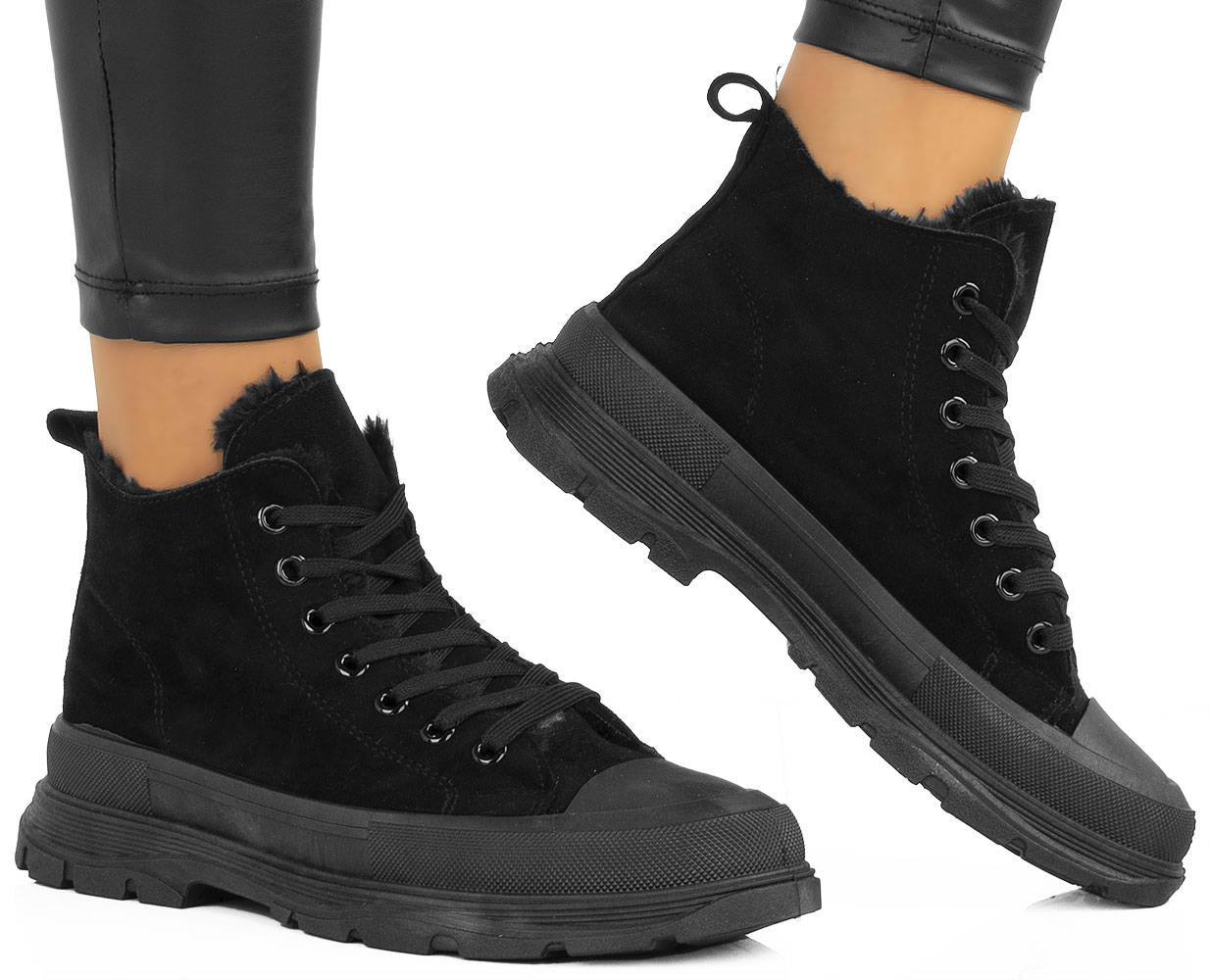 Czarne trampki damskie ocieplane grubym futerkiem. Idealne na jesień i zimę. Wykonane z mięciutkiego zamszu ekologicznego. Gruba, antypoślizgowa podeszwa. Buty w odcieniach klasycznej czerni to MUSTHAVE na jesień i zimę.
