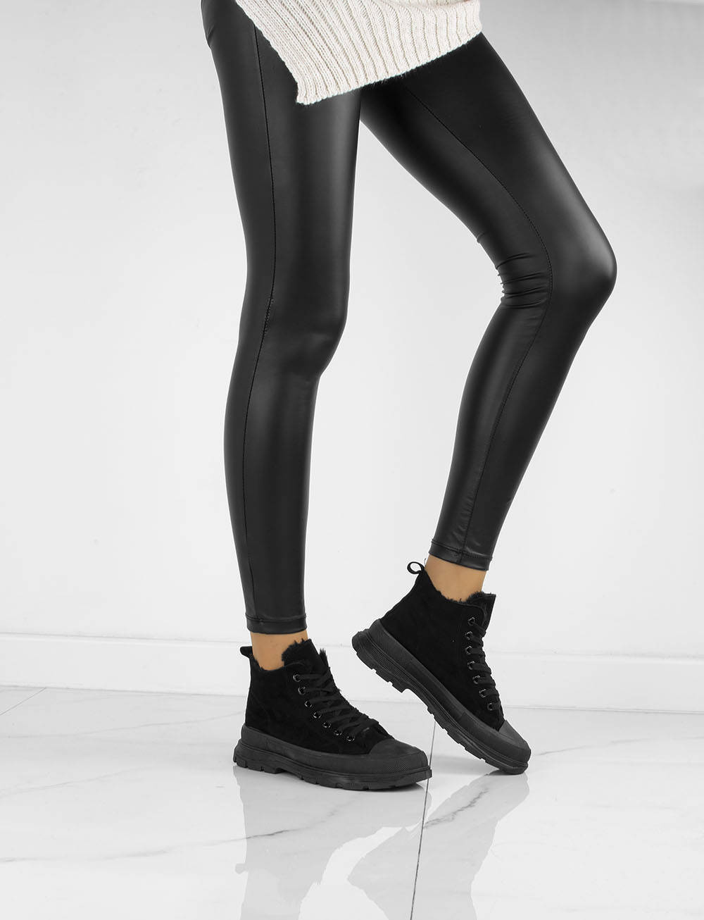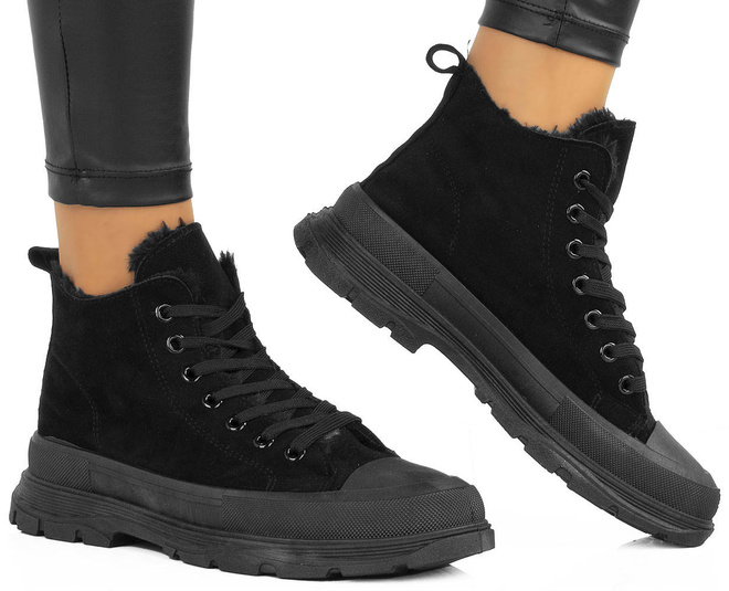 • Czarne trampki damskie ocieplane grubym futerkiem. Idealne na jesień i zimę. Wykonane z mięciutkiego zamszu ekologicznego. Gruba, antypoślizgowa podeszwa. Buty w odcieniach klasycznej czerni to MUSTHAVE na jesień i zimę.