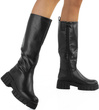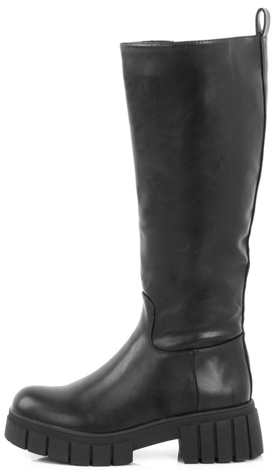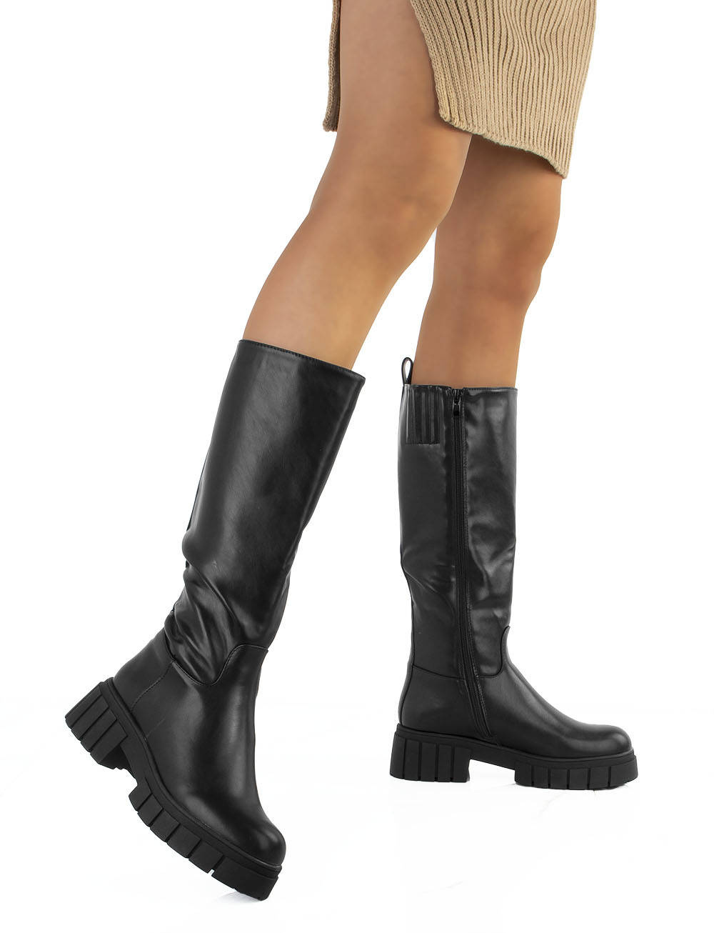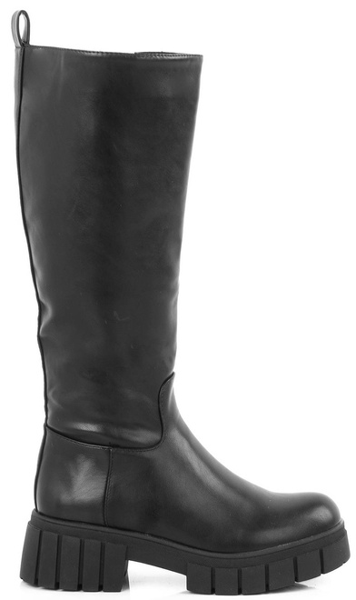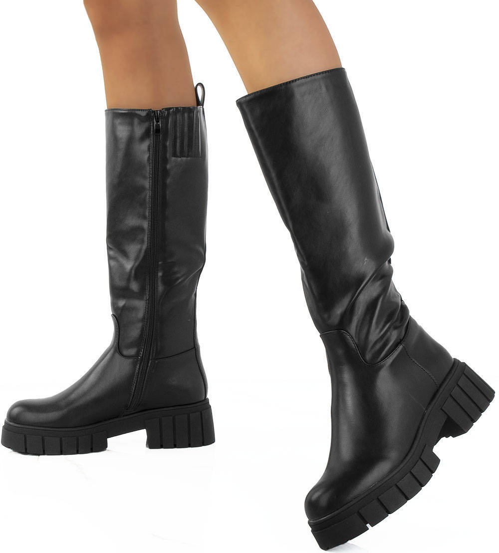 • Czarne kozaki na platformie wykonane z mięciutkiej skóry ekologicznej. Zapięcie na suwak.