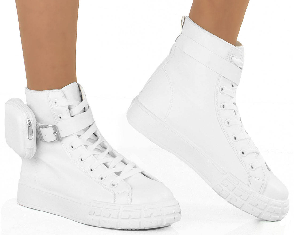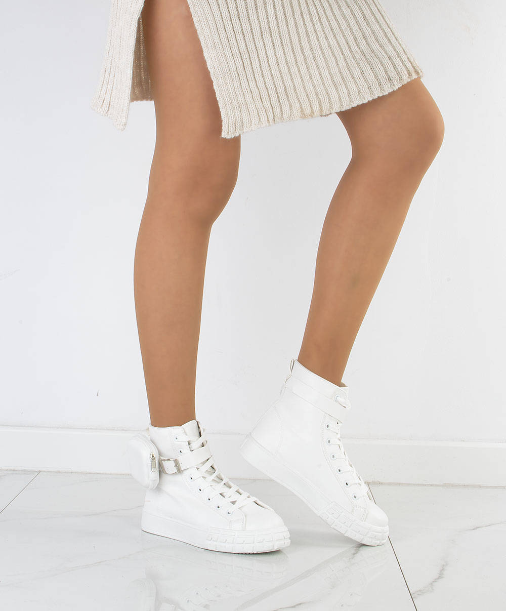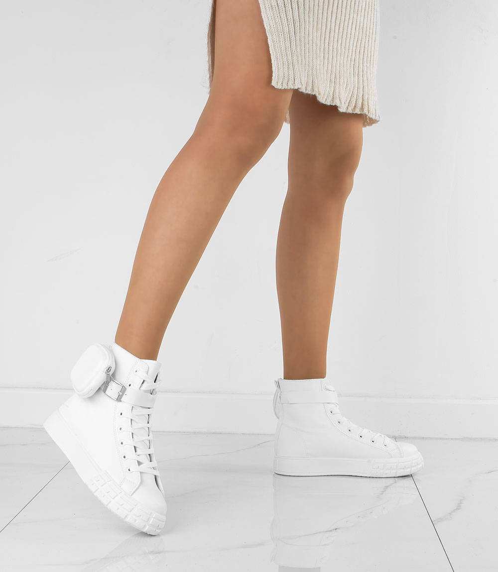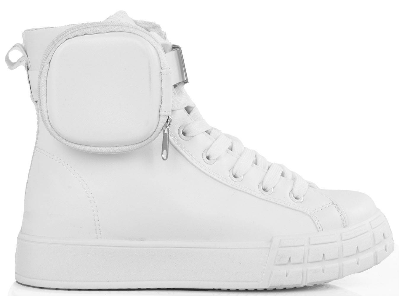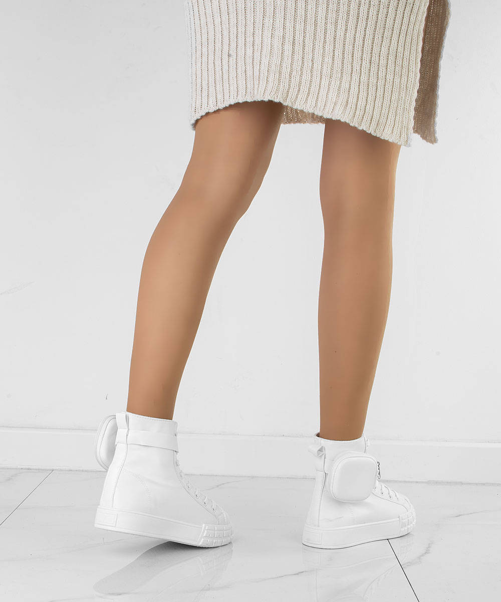 • Trampki a'la botki wykonane z ekoskóry. Posiadają platformę z tworzywa gumowego oraz odpinany pasek z kieszonką. Cholewka za kostkę, obuwie sznurowane. Podeszwa miękka, antypoślizgowa.