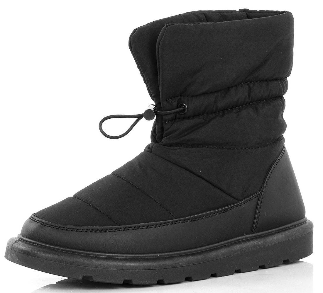 Śniegowce wykonane z pikowanego materiału i ekoskóry. Podeszwa gruba, model z wysoką cholewką ściąganą gumką ze stoperem. W środku lekkie ocieplenie i wkładka wykonane z koca obuwniczego. Buty mają okrągły nosek i są wsuwane.