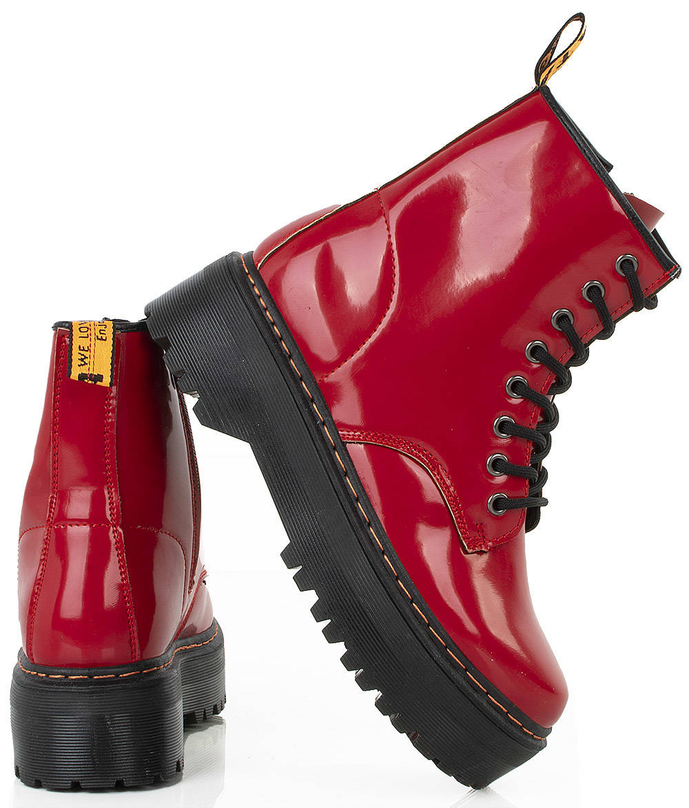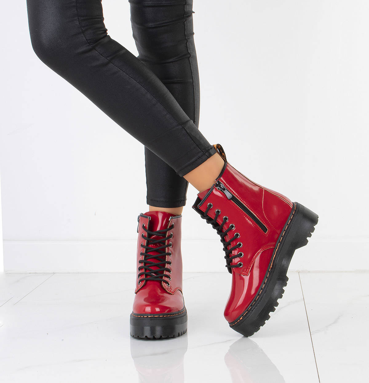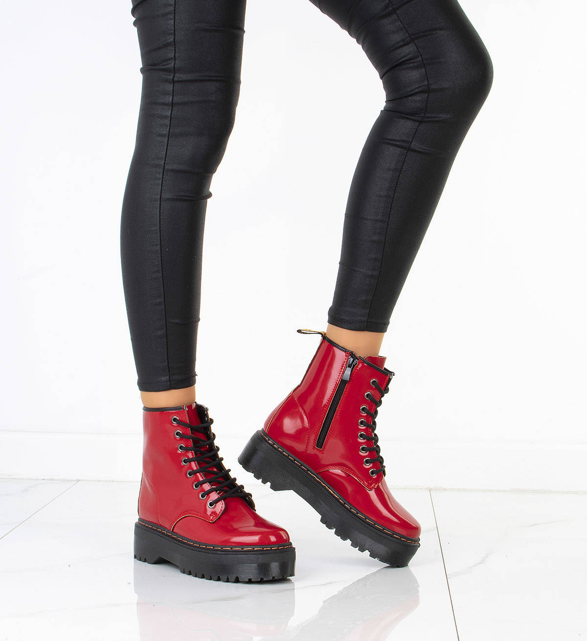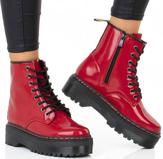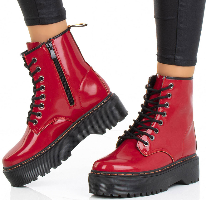 Stylowe workery wykonane ze skóry ekologicznej lakierowanej. Botki są sznurowane, dodatkowo posiadają zapięcie na suwak. Gruba podeszwa, antypoślizgowa 4-centymetrowa platforma. Wygodne i praktyczne nie tylko dla osób, które chcą dodać kilka centymetrów do swojego wzrostu.