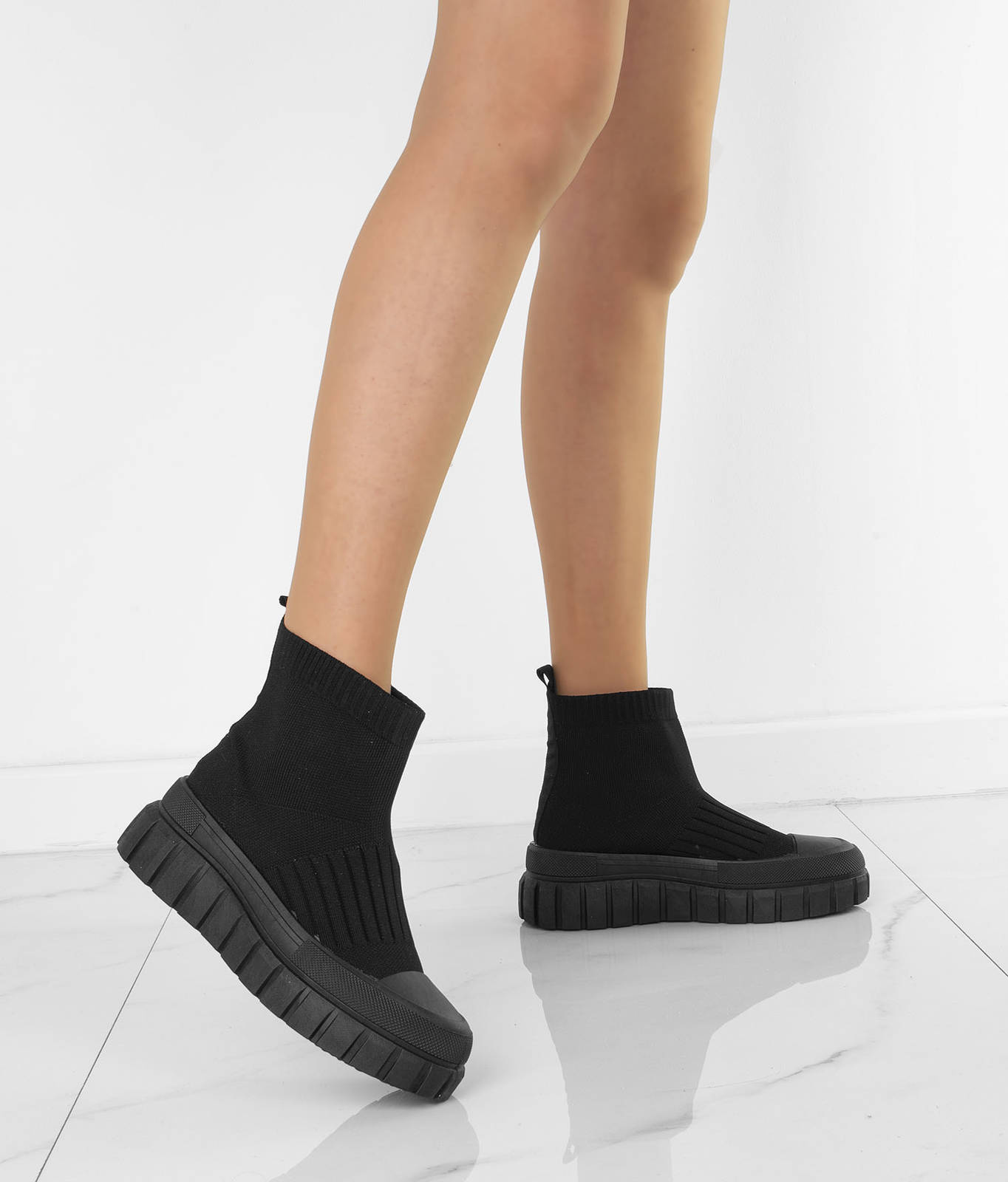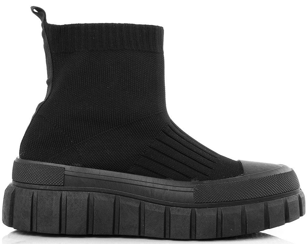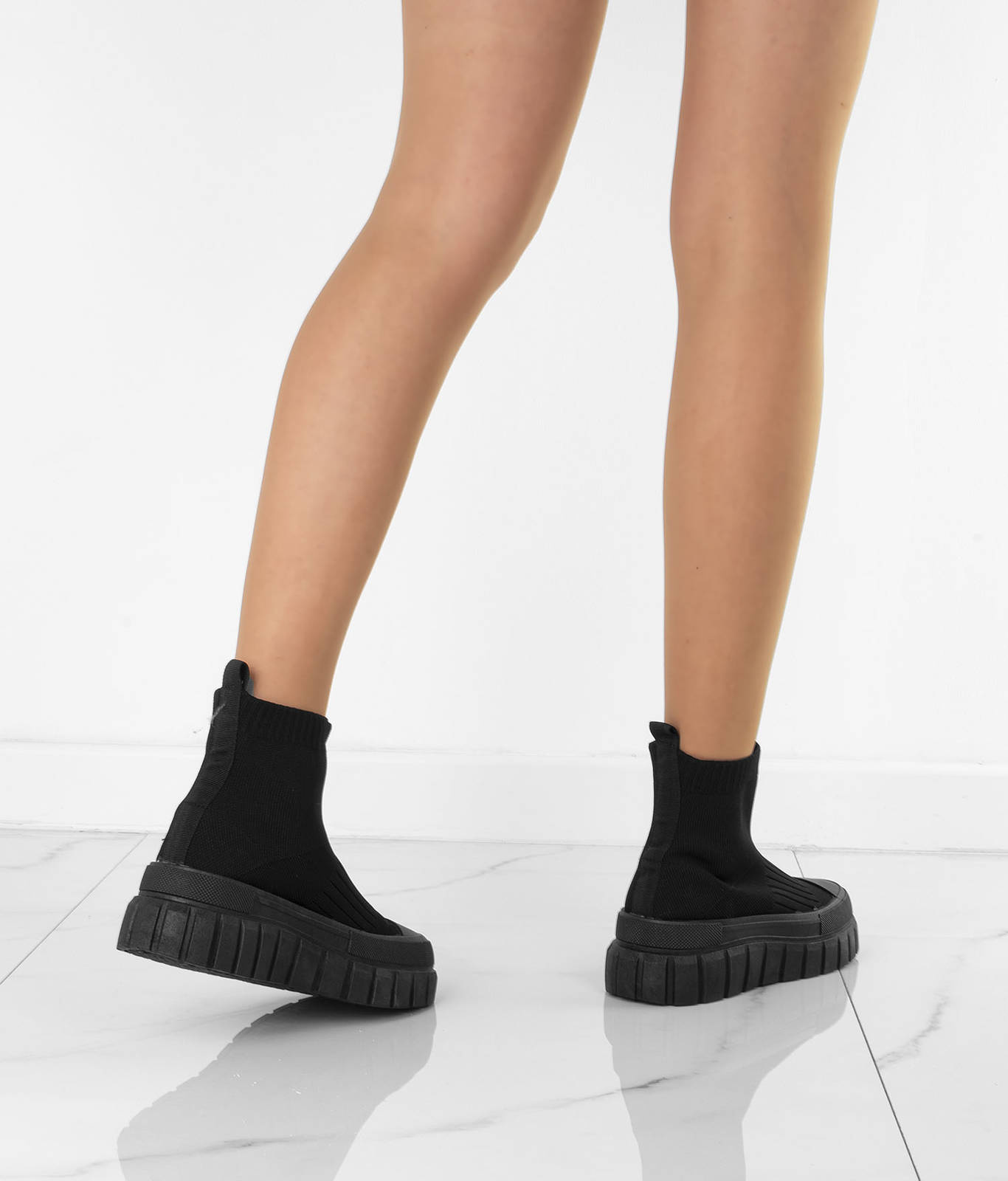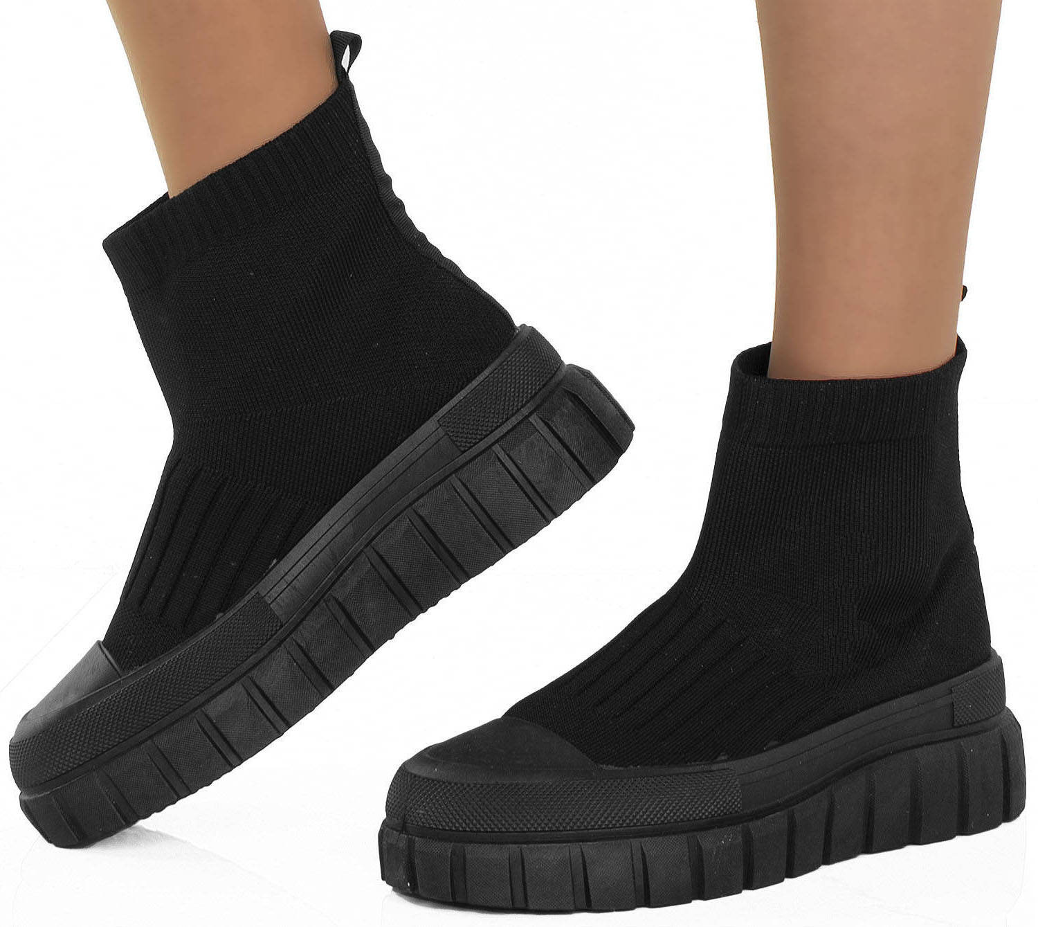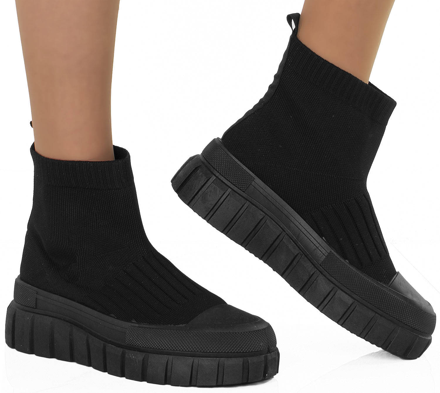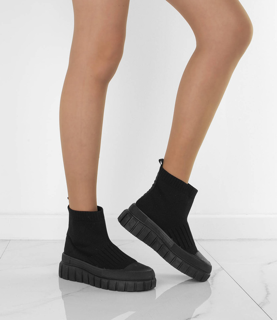 Botki z cholewką z prążkowanego materiału. Cholewka to elastyczny skarpetkowy materiał, który sprawi, że buty pięknie dopasują się do Twoich nóg. Najwygodniejszy model na platformie pasujący do wielu stylizacji.