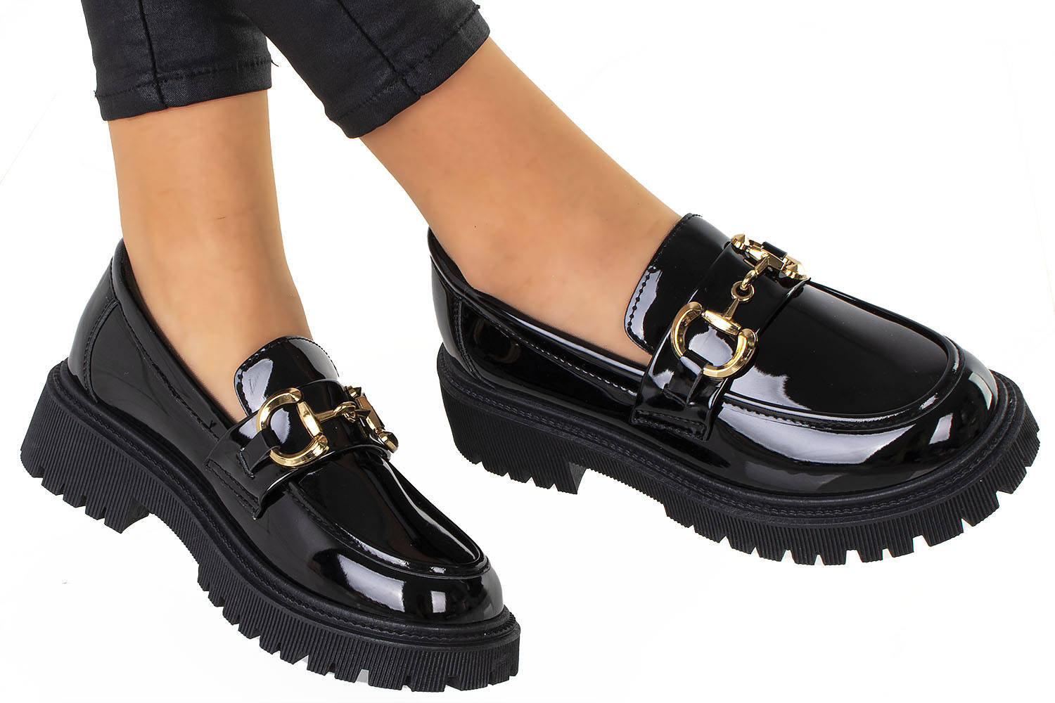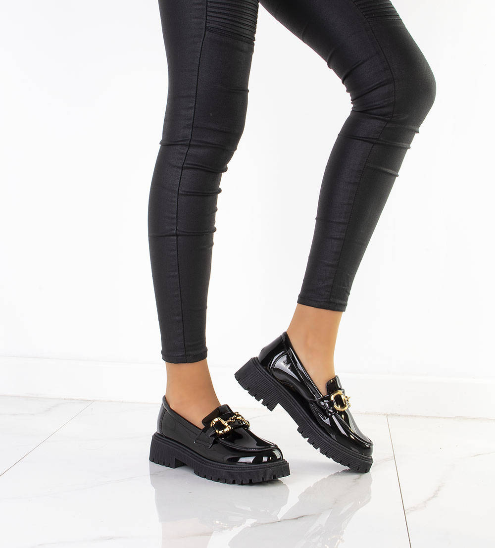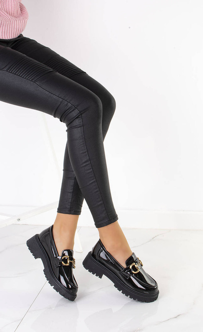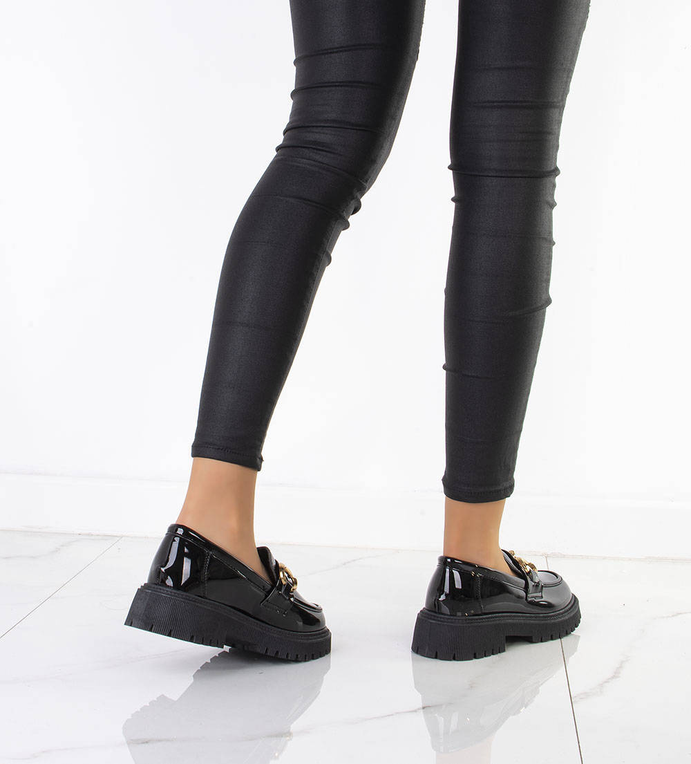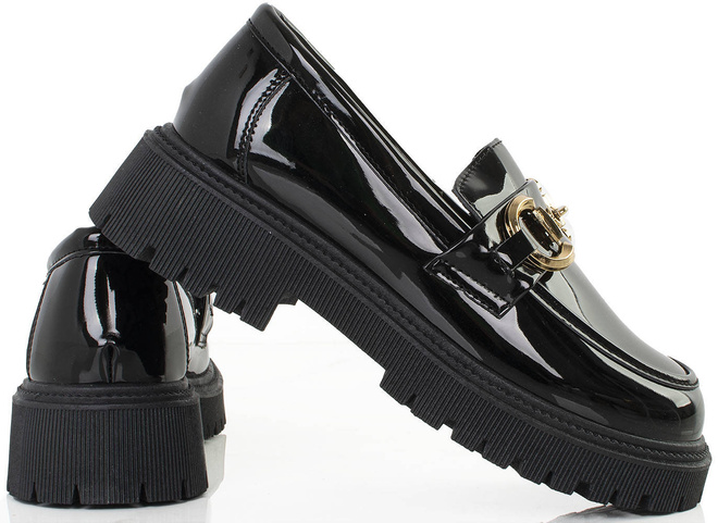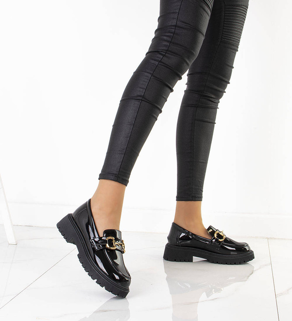 Klasyczne damskie mokasyny wykonane z wysokiej jakości skóry ekologicznej lakierowanej. Modny model zdobi złoty łańcuszek. Półbuty na wygodnej, profilowanej platformie. Obuwie lekkie i wygodne, najmodniejszy fason tego wiosennego sezonu!