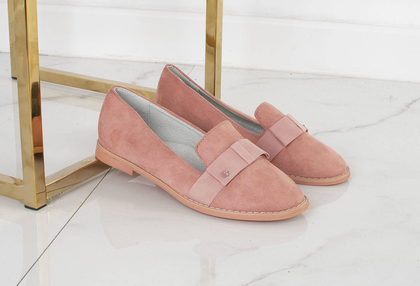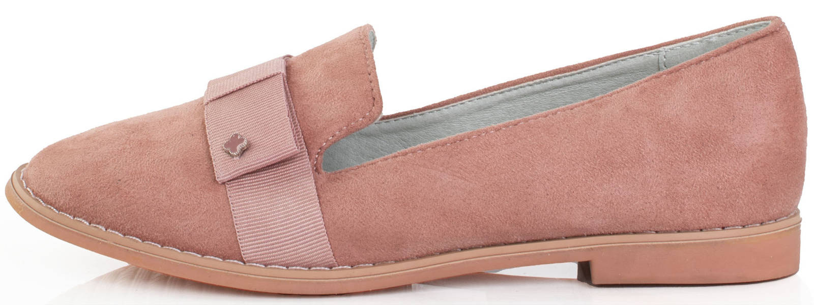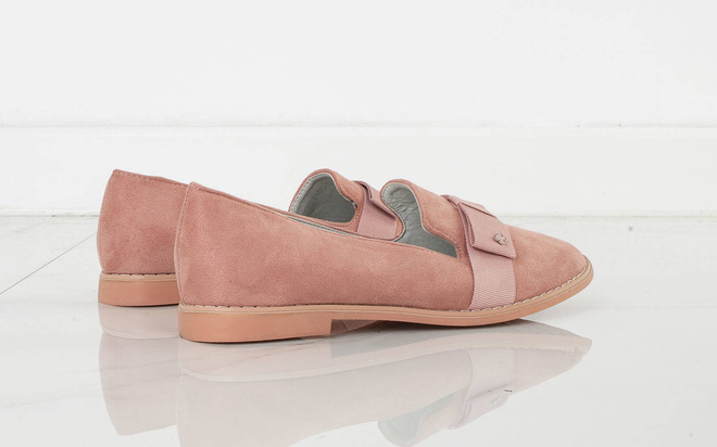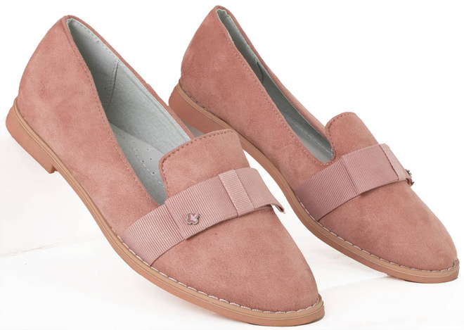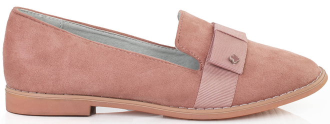 • Półbuty ze skóry ekologicznej zamszowej. Mokasyny na płaskiej podeszwie. Obuwie posiada na nosku ozdobną wstążkę. Klasyczny model w pięknym kolorze różu.