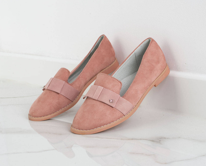Półbuty ze skóry ekologicznej zamszowej. Mokasyny na płaskiej podeszwie. Obuwie posiada na nosku ozdobną wstążkę. KLasyczny model w pięknym kolorze różu.