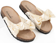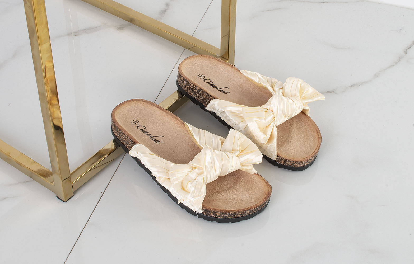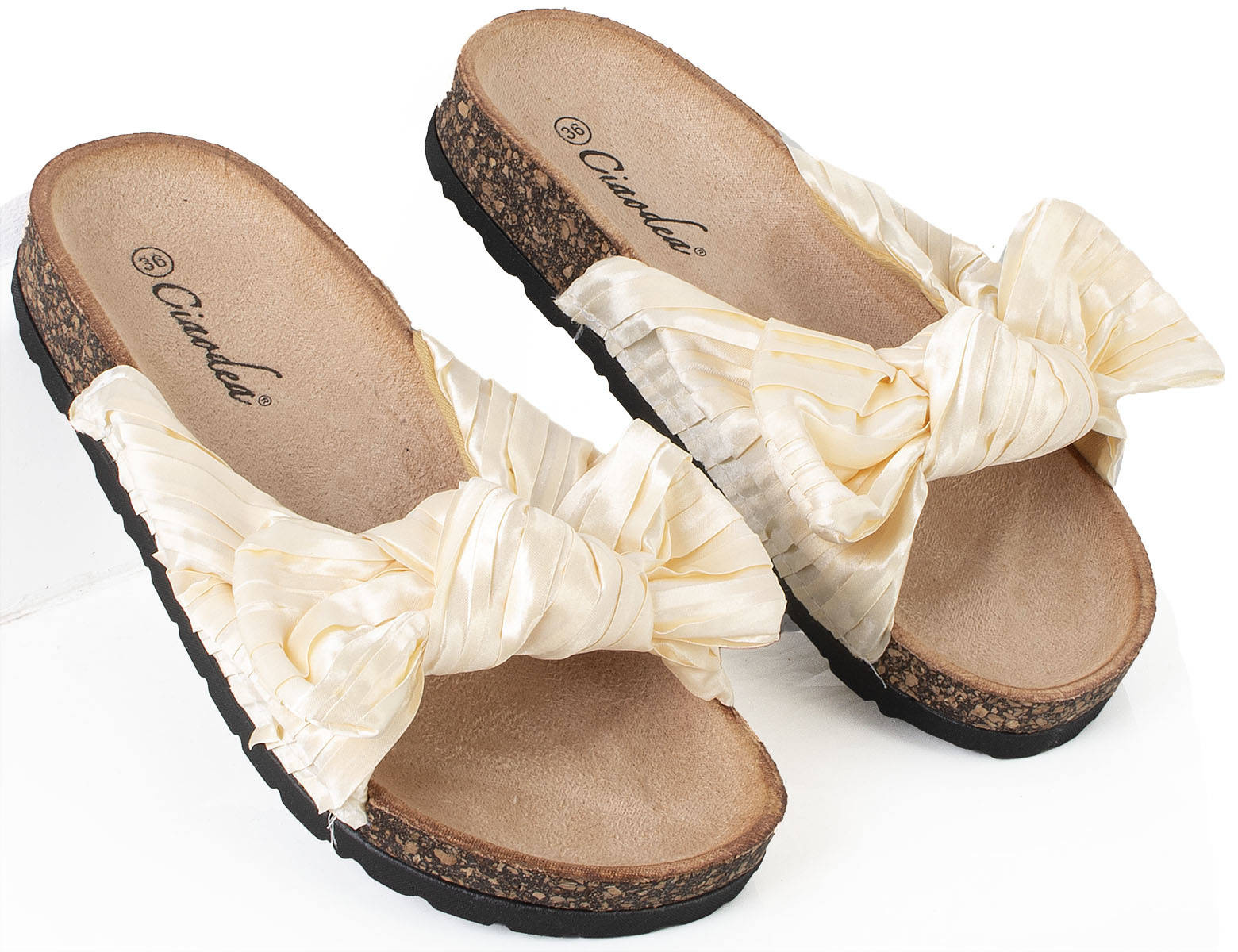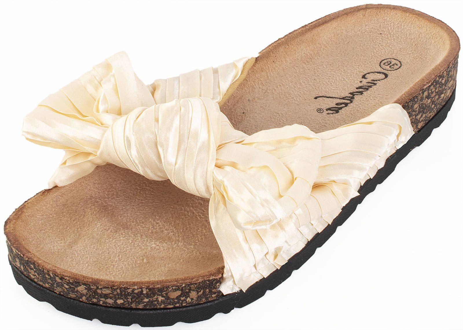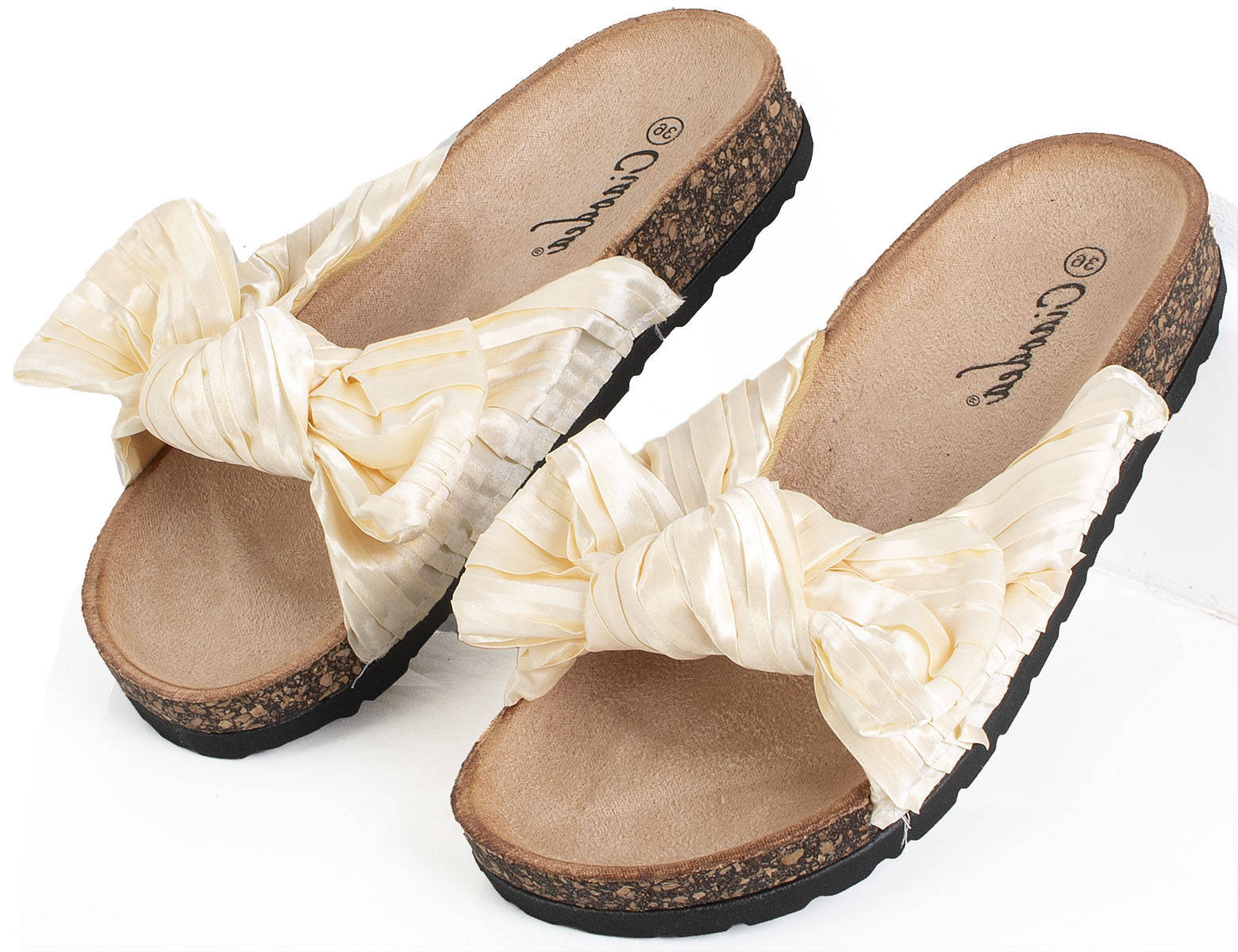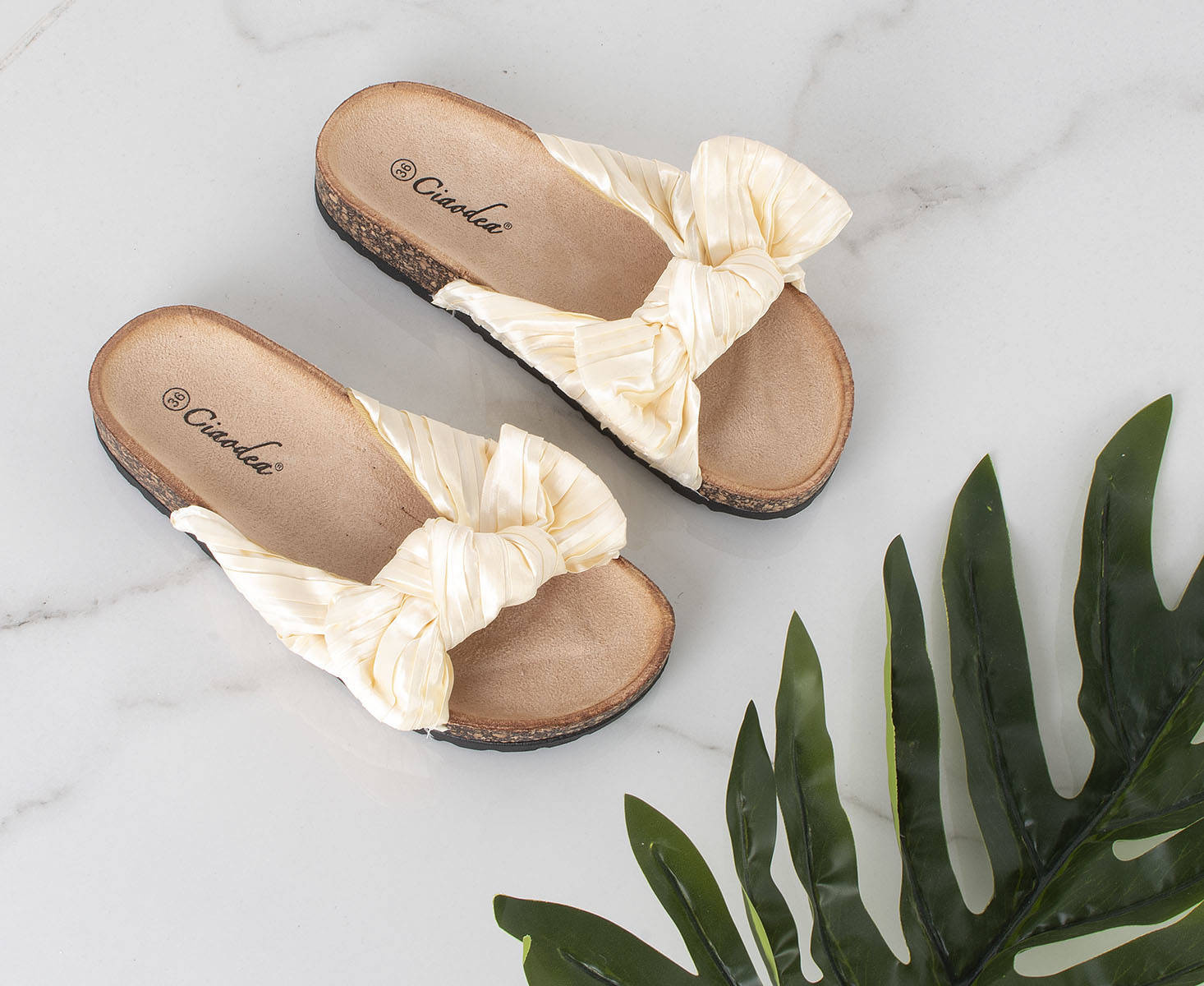 Klasyczne klapki z ekoskóry z kokardą. Obuwie na płaskiej podeszwie. Wygodne i uniwersalne, sprawdzą się na upalne i słoneczne letnie dni!