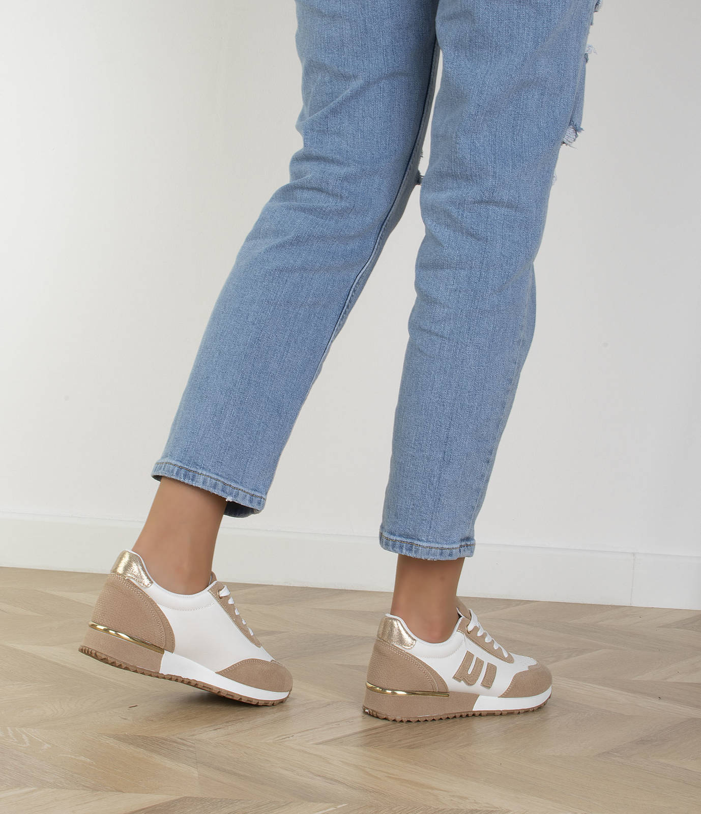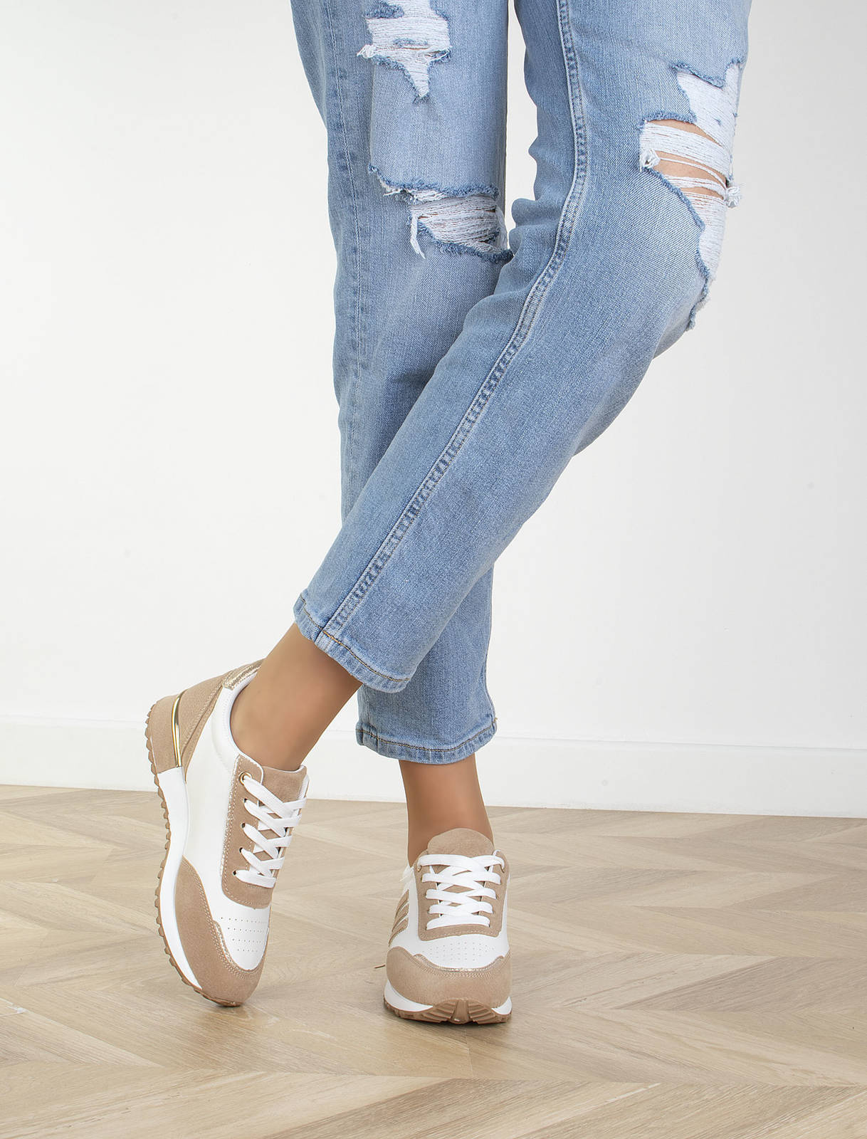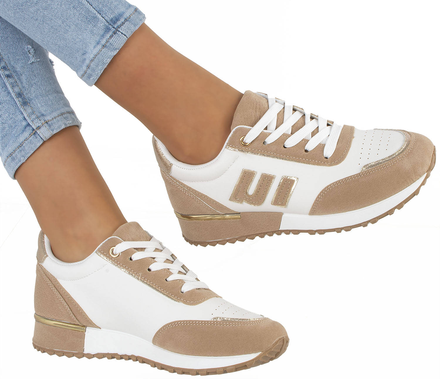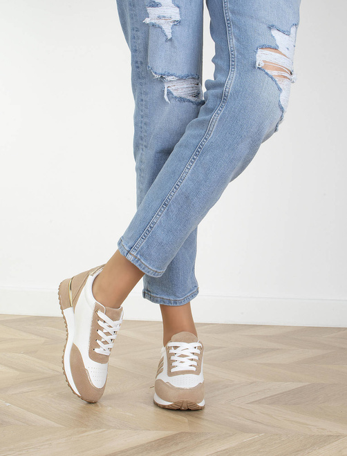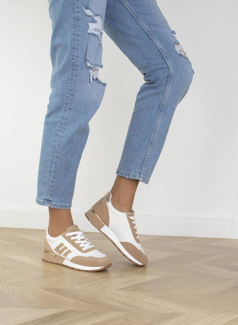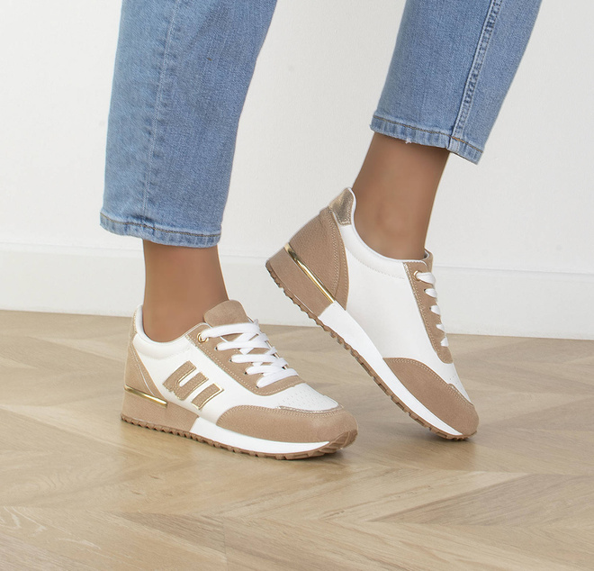 Jeśli szukasz idealnych butów na wiosenne dni, to beżowe sneakersy sportowe trampki są idealnym wyborem. Wykonane są z wysokiej jakości ekoskóry w połączeniu z wstawkami z zamszu, dzięki czemu są nie tylko trwałe, ale również bardzo stylowe. Choć są to buty sportowe, możesz je nosić na co dzień, gdyż są bardzo wygodne. Wkładka tkaninowa zapewnia Ci komfortowe użytkowanie, a sznurowane zamknięcie sprawia, że cholewka sięga do kostki. Piękny układ kolorystyczny sprawia, że buty idealnie pasują do wiosennych stylizacji. Beżowe sneakersy sportowe trampki to idealny wybór dla wszystkich kobiet, które lubią wyglądać modnie i czuć się wygodnie.