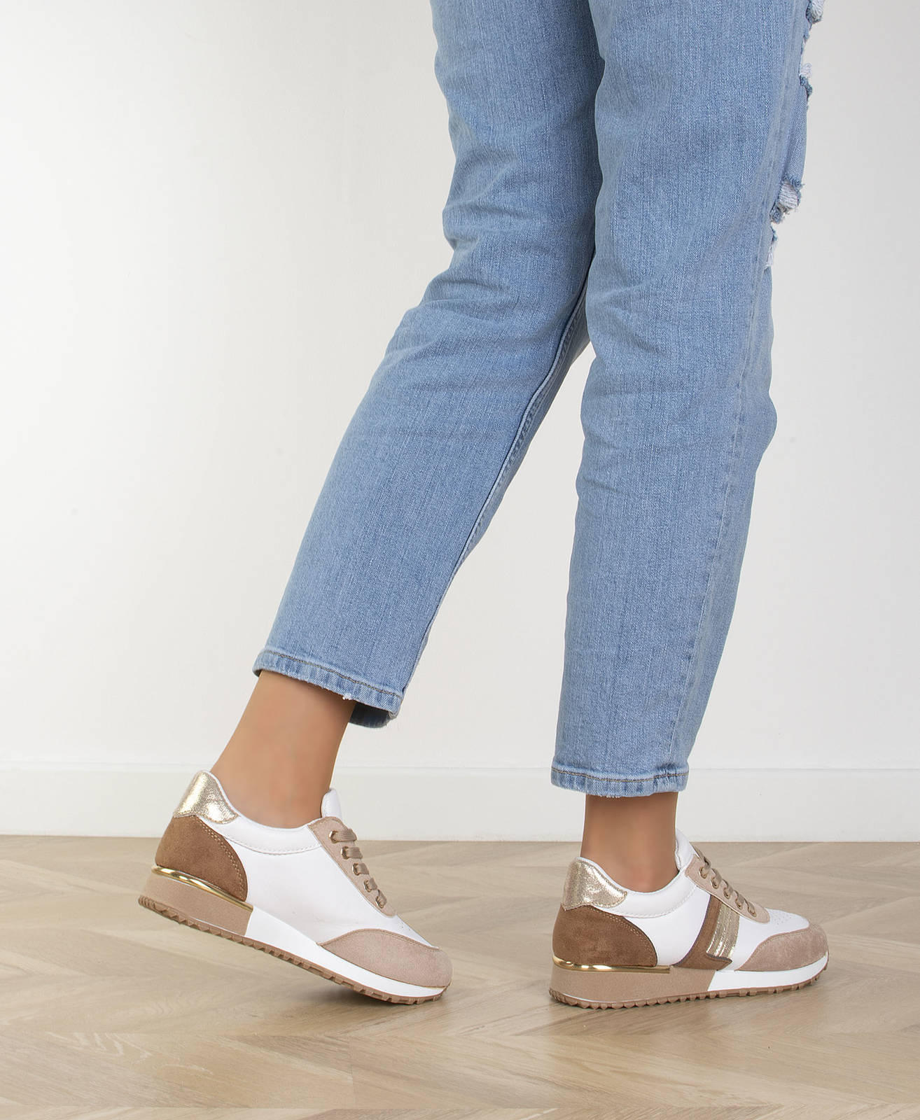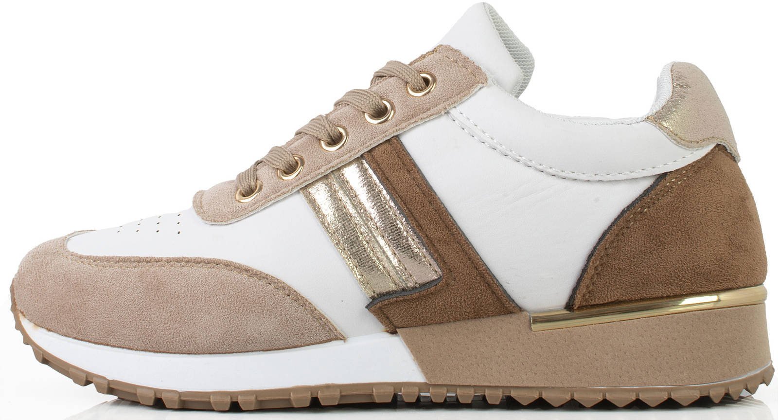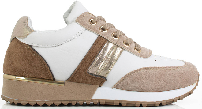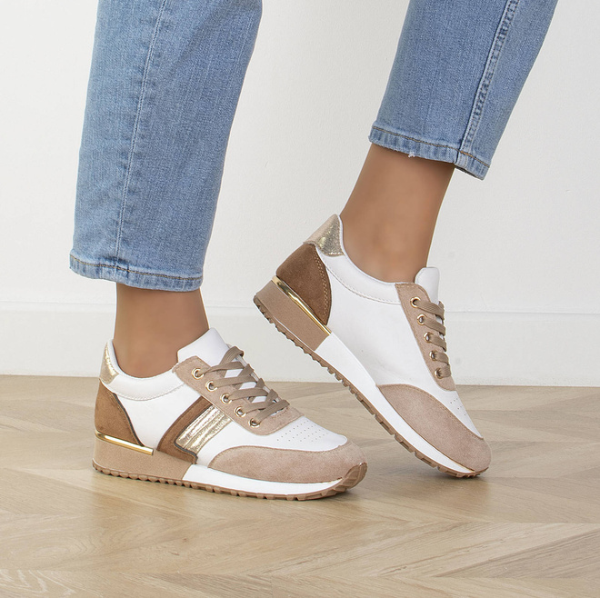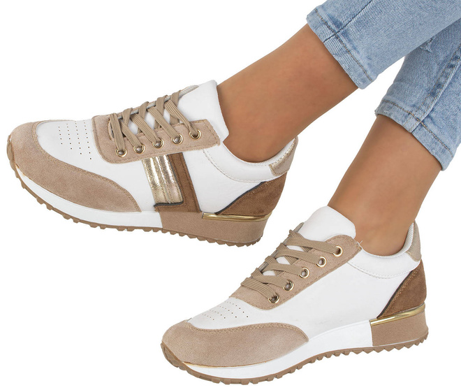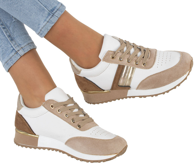 • Jeśli szukasz idealnych butów na wiosenne dni, to beżowe sneakersy sportowe trampki są idealnym wyborem. Wykonane są z wysokiej jakości ekoskóry w połączeniu z wstawkami z zamszu.