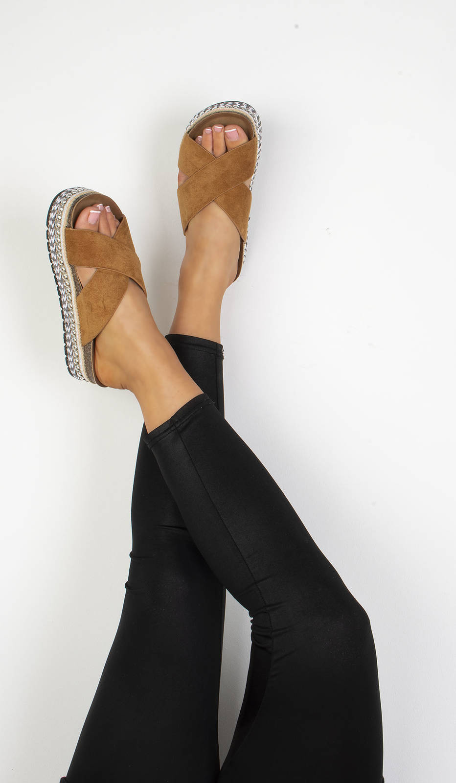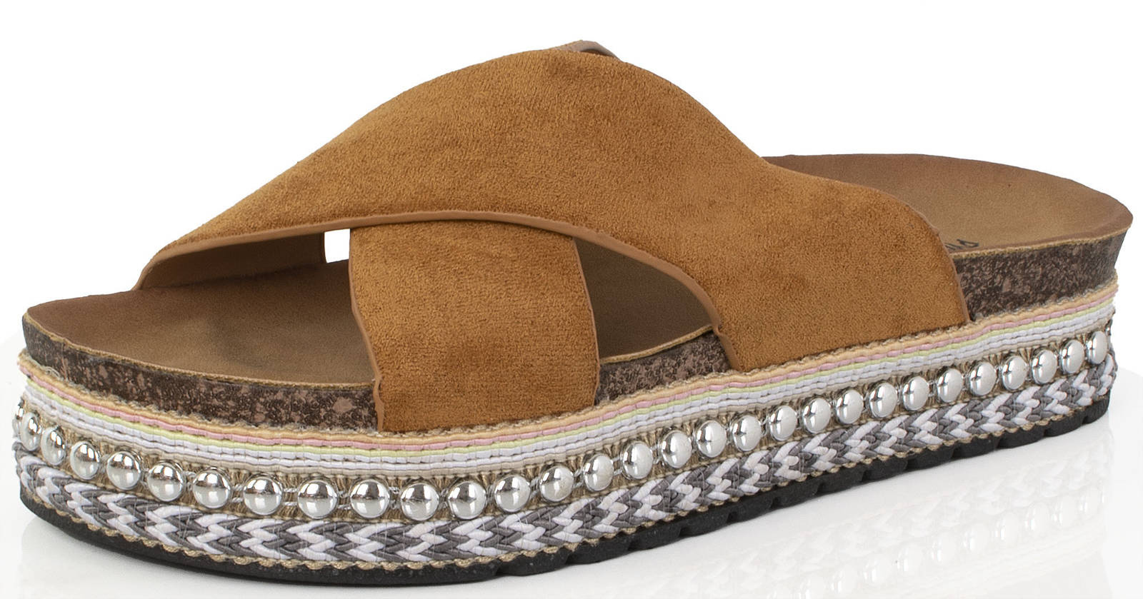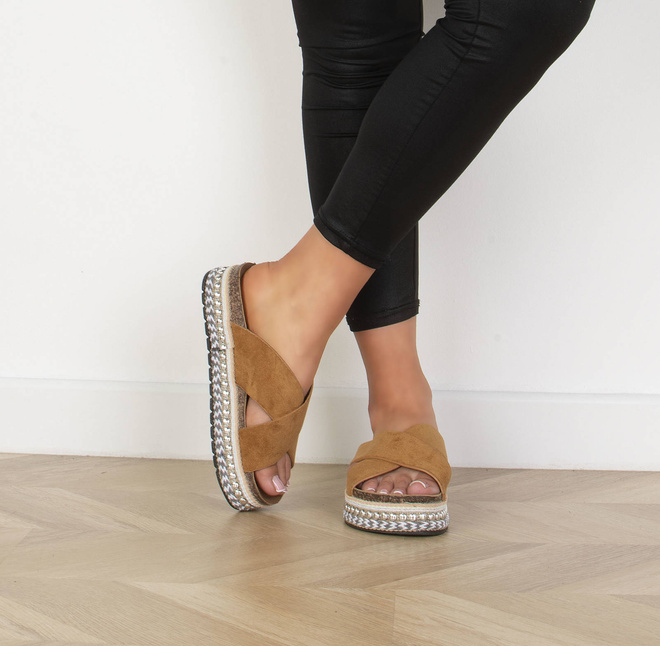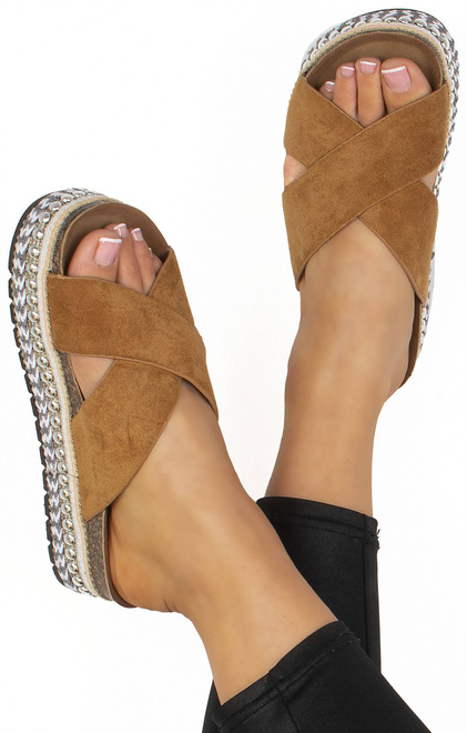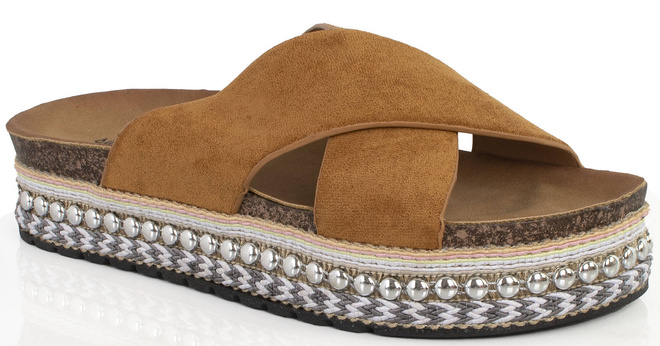 Klapki na platformie to wygodne i modne obuwie, które jest idealne dla kobiet, które chcą zaakcentować swój styl. Klapki typu espadryle są wykonane z wysokiej jakości materiałów, a ich cholewka wykończona jest miękkim zamszem. Paski na cholewce zapewniają idealne dopasowanie, a wygodna zdobiona podeszwa typu platforma zapewnia dodatkowy komfort. Dzięki tym klapkom możesz wyglądać modnie i czuć się wygodnie przez cały dzień.