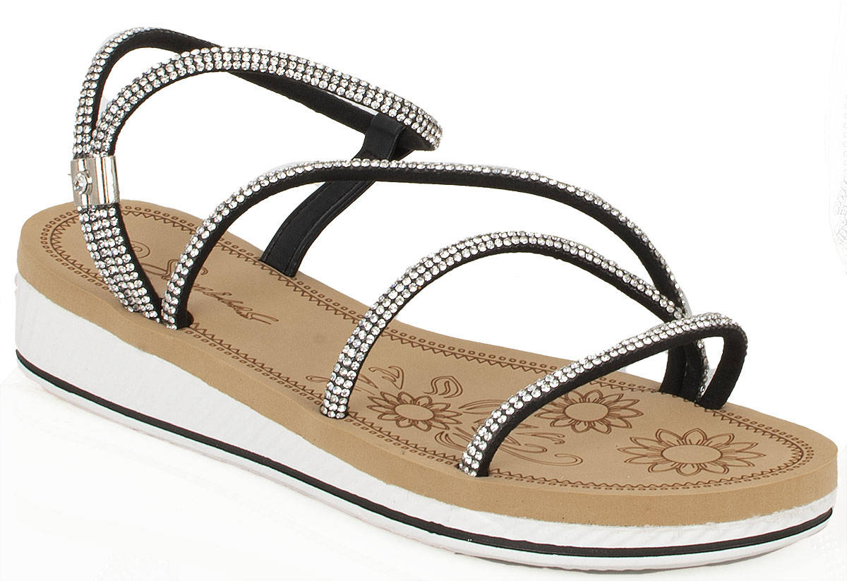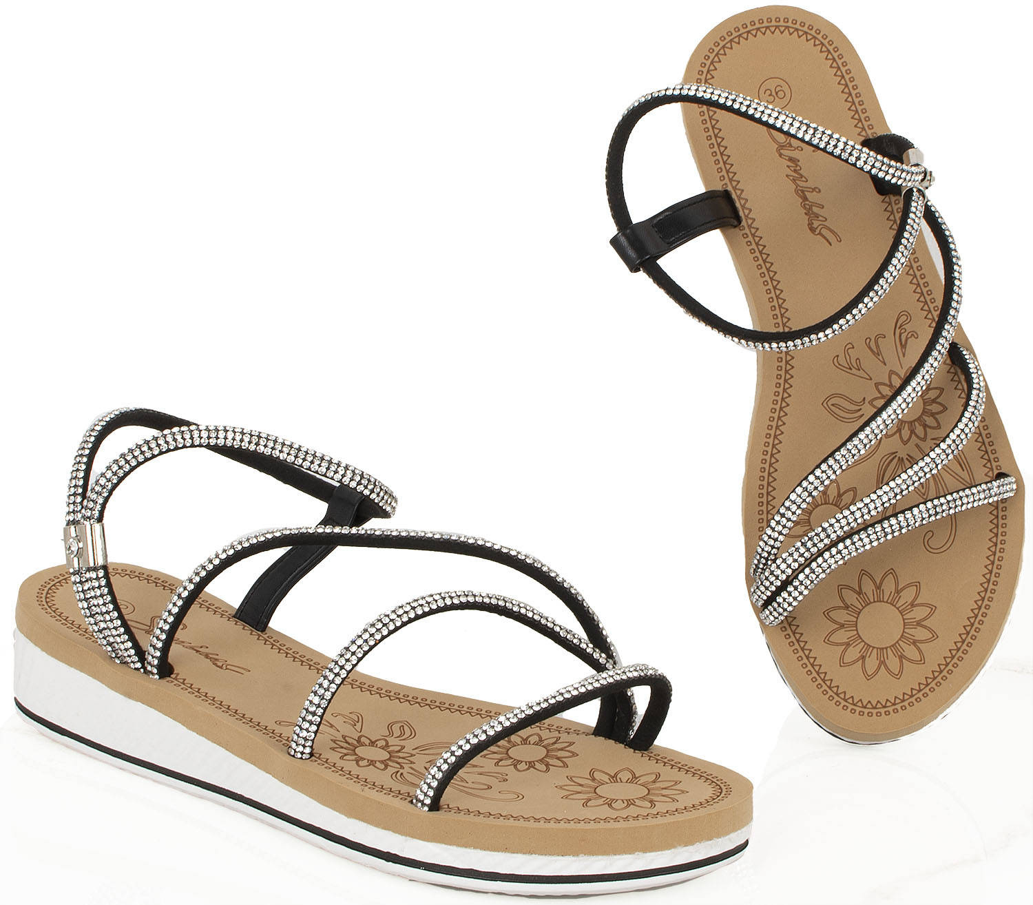 Sandały z cyrkoniami to idealny wybór dla kobiet, które szukają pięknego i eleganckiego uzupełnienia swojego wyglądu. Ten model ma płaską podeszwę, która zapewnia wygodę i komfort oraz paski ozdobione cyrkoniami, które pięknie prezentują się na nodze. Sandały z cyrkoniami są idealne na wyjścia do klubu, wyjścia ze znajomymi lub na romantyczną kolację. Wykonane z wysokiej jakości materiałów, te sandały są trwałe i wytrzymałe. Te sandały są łatwe w czyszczeniu i będą służyć Ci przez długi czas. Wybierz te sandały i ciesz się pięknym wyglądem i wygodą.