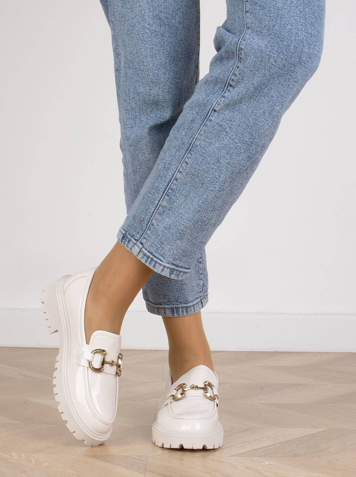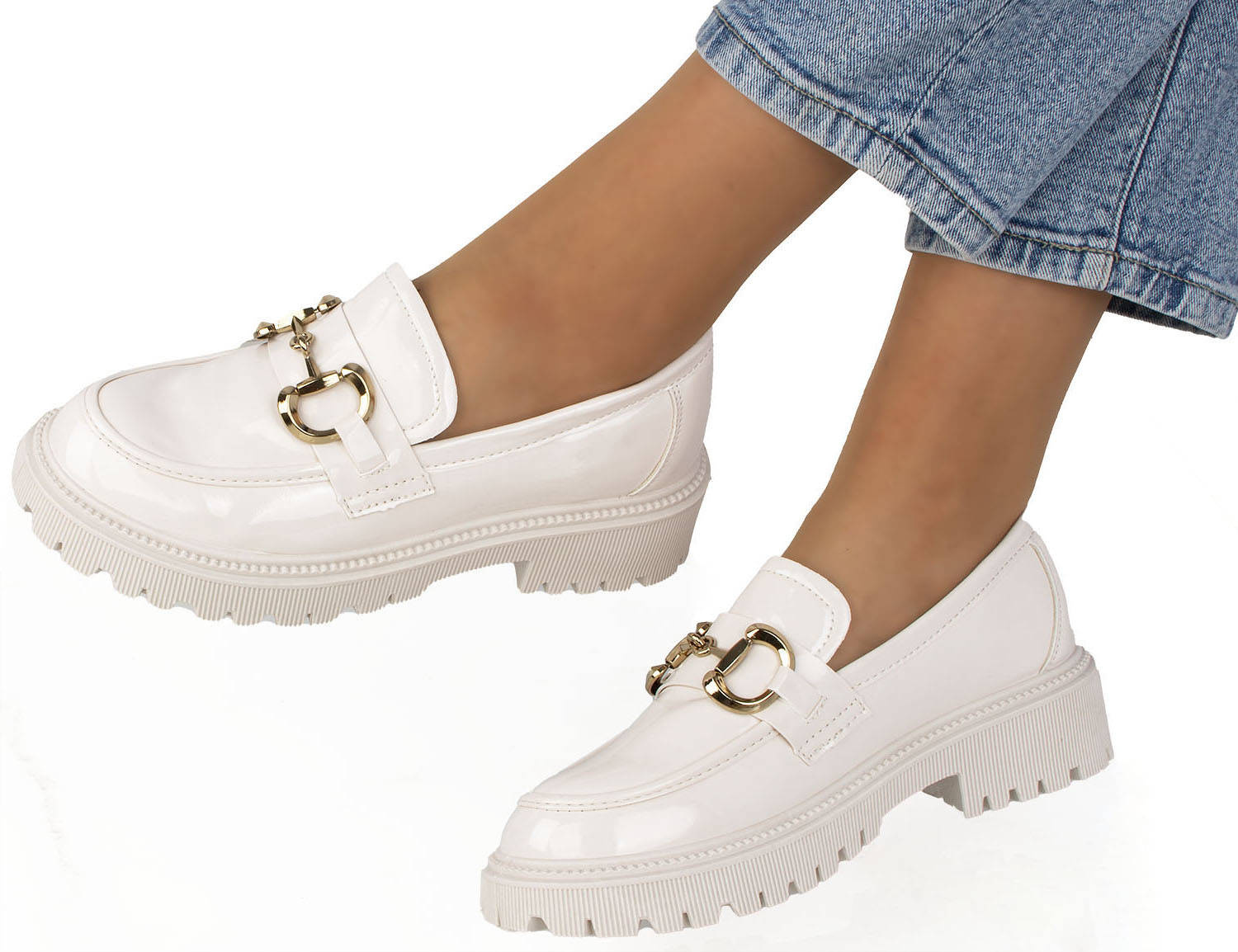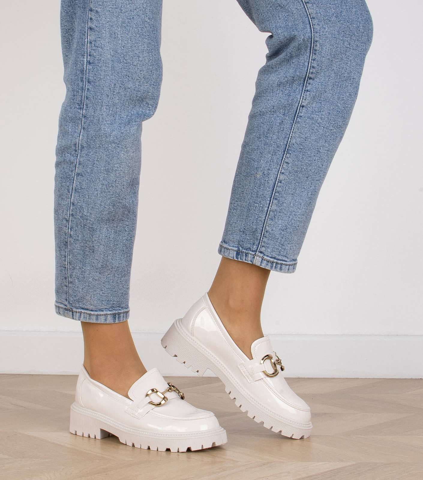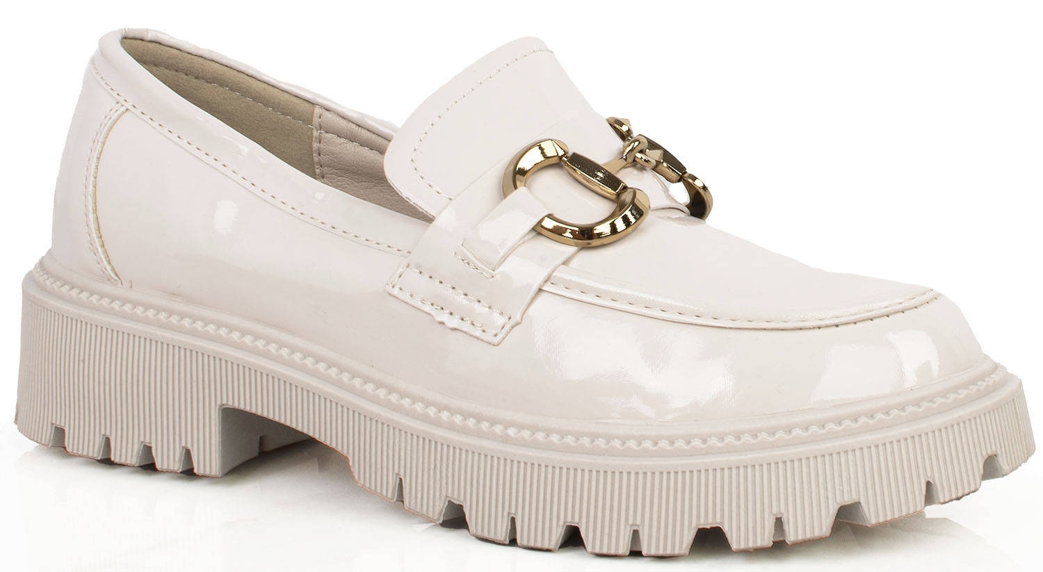 KREMOWE MOKASYNY LAKIEROWANE Z ŁAŃCUCHEM KARA