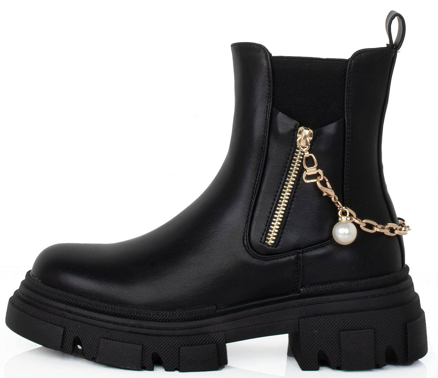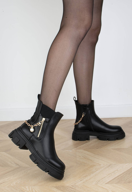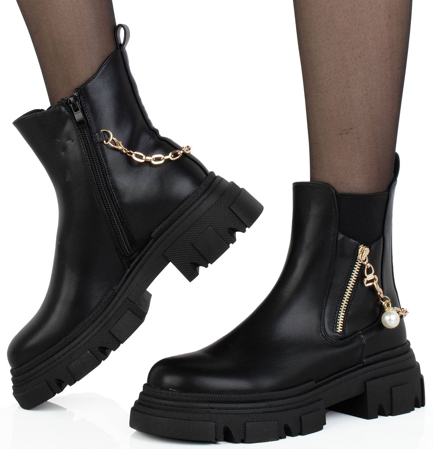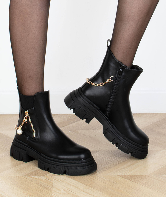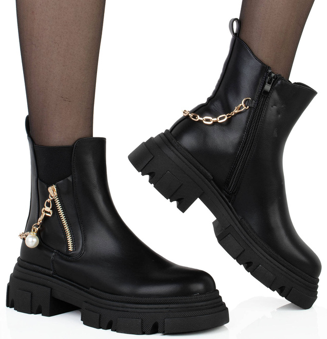 Stylowe botki na platformie, które łączą w sobie wygodę, modny design i subtelny akcent ozdobny w postaci łańcuszka wokół cholewki. Ten model botków to idealny wybór dla osób ceniących komfort i elegancję.