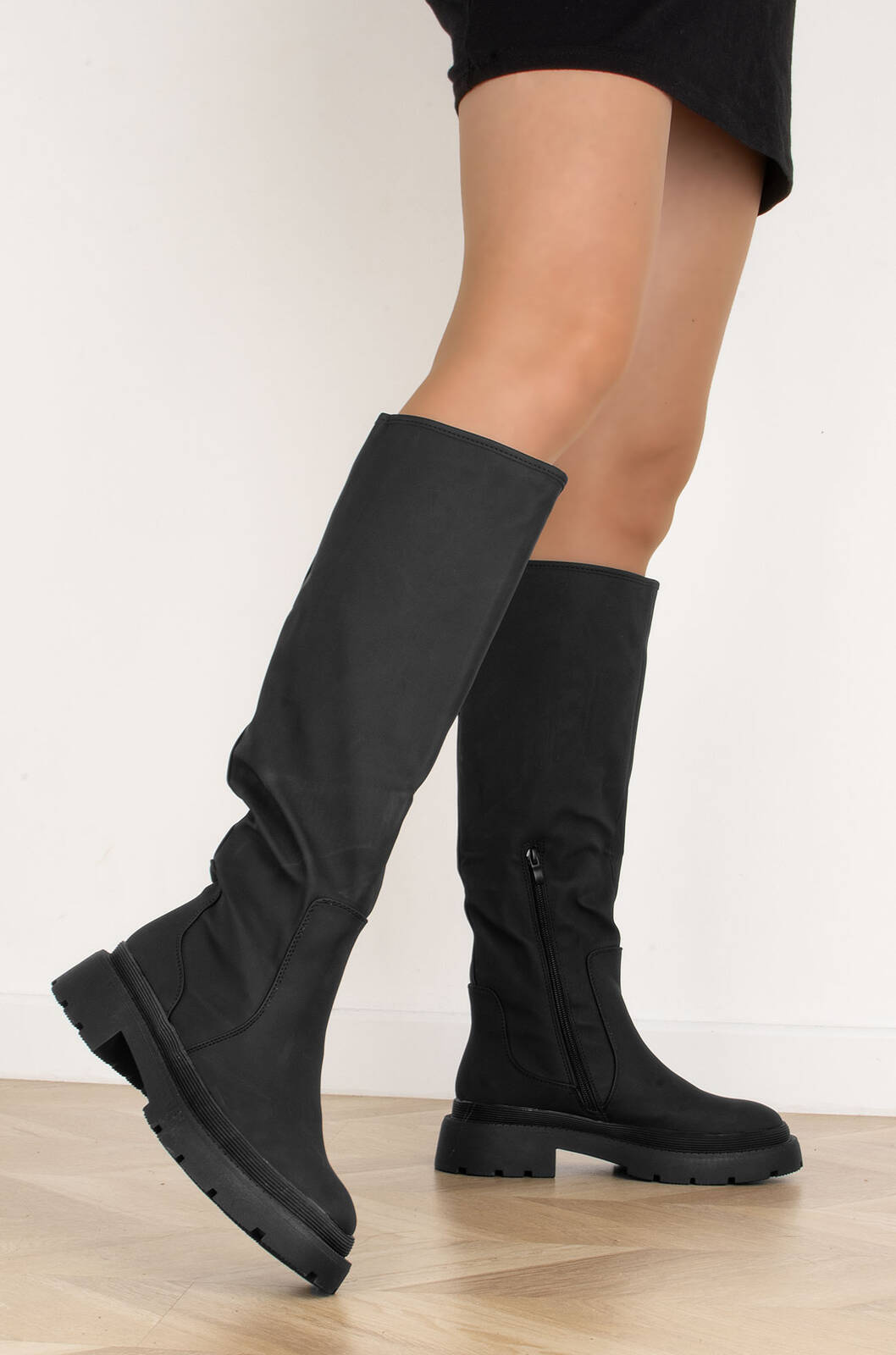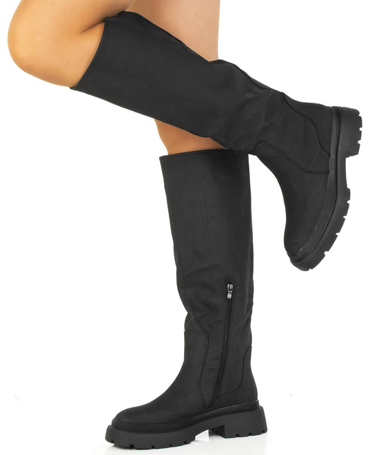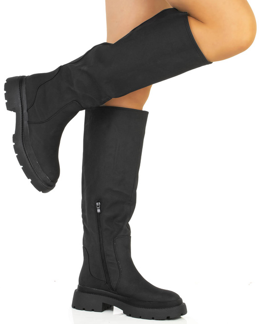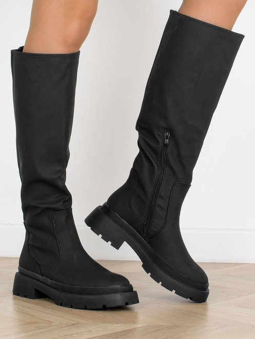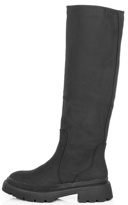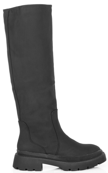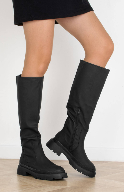 Cholewka kozaków wykonana jest z matowej ekoskóry, która imituje wygląd prawdziwej skóry, jednocześnie będąc przyjazną dla środowiska. Płaski obcas na platformie dodaje butom elegancji, a jednocześnie zapewnia stabilność podczas chodzenia. Platforma pomaga rozkładać ciężar ciała równomiernie na stopie, co zmniejsza uczucie zmęczenia podczas długotrwałego noszenia.