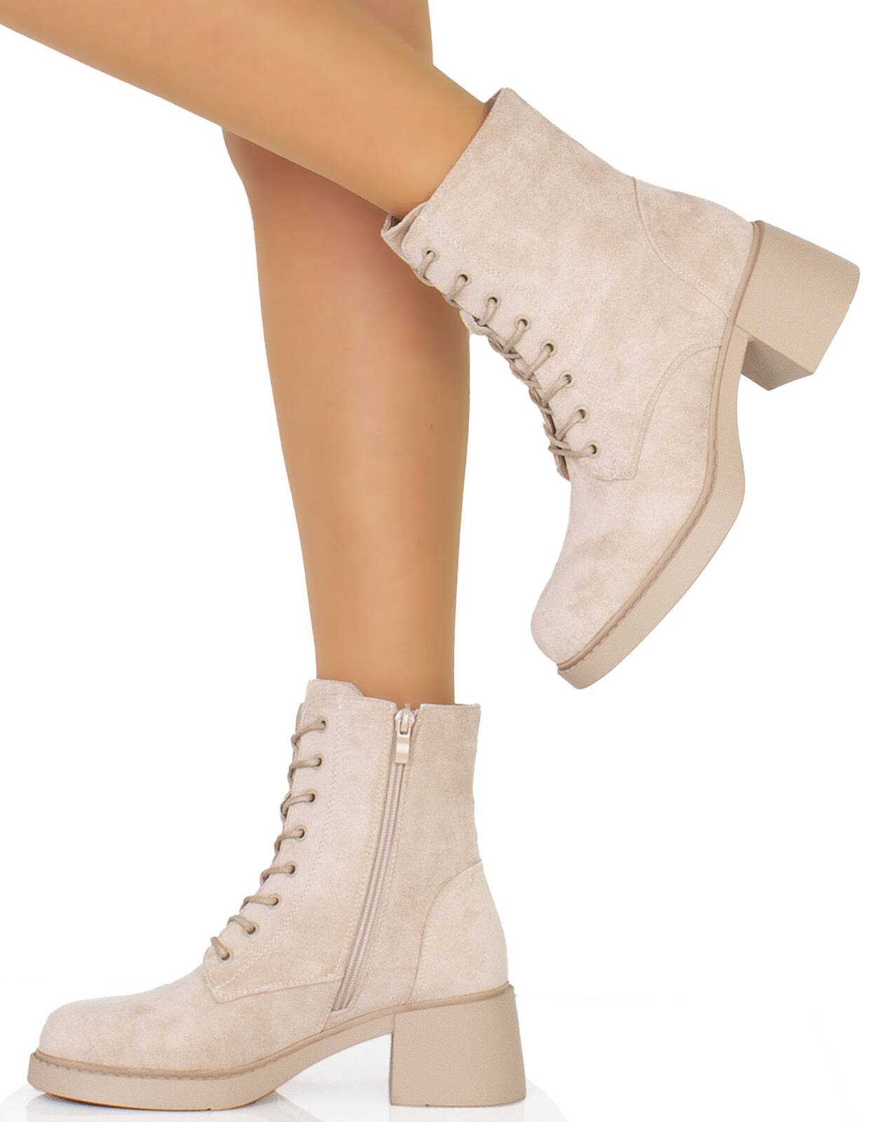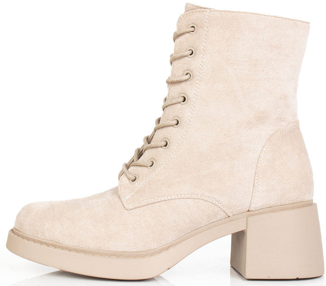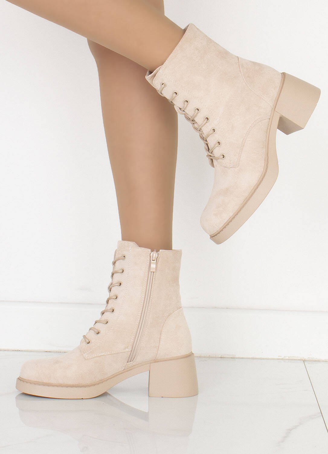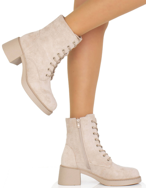 BEŻOWE ZAMSZOWE BOTKI TRAPERY NA OBCASIE GWEN
