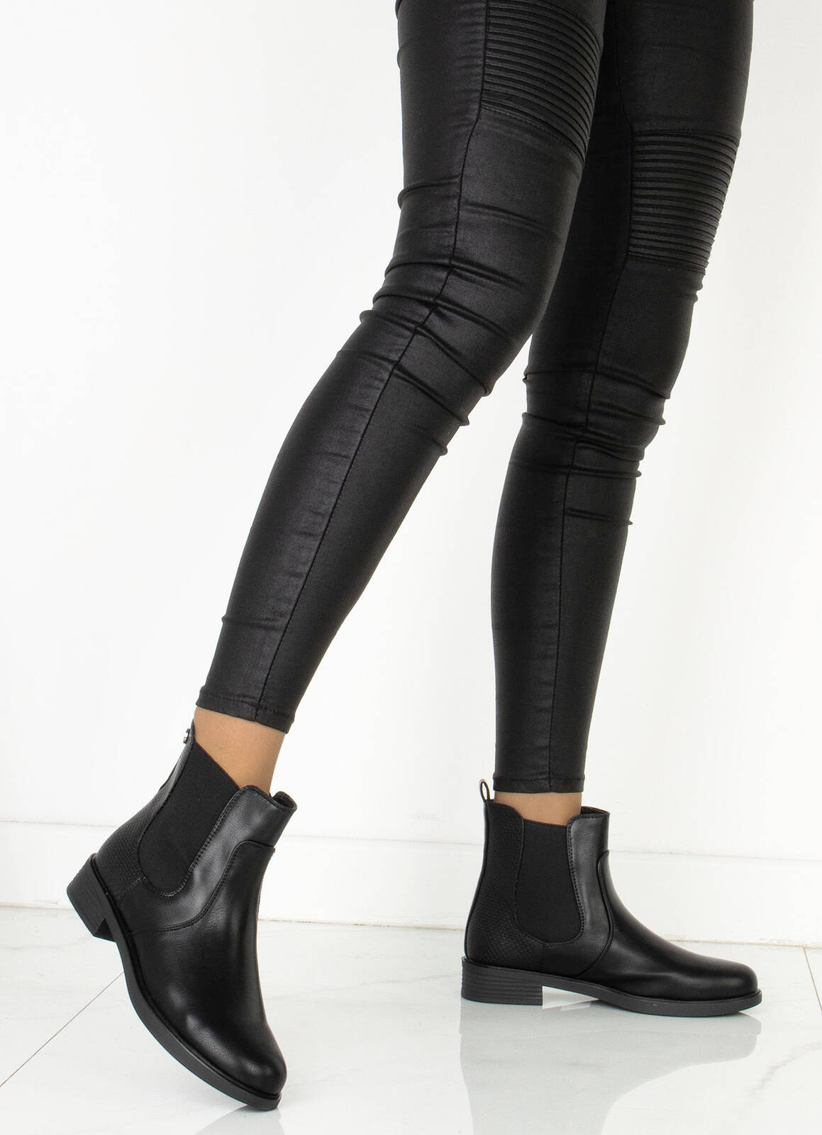 Skórzane botki sztyblety, charakteryzujące się klasycznym designem i wygodnym wsuwaniem.