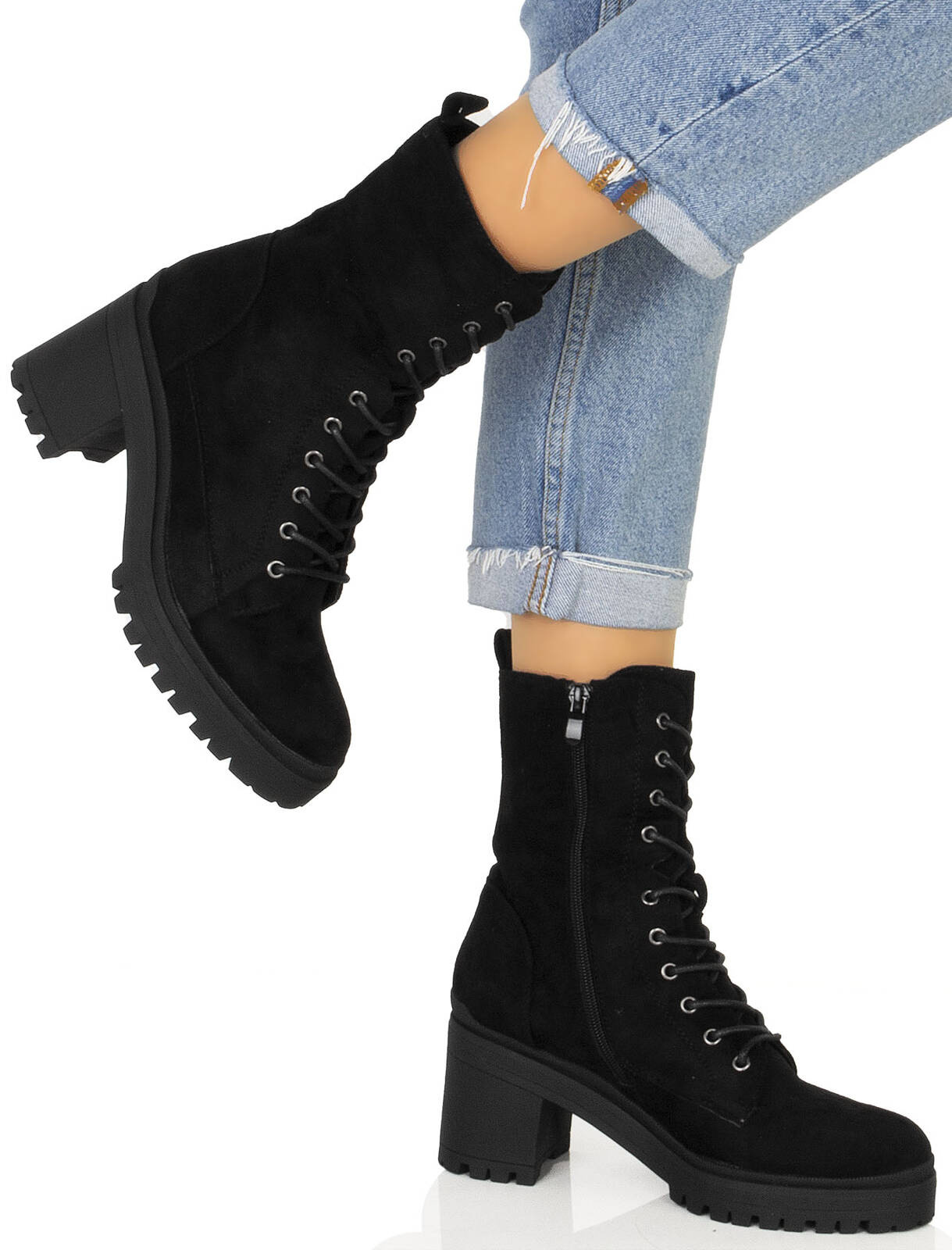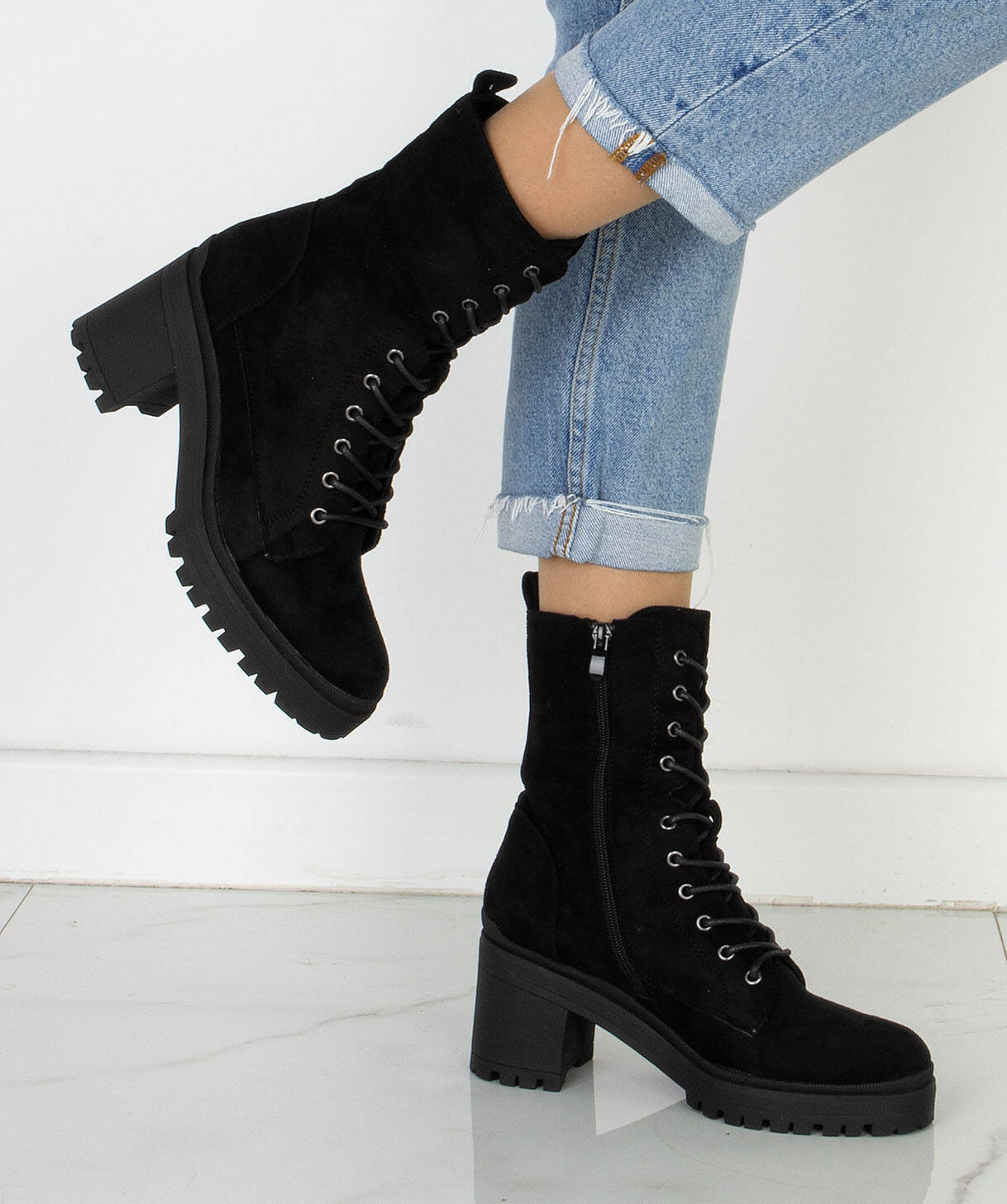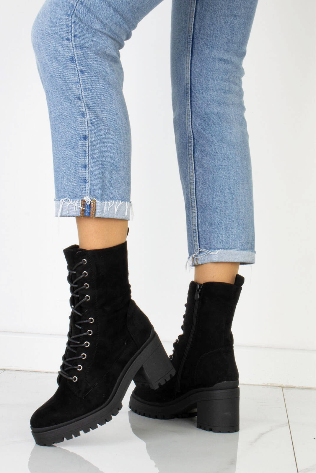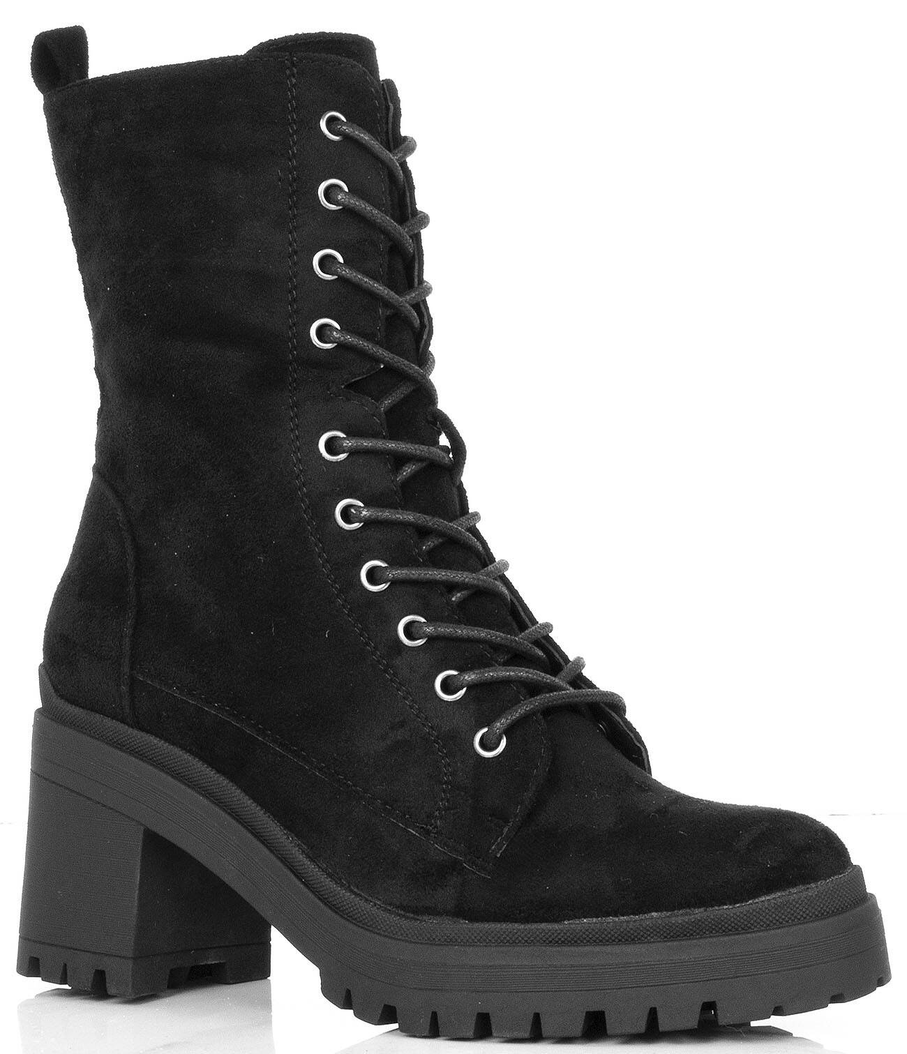 Cholewka botków została wykonana z miękkiego zamszu, co nadaje im przyjemny w dotyku i luksusowy wygląd. Sznurowanie oraz zapięcie na suwak z boku cholewki pozwalają na dokładne dopasowanie obuwia do kształtu stopy oraz ułatwiają zakładanie i zdejmowanie butów.