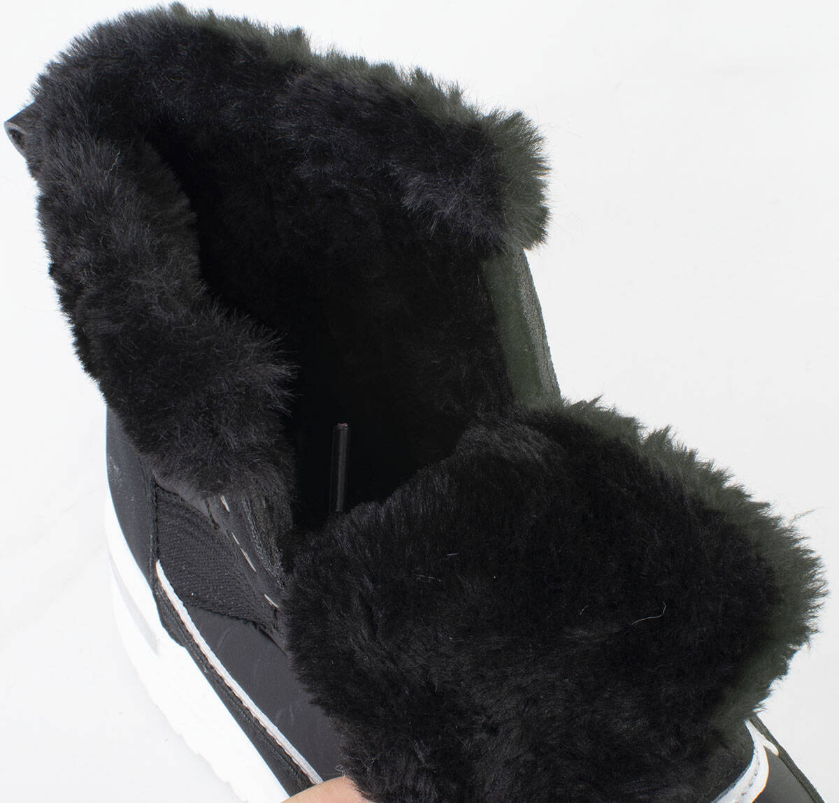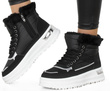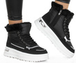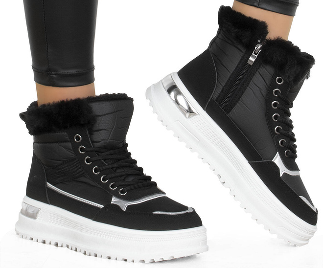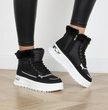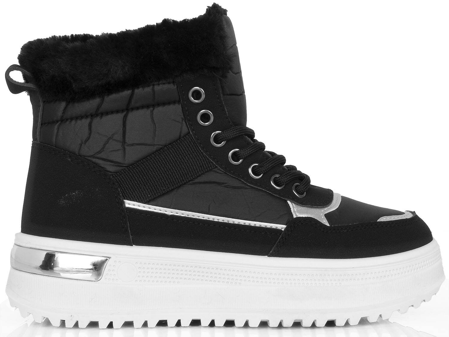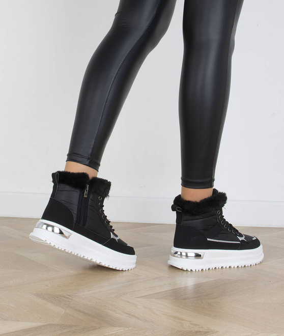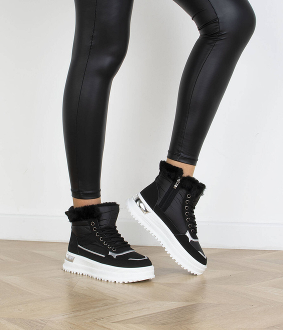 Czarne ocieplane sneakersy botki na platformie, sznurowane, idealne na chłodniejsze dni, łączące w sobie sportowy styl z wygodą.