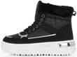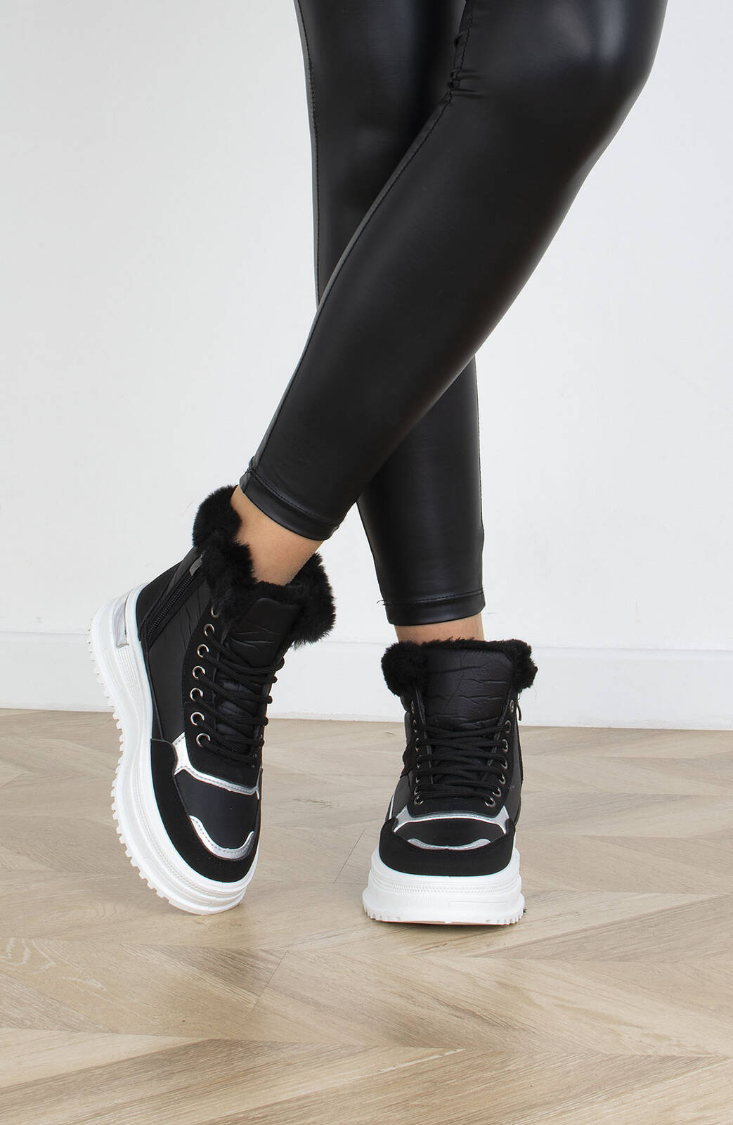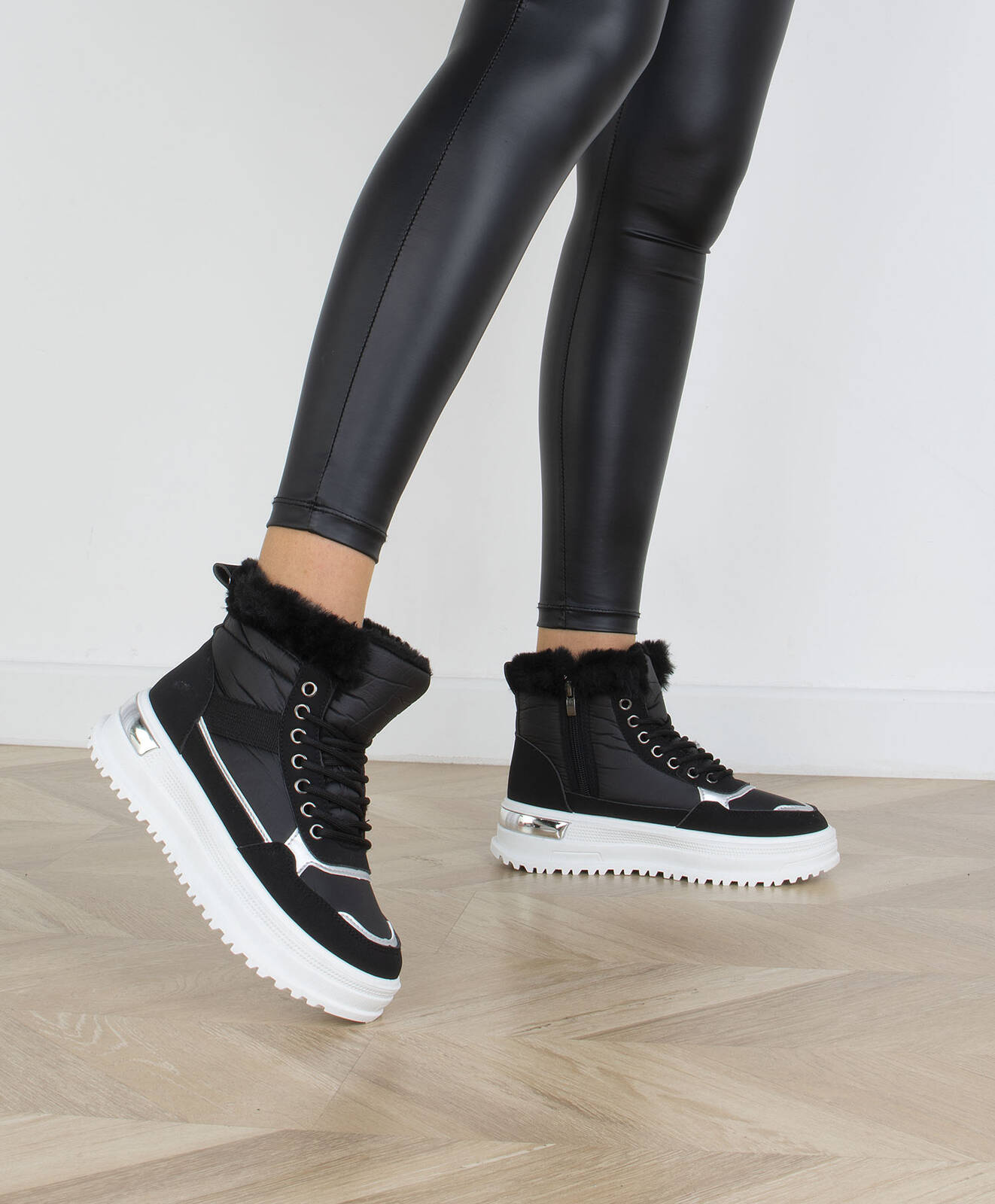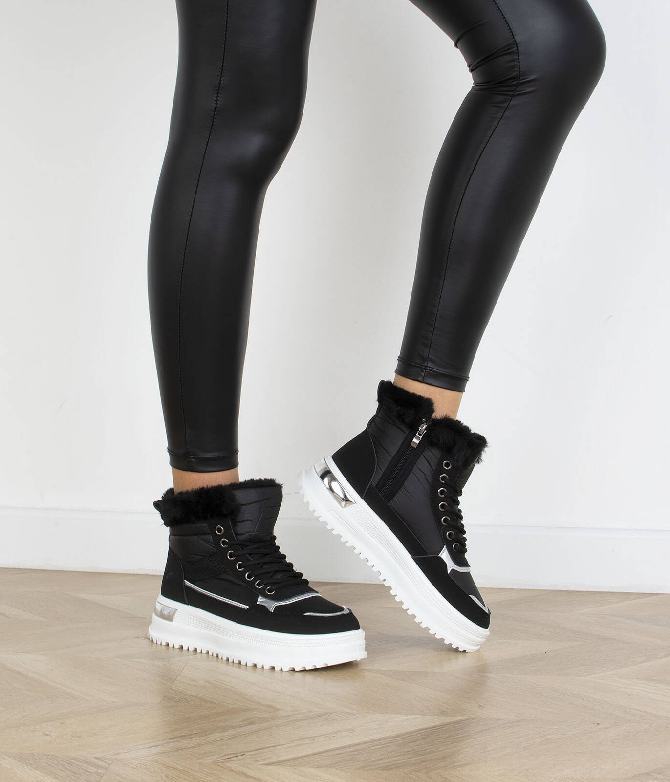Czarne ocieplane sneakersy botki na platformie, sznurowane, idealne na chłodniejsze dni, łączące w sobie sportowy styl z wygodą.