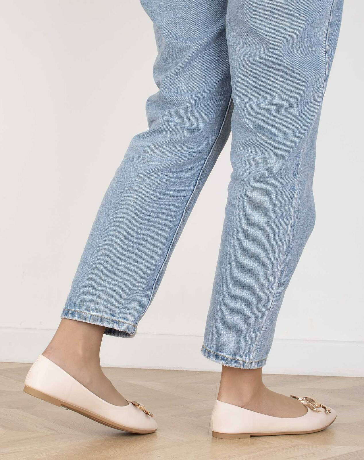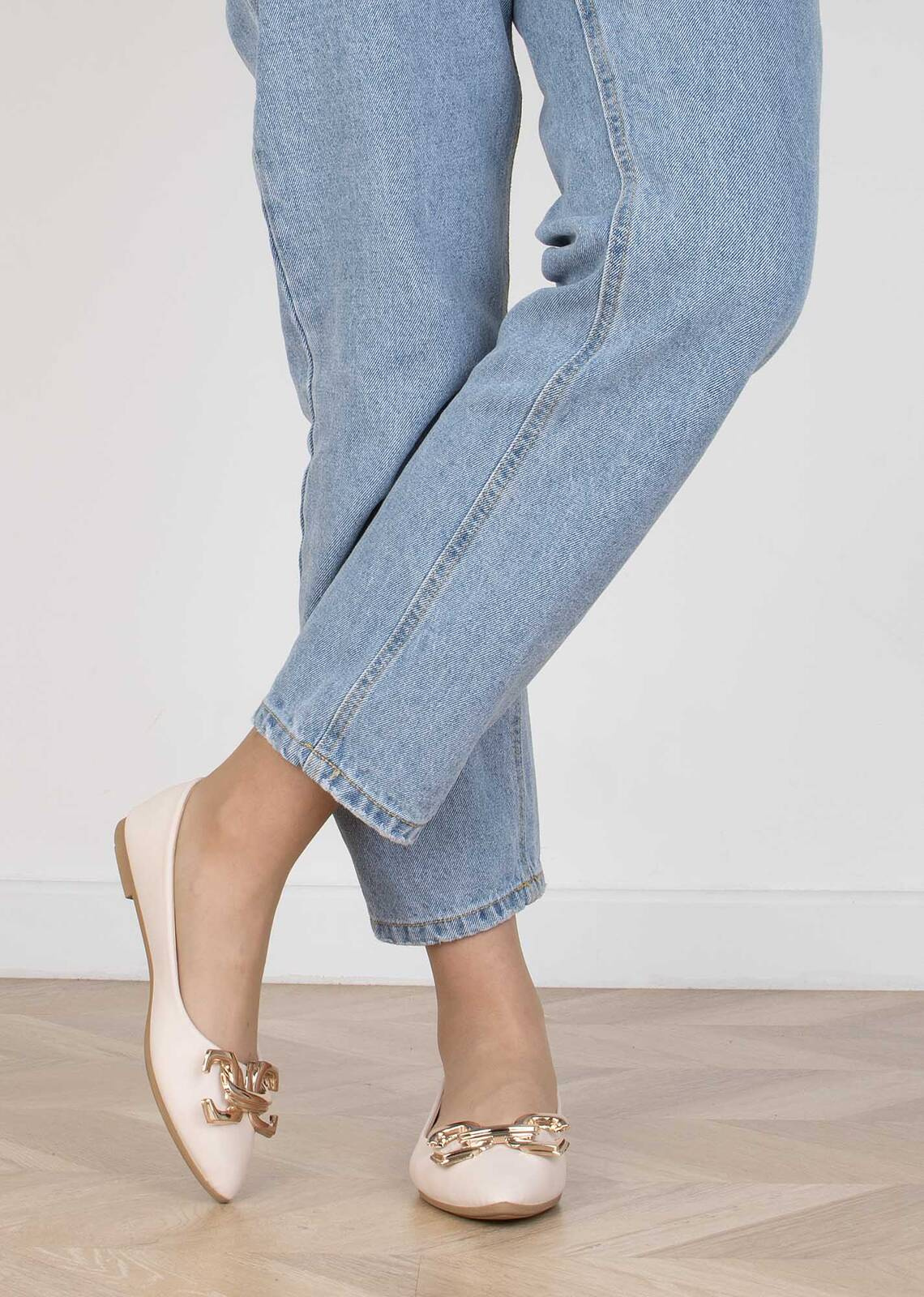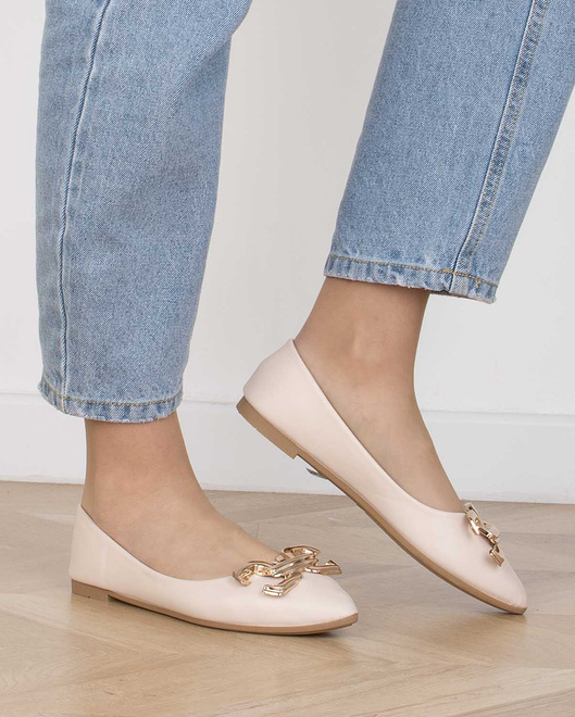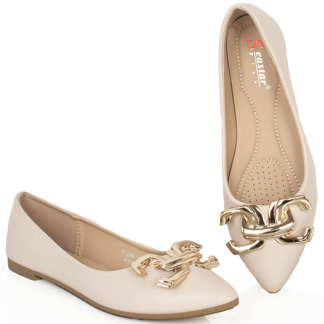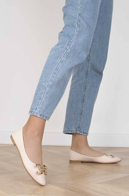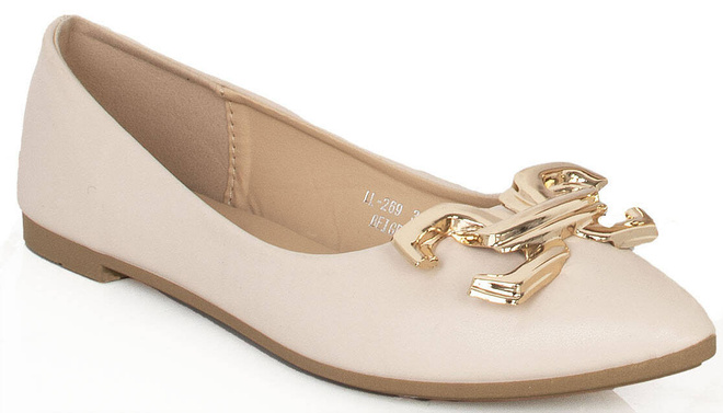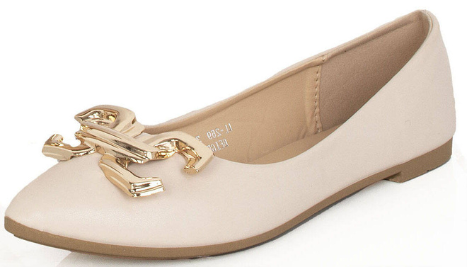 Balerinki, czyli półbuty wykonane z ekoskóry z dodatkową złotą ozdobą - eleganckie i wygodne obuwie, idealne na wiele różnych okazji.