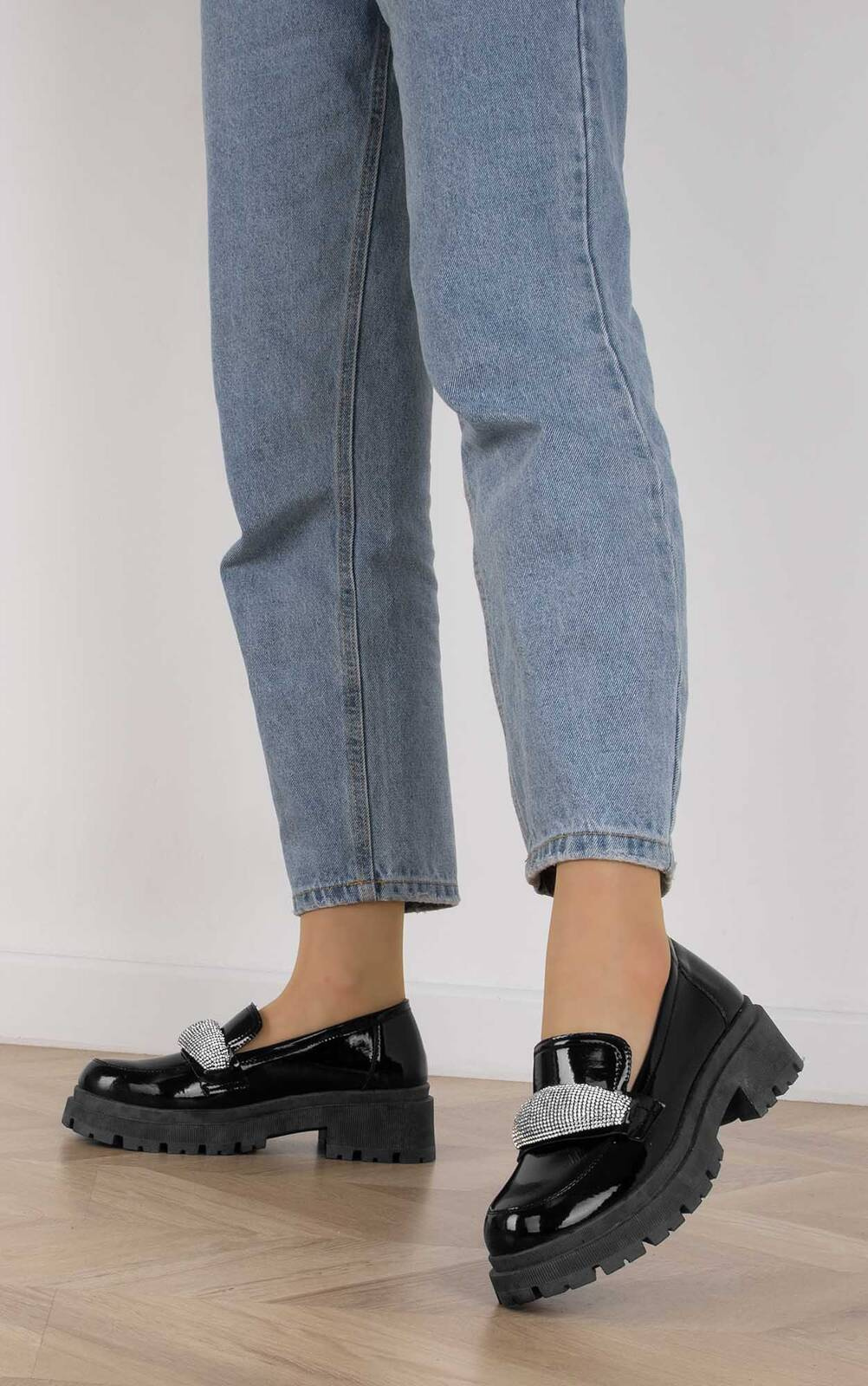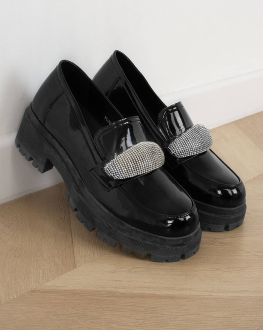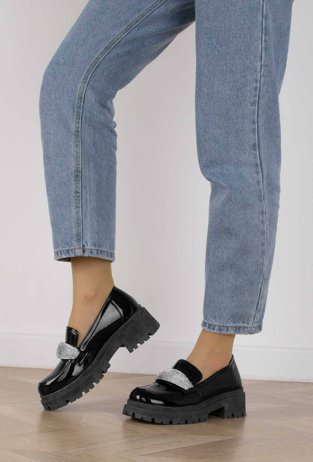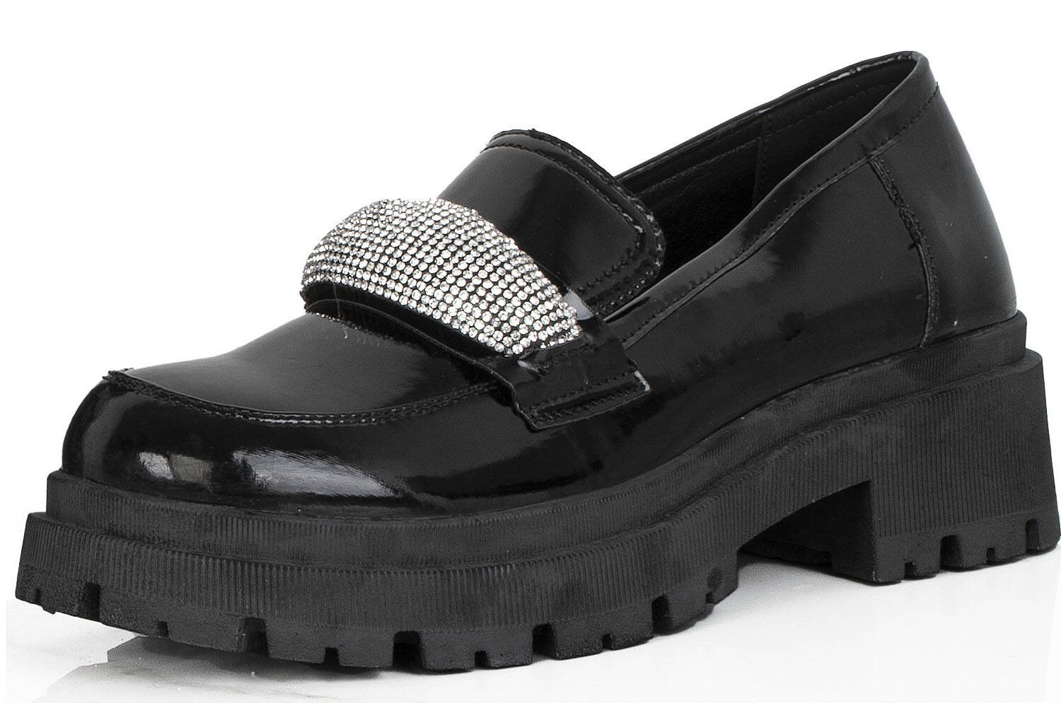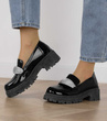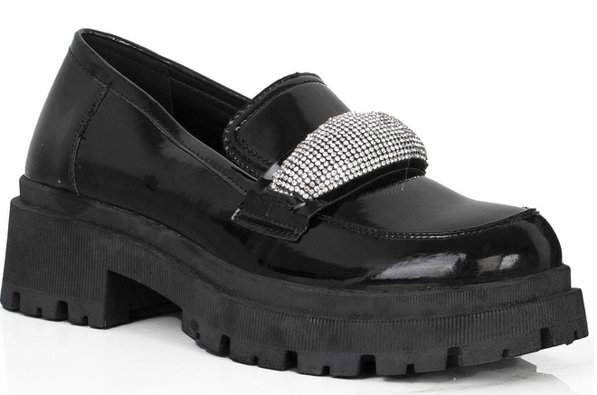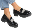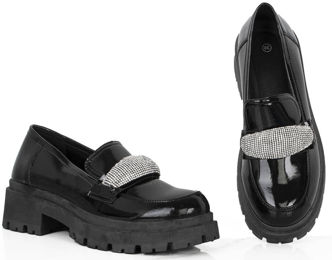 Klasyczne damskie mokasyny wykonane z wysokiej jakości skóry ekologicznej lakierowanej. Te mokasyny półbuty lakierowane z srebrną ozdobą to idealny dodatek do Twojej garderoby, który doda niepowtarzalnego blasku i stylu każdej stylizacji, charakterystyczną cechą tych mokasynów jest srebrna ozdoba umieszczona na cholewce, która dodaje im oryginalności i wyjątkowego wyglądu. To subtelny akcent, który przyciąga wzrok i nadaje butom unikalnego charakteru. Półbuty na wygodnej, profilowanej platformie. Obuwie lekkie i wygodne, najmodniejszy fason tego wiosennego sezonu!