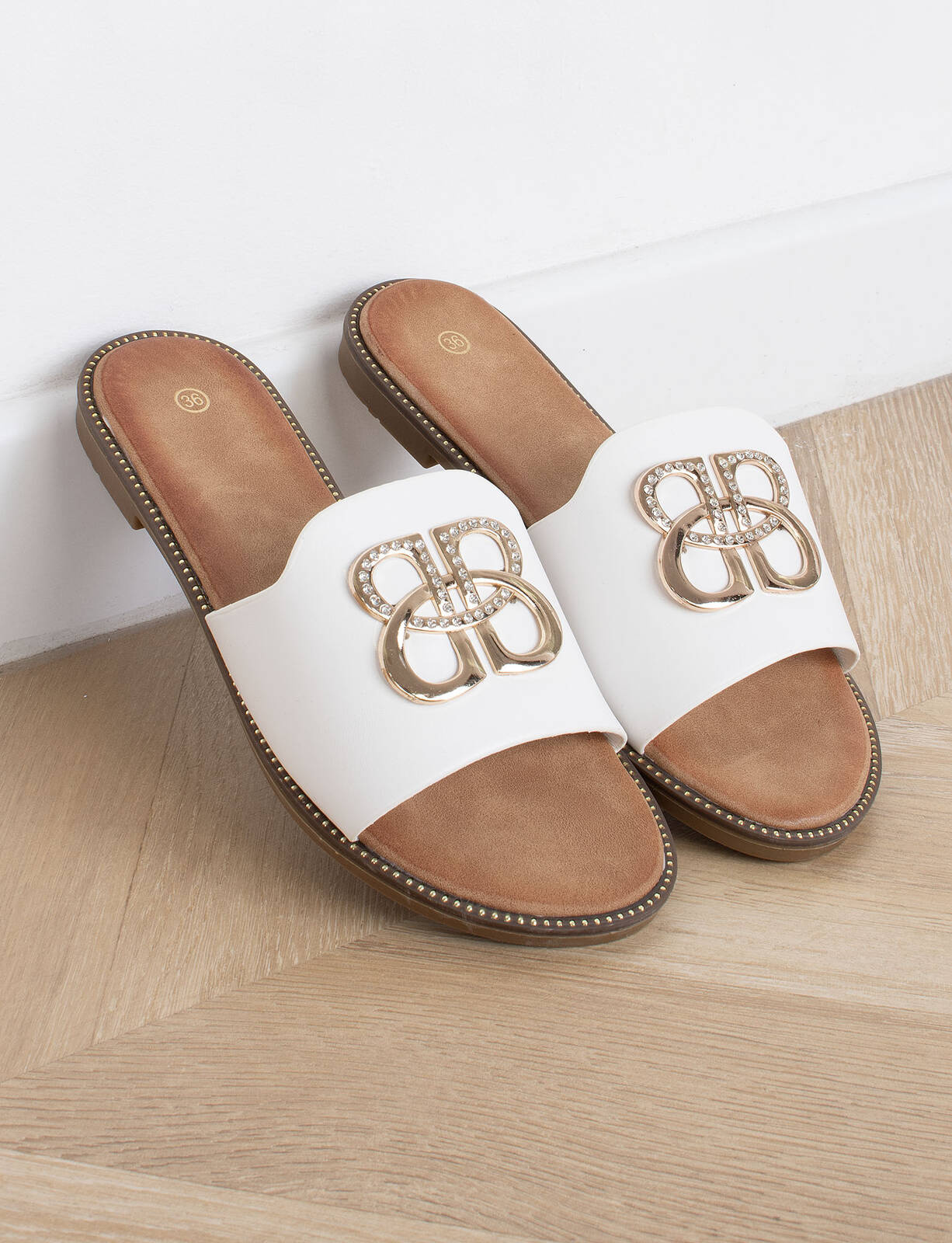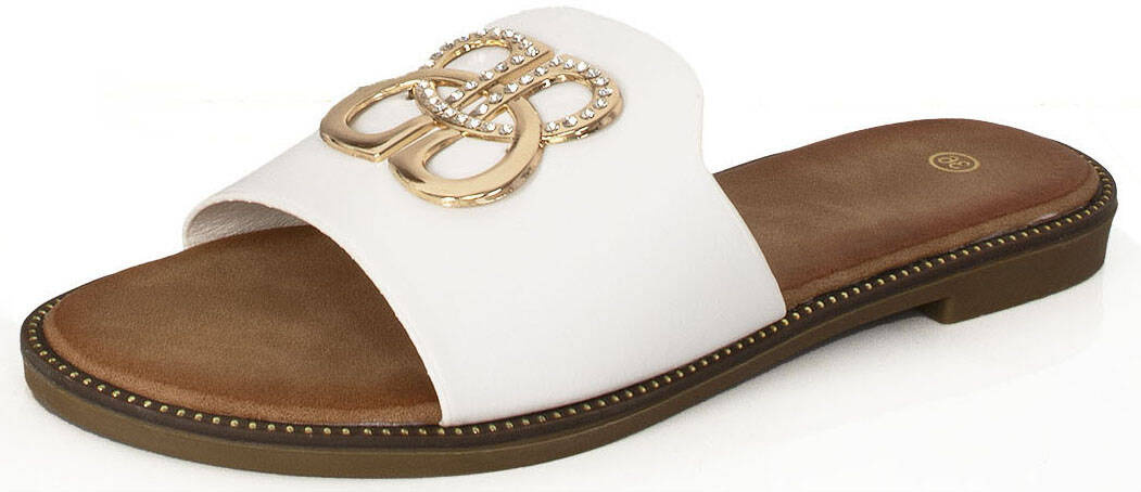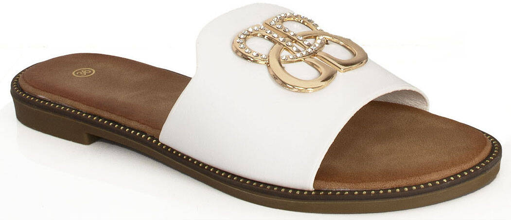 BIAŁE DAMSKIE SKÓRZANE KLAPKI ELEGANCKIE OZDOBA