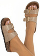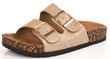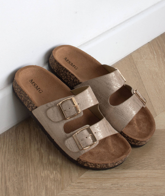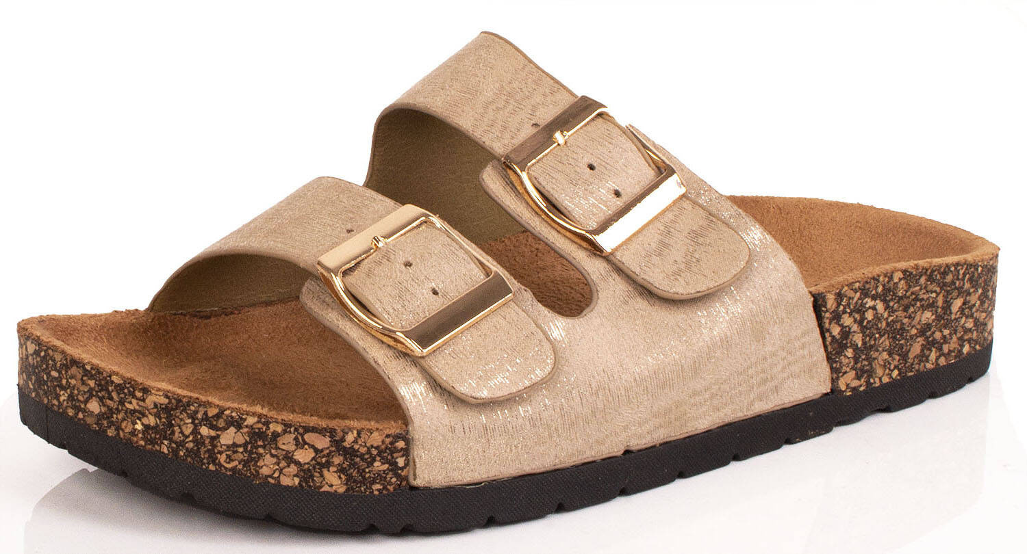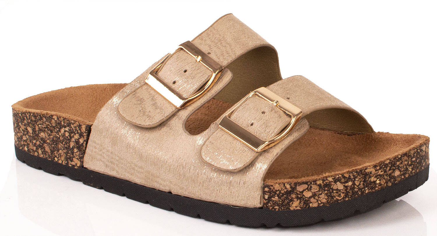 DAMSKIE WSUWANE ZŁOTE KLAPKI NA KORKU Z KLAMRAMI NOLAN