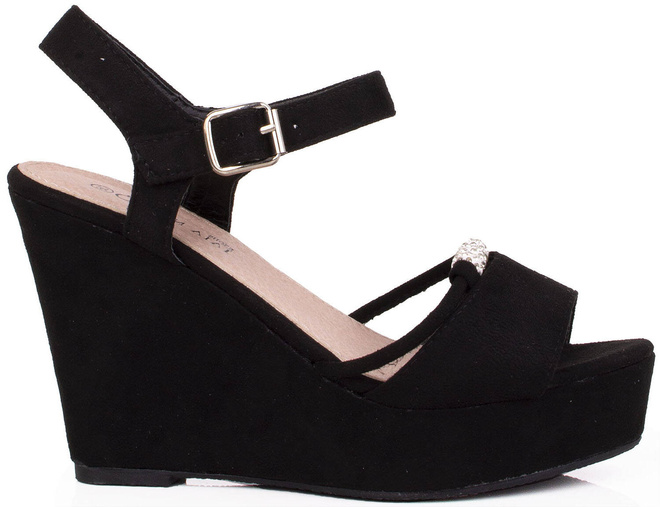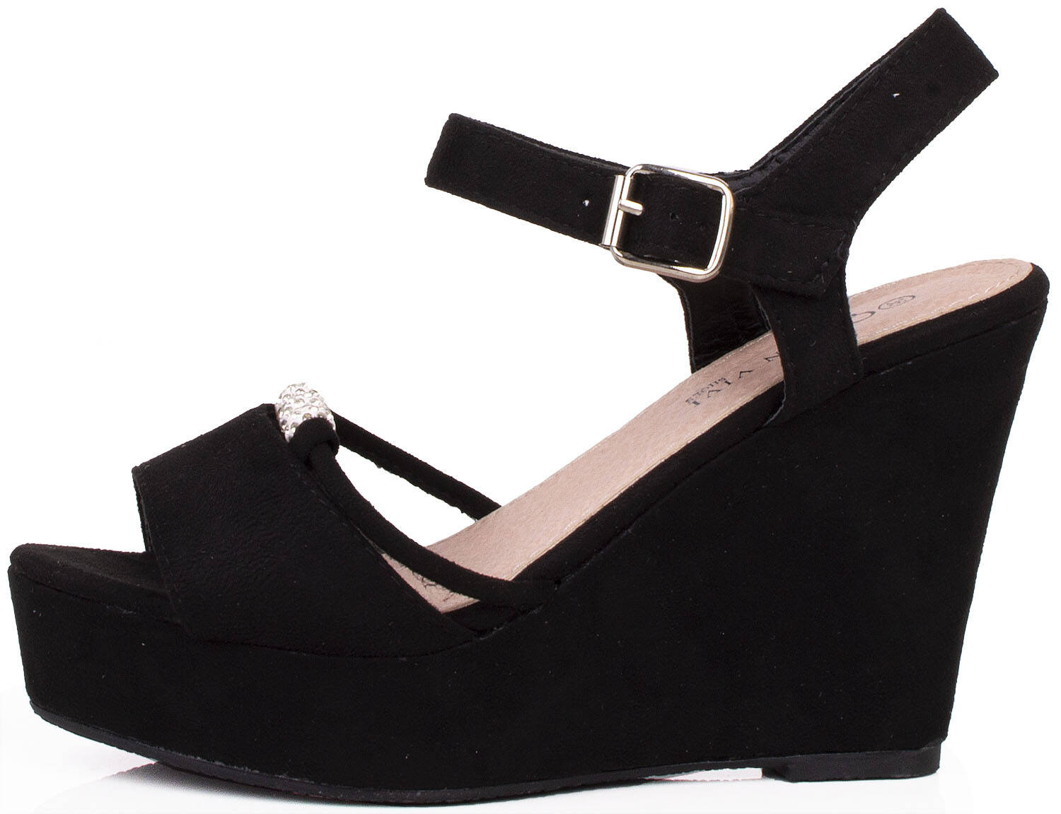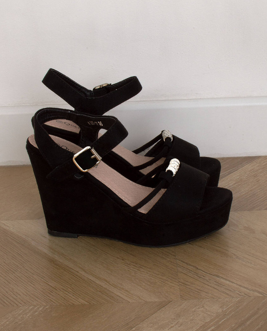 Czarne espadryle na koturnie to elegancka i wygodna propozycja obuwia na ciepłe dni. Wykonane z wysokiej jakości materiału, charakteryzują się miękkością i trwałością, zapewniając komfort noszenia przez cały dzień. Koturn o średniej wysokości dodaje kilku centymetrów wzrostu, jednocześnie oferując stabilność i wsparcie, co czyni te espadryle idealnym wyborem dla osób, które chcą wyglądać stylowo, nie rezygnując z wygody. Te eleganckie czarne sandały na koturnie łączą w sobie styl i komfort, stanowiąc doskonały wybór na letnie dni. Dzięki swojej uniwersalności, idealnie sprawdzą się zarówno na co dzień, jak i na bardziej formalne okazje.